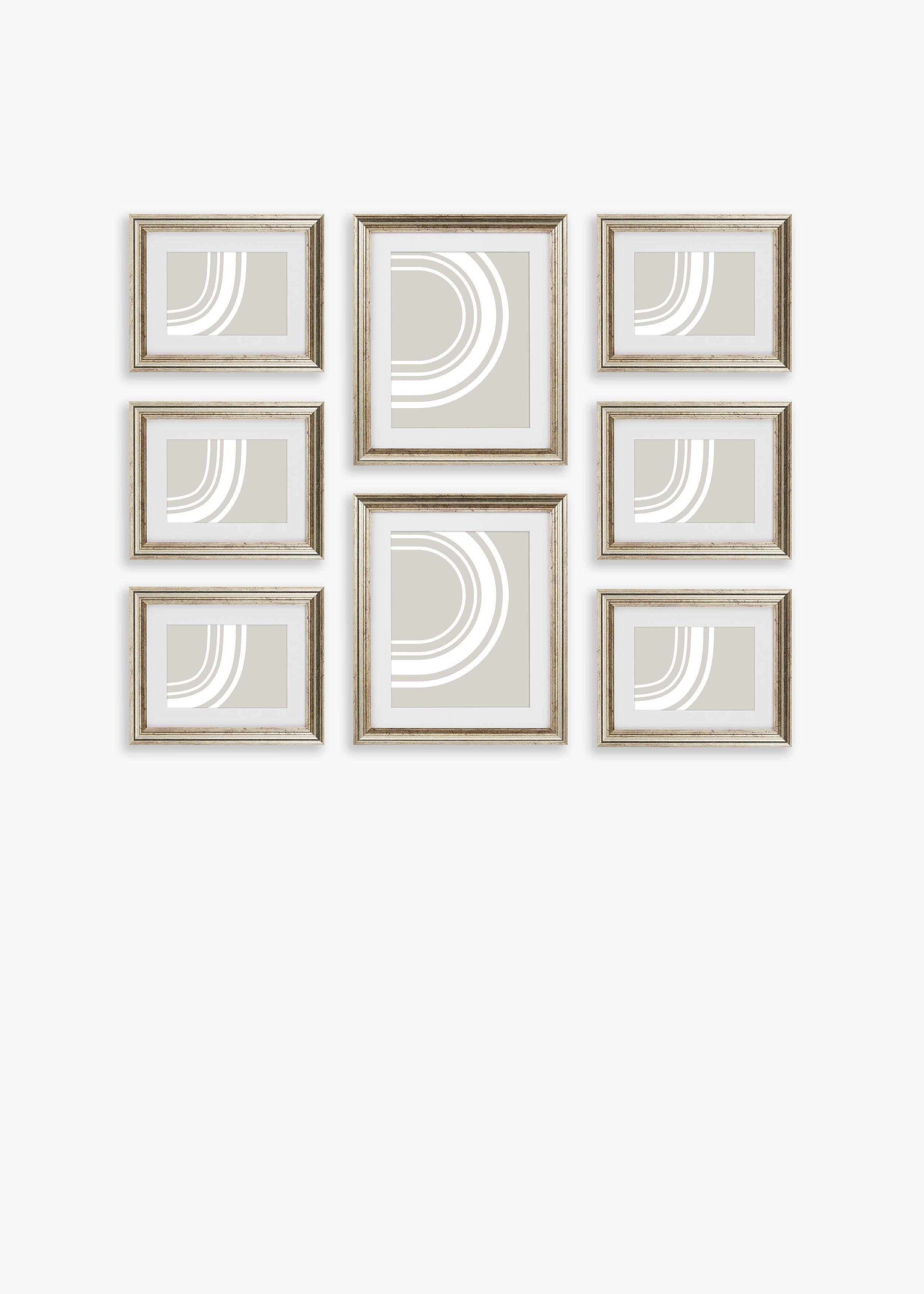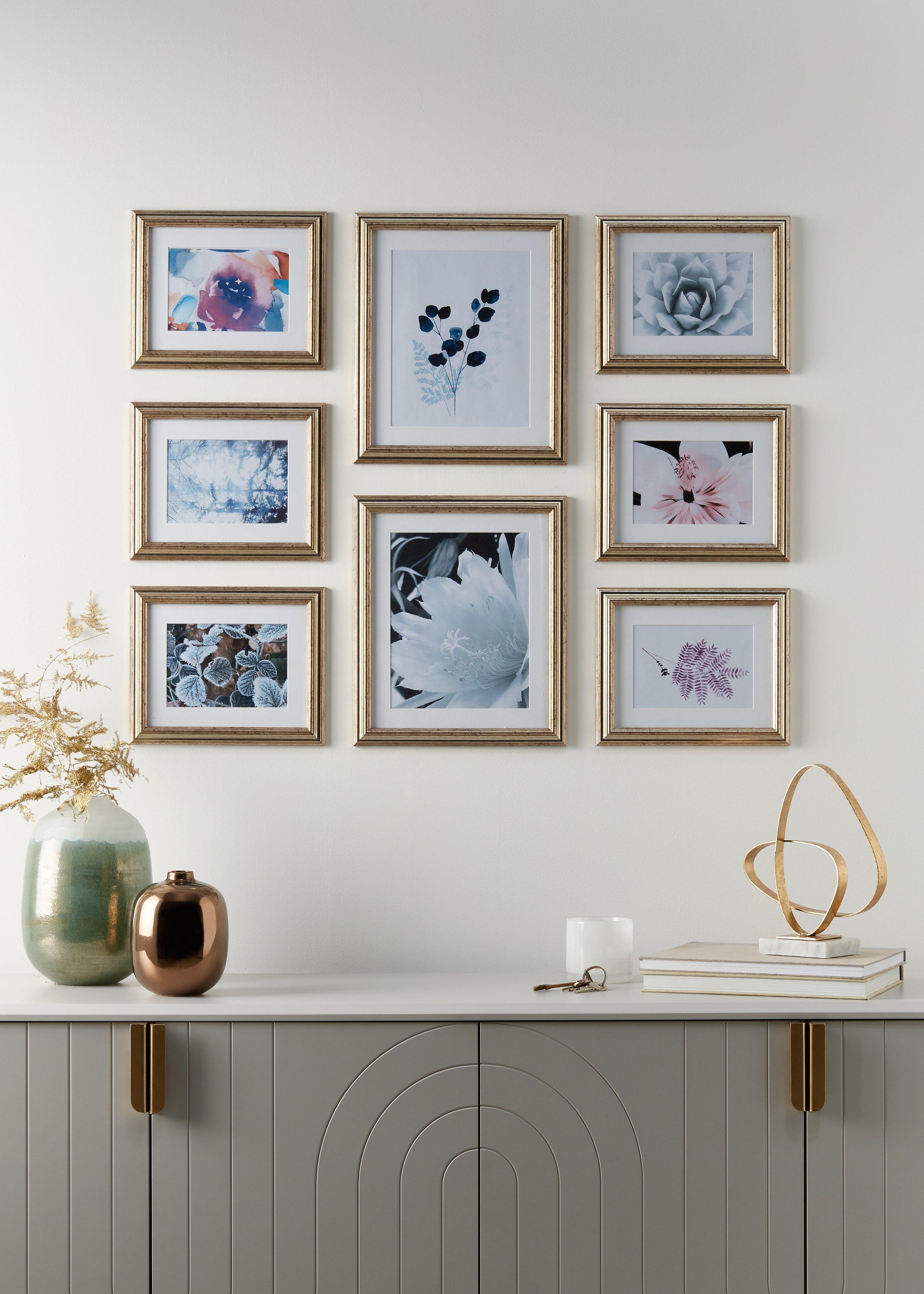 Create a gallery wall of photos with this set of eight photo frames, all with matching antique metallic-effect finishes. Ideal for displaying similarly themed images together, they come with window mounts. Each frame is light in weight and easy to wall mount, horizontally or vertically.