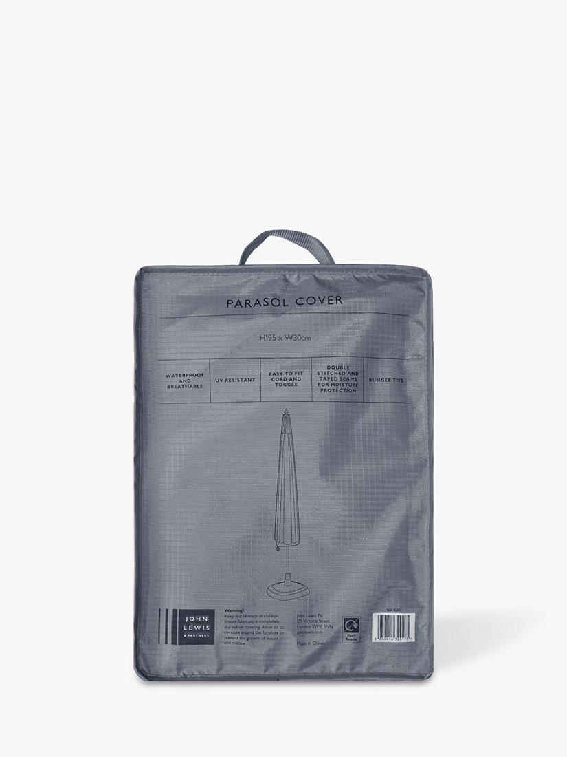 Protective cover for John Lewis standard garden parasols. Waterproof with taped seams for better protection, yet breathable with built-in ventilation to prevent mildew. The cover comes with a cord toggle and bungee ties for an easy, secure fit. Made from strong 420D polyester with UV30+ sun protection for all-year-round use.