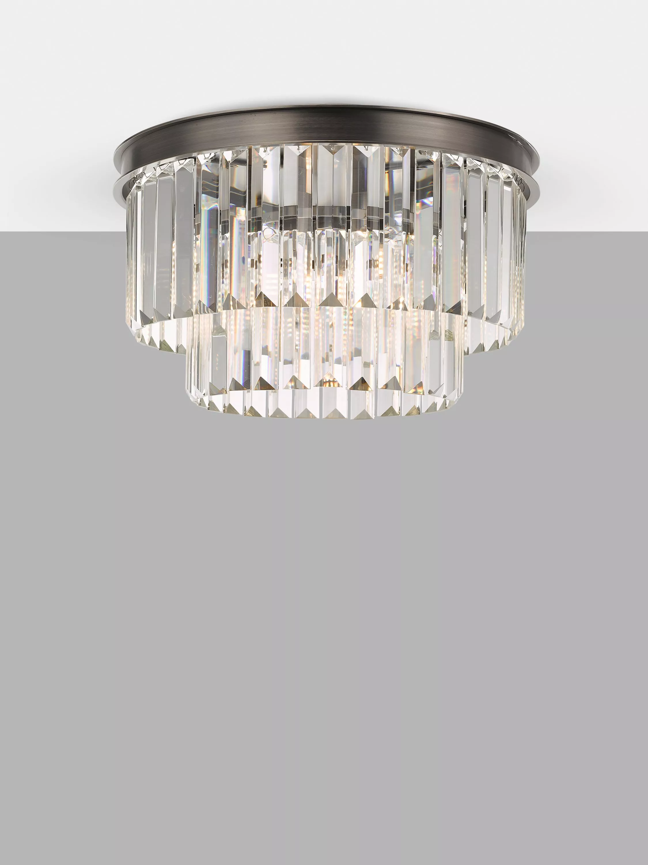 A beautifully crafted statement tiered semi flush ceiling light with cut glass crystals suspended from a contrasting aged pewter metal frame. This luxurious light will create a stunning focal point to your interior and is ideal for low ceilings.