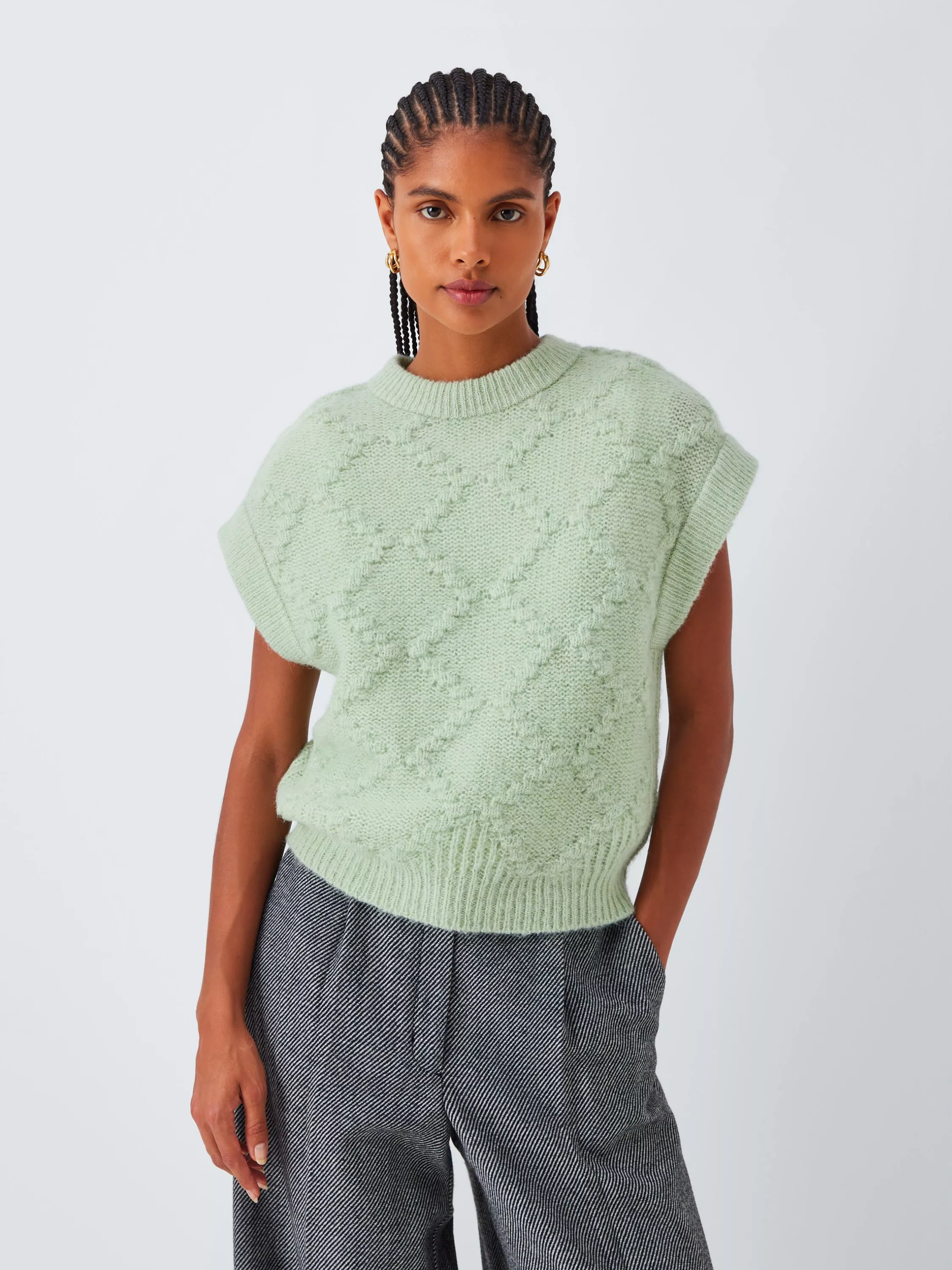 Argyle-inspired sleeveless knit with a textured pattern and ribbed trims. Made of naturally temperature-regulating lambswool for comfort and a soft feel.