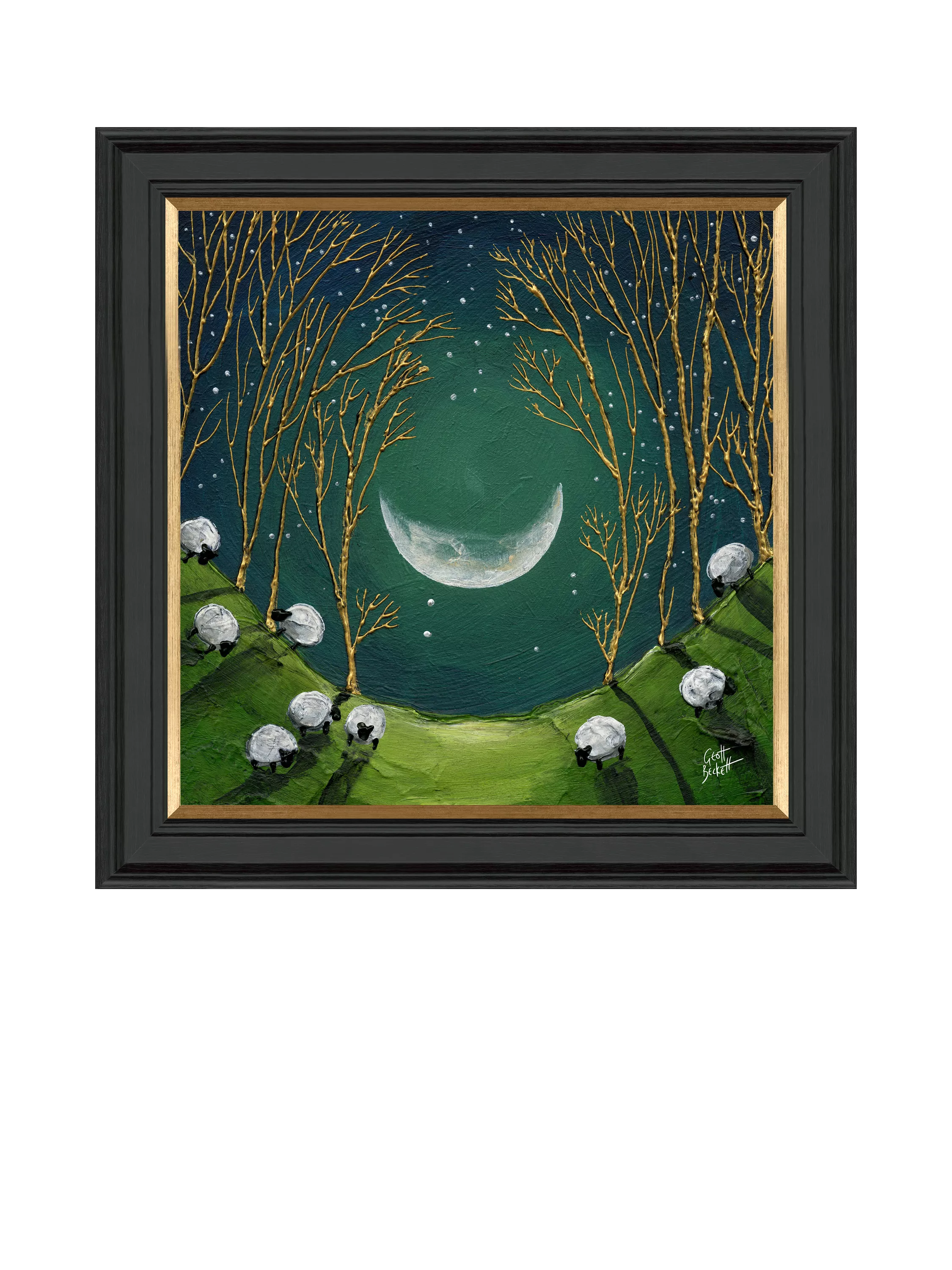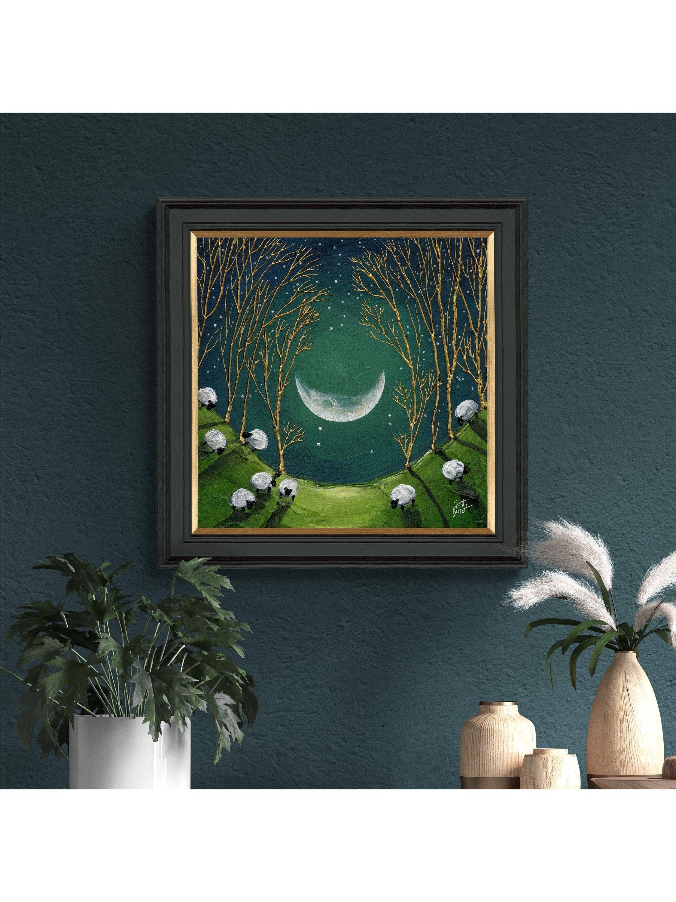 A quirky landscape, 'Raincatcher' by artist Geoff Beckett. Made in the UK, it's finished with a hand-applied artist's texture gel and presented in a black frame with a gold insert, ready to hang on your wall.
