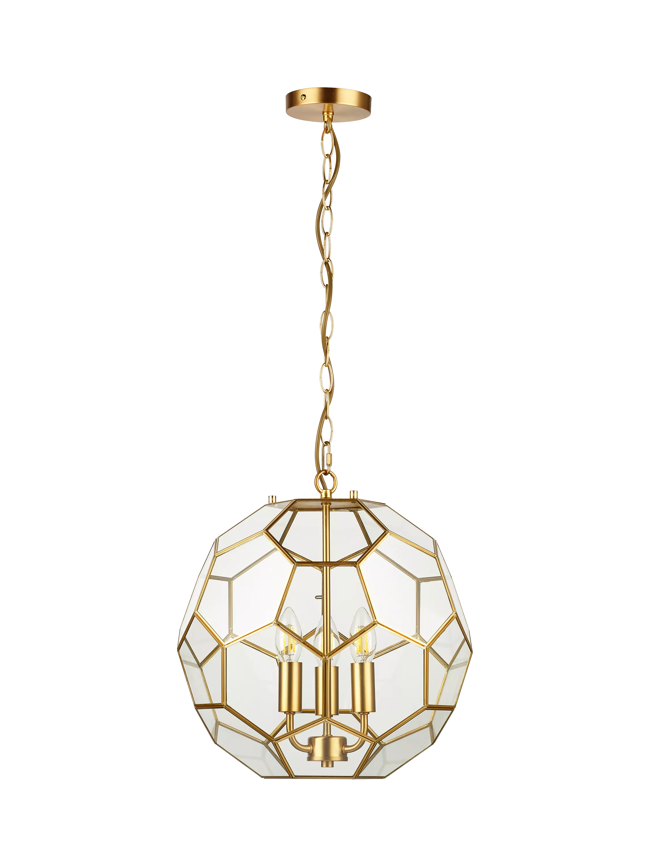 Make a bold statement with this stunning geometric glass pendant. Featuring a striking design with a gold-toned metal frame and clear glass panels, this eye-catching fixture beautifully combines contemporary style with timeless elegance. The open structure allows ample light to shine through, making it ideal for dining rooms, living spaces, entryways or high-ceiling areas.