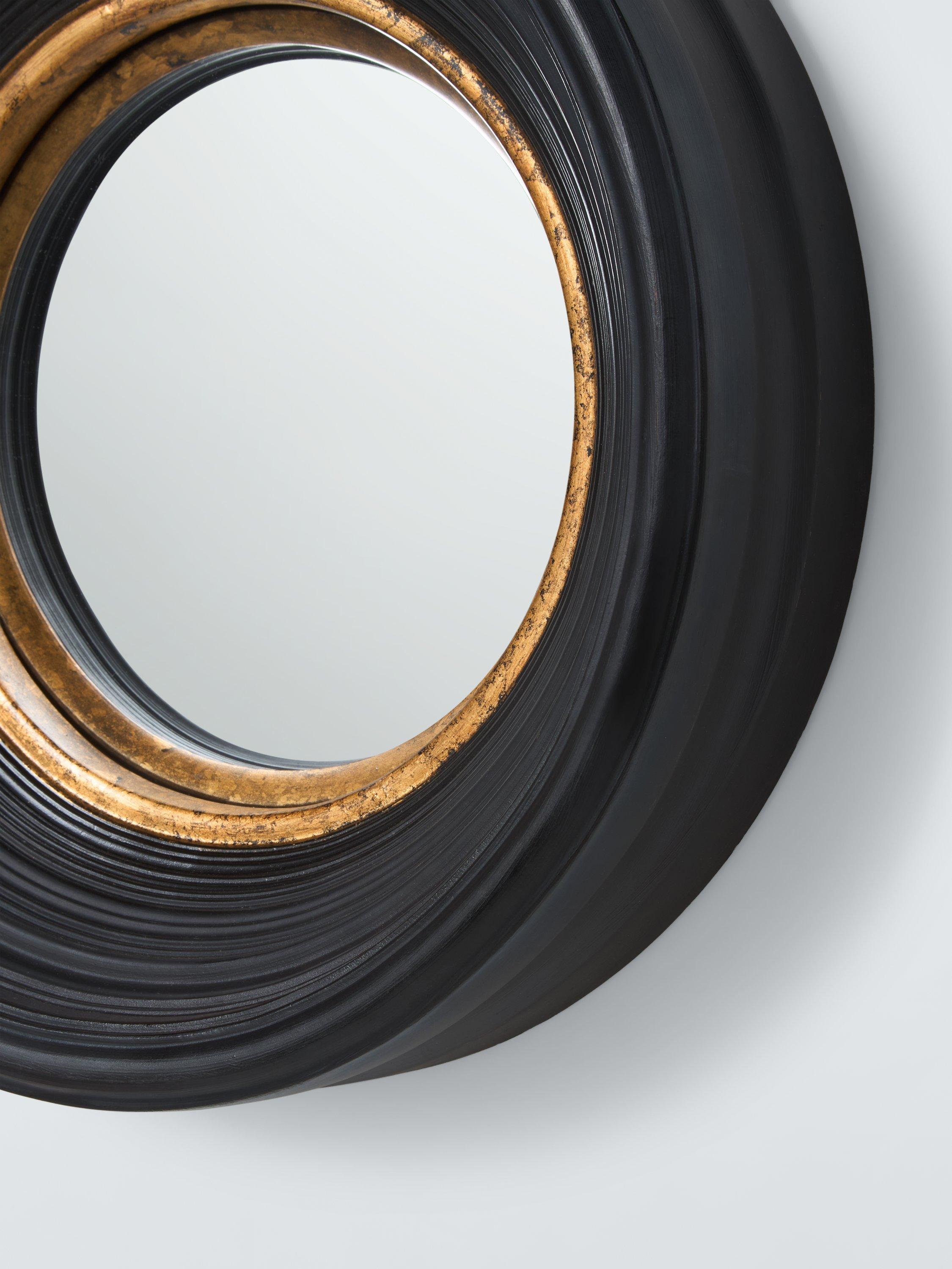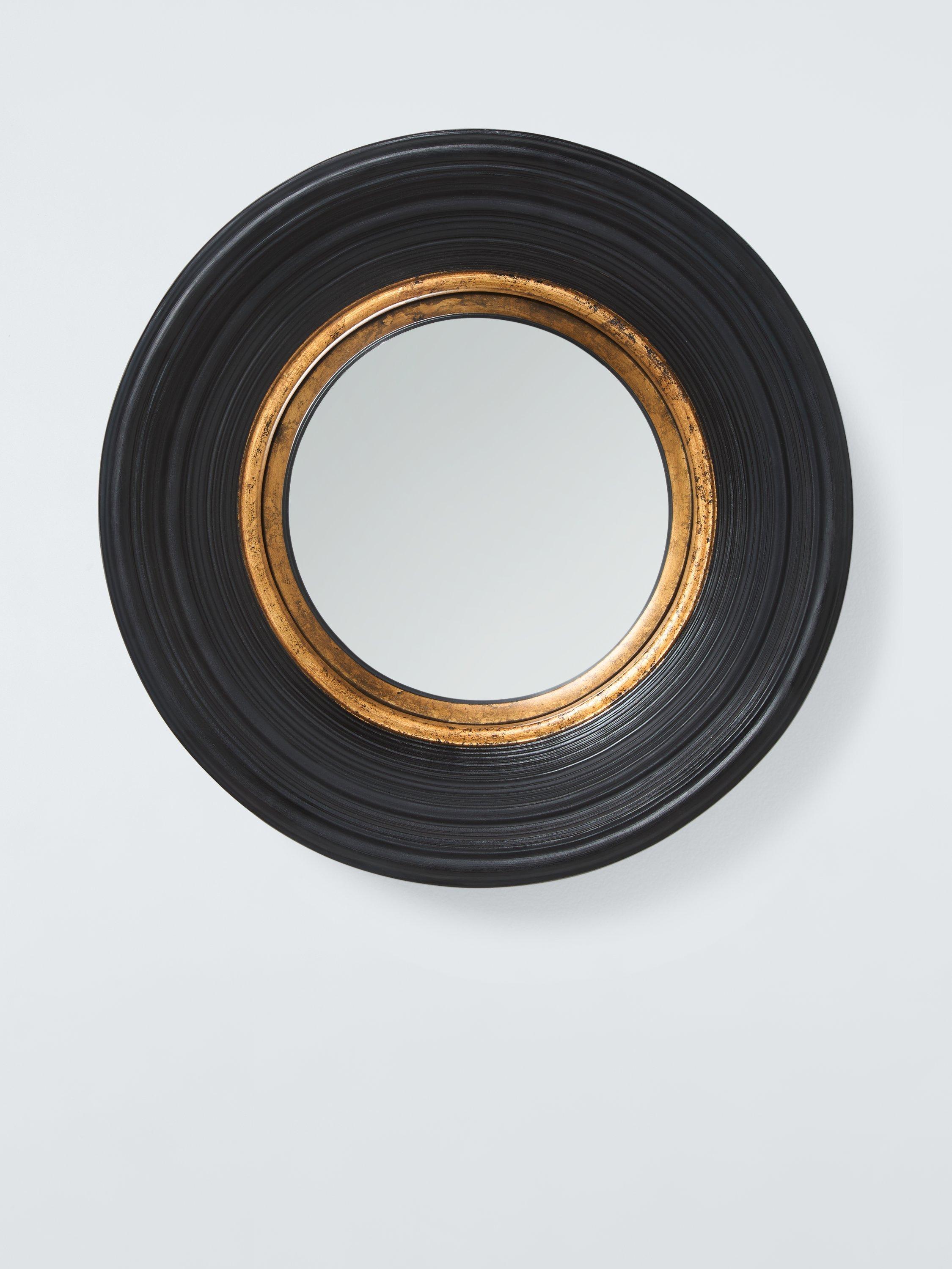 A traditional Georgian-style round mirror with convex glass, handmade with a moulded frame. Hand-applied gold leaf on the inner frame adds an antiqued look. Wall-mount this mirror using the D-ring fitting on the reverse side.