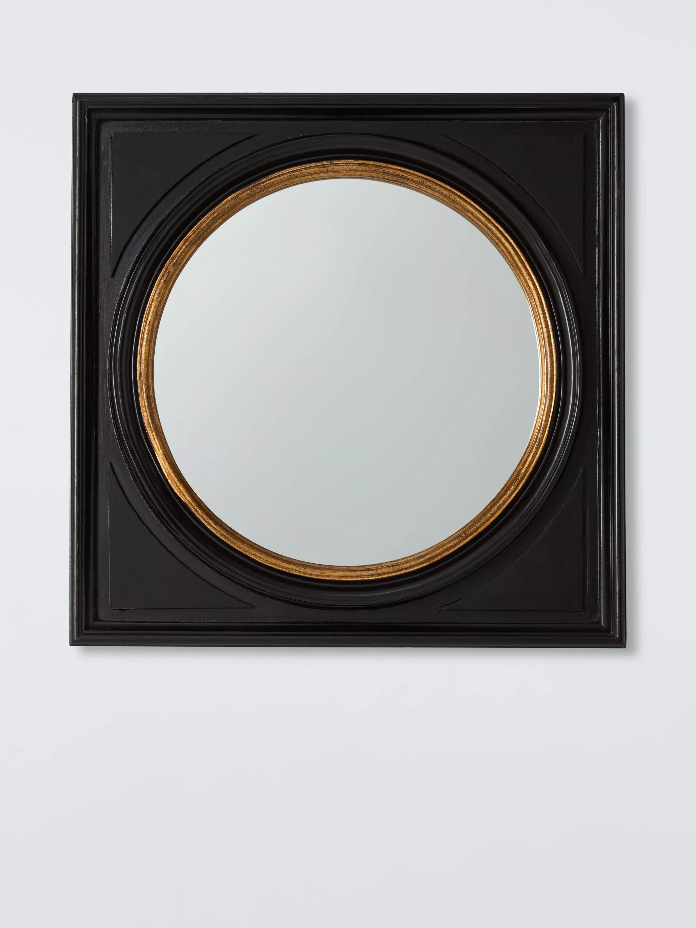 A traditional Georgian-style round mirror set within a square wooden wall panel. Hand-applied gold-toned detail on the inner frame adds an antiqued look. Wall-mount this mirror using the D-ring fittings on the reverse side.