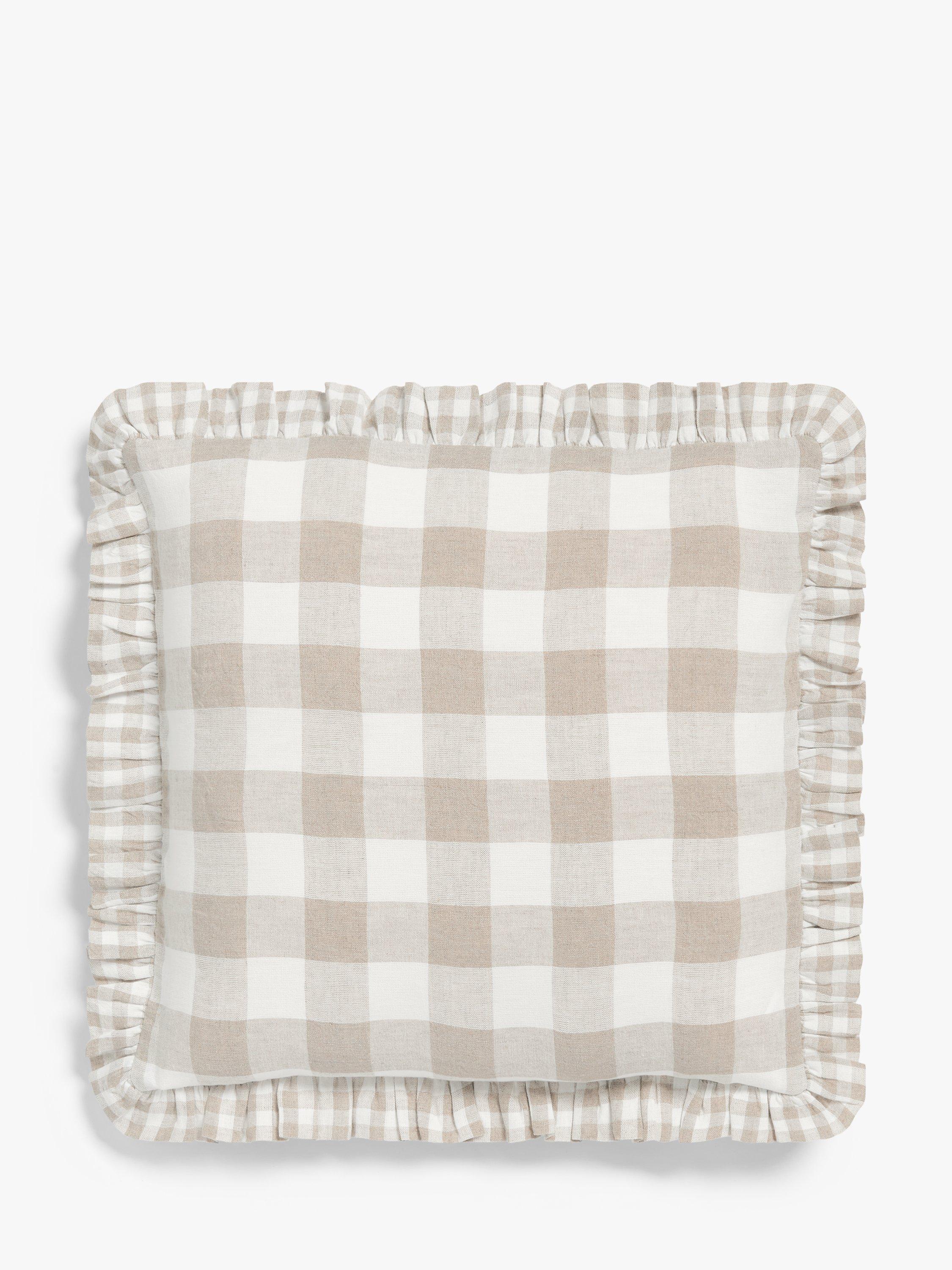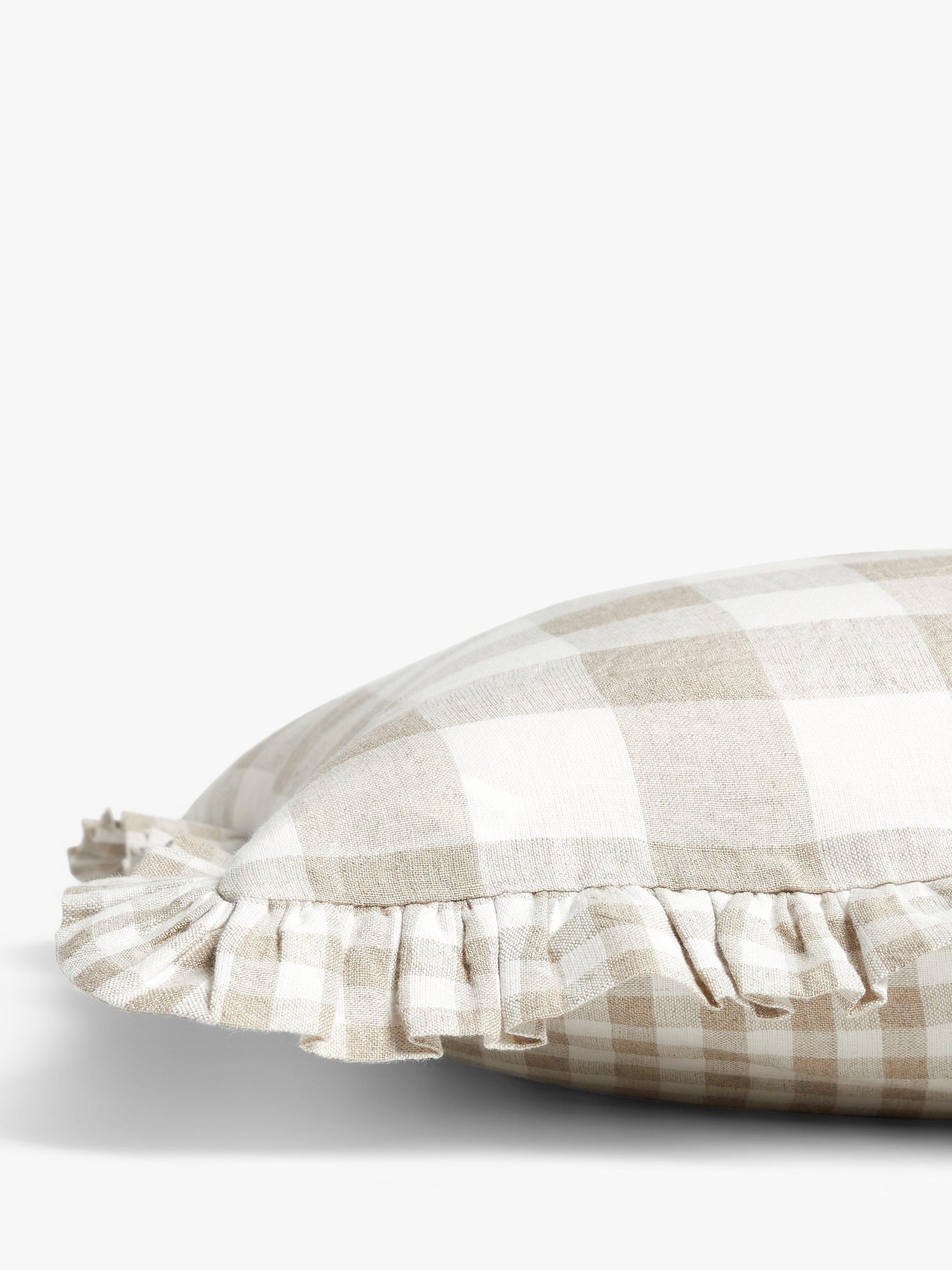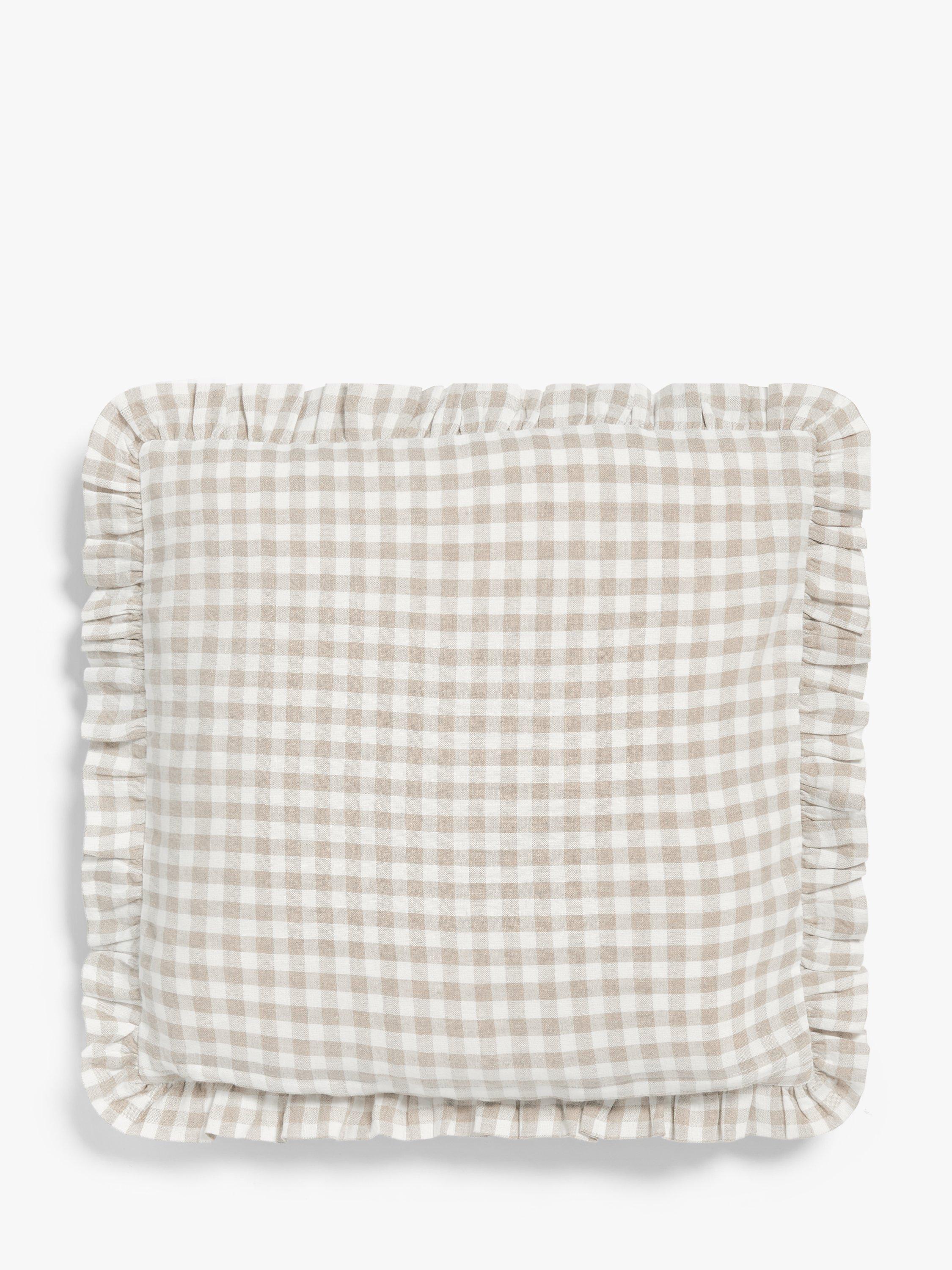 A cheerfully checked gingham cushion with a matching frill. It's machine washable for convenience.