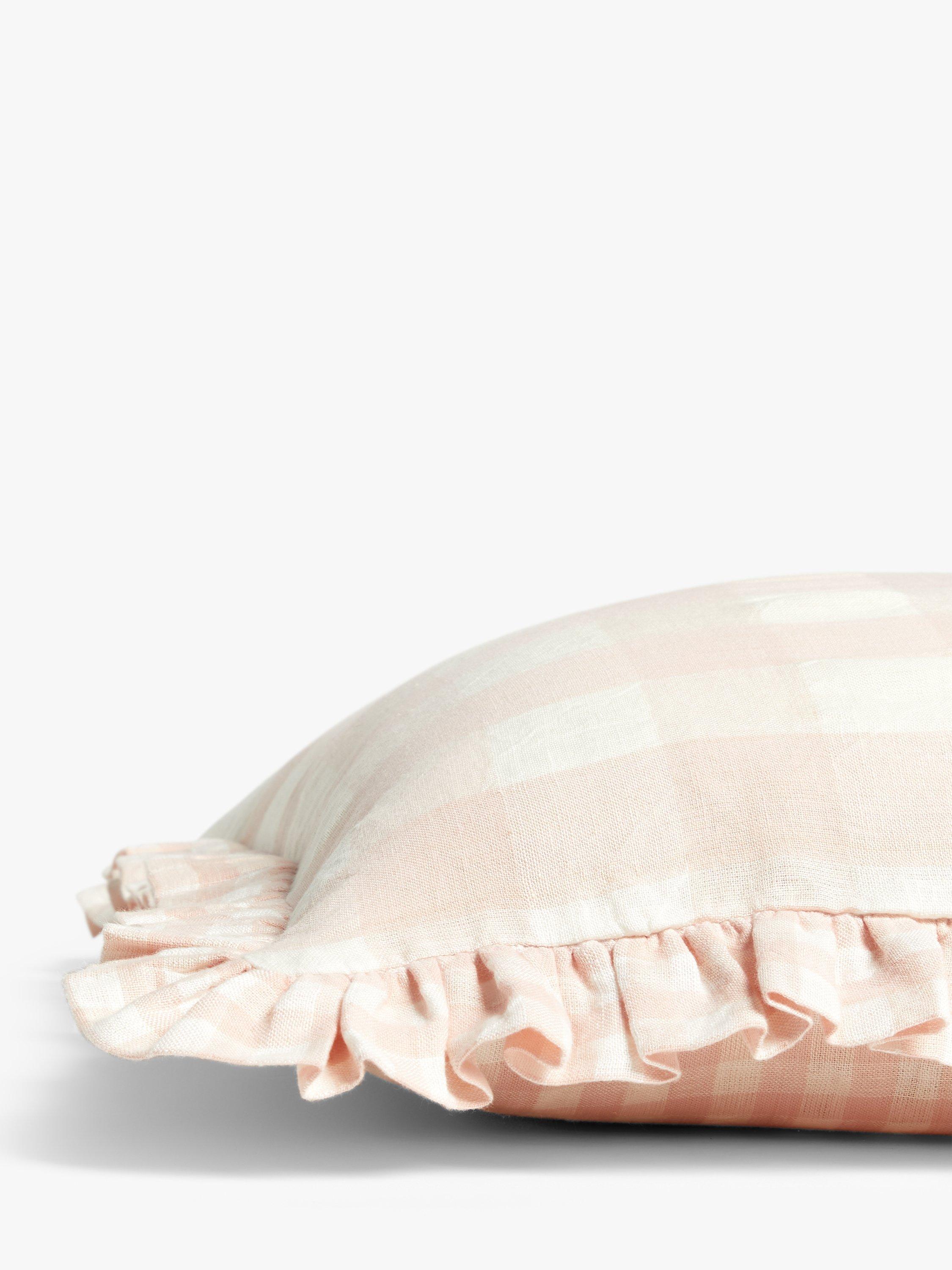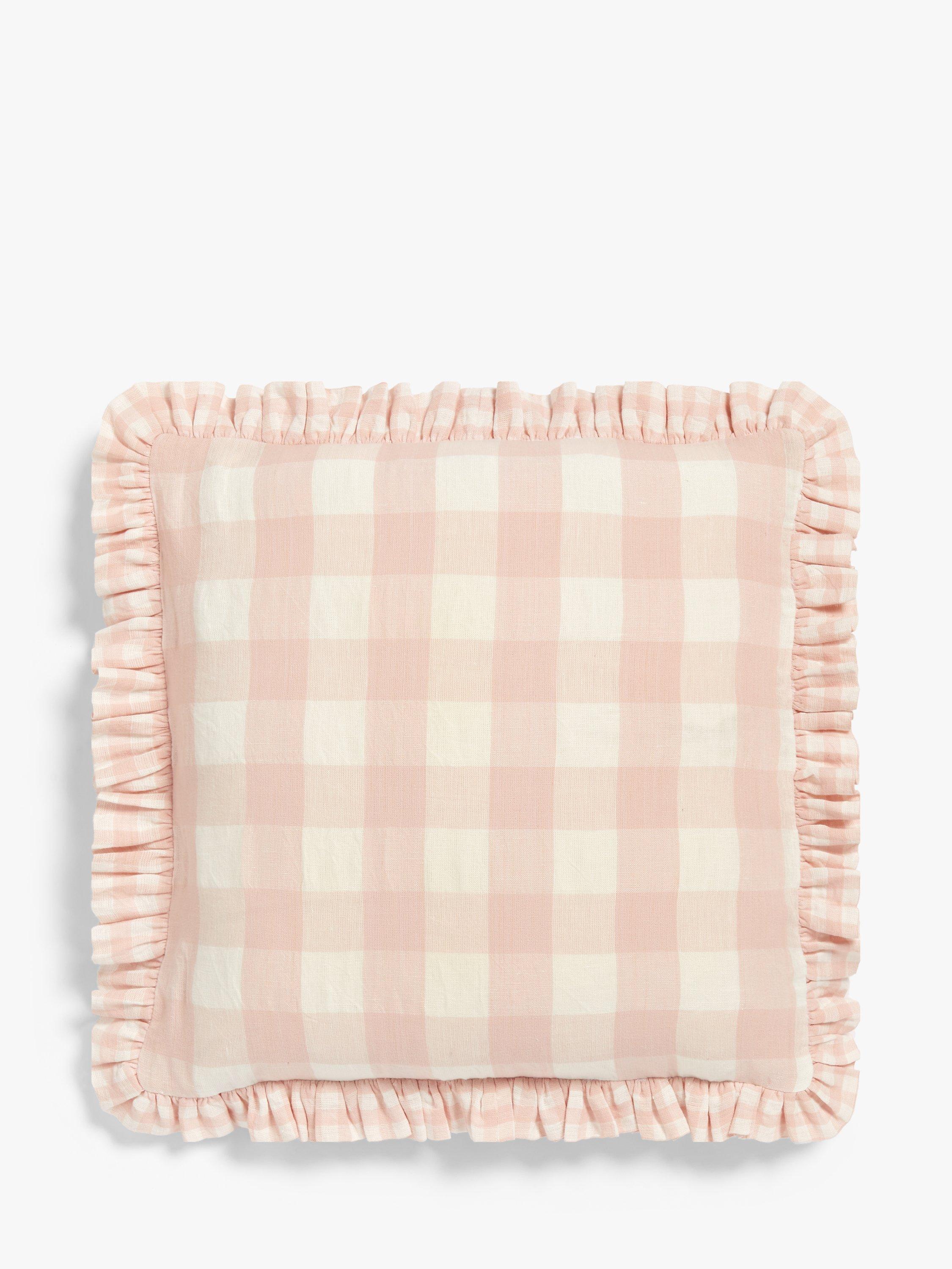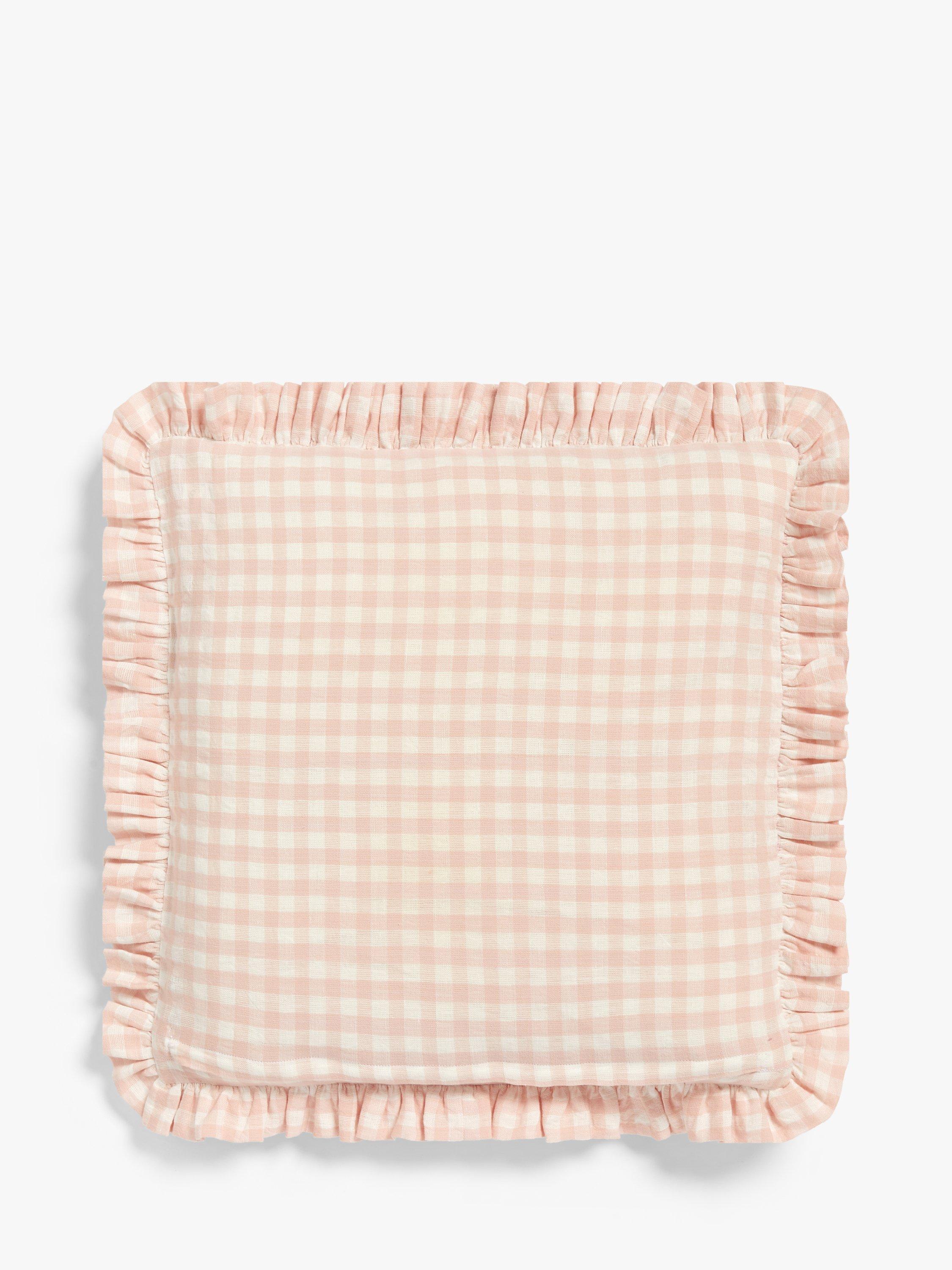 A cheerfully checked gingham cushion with a matching frill. It's machine washable for convenience.