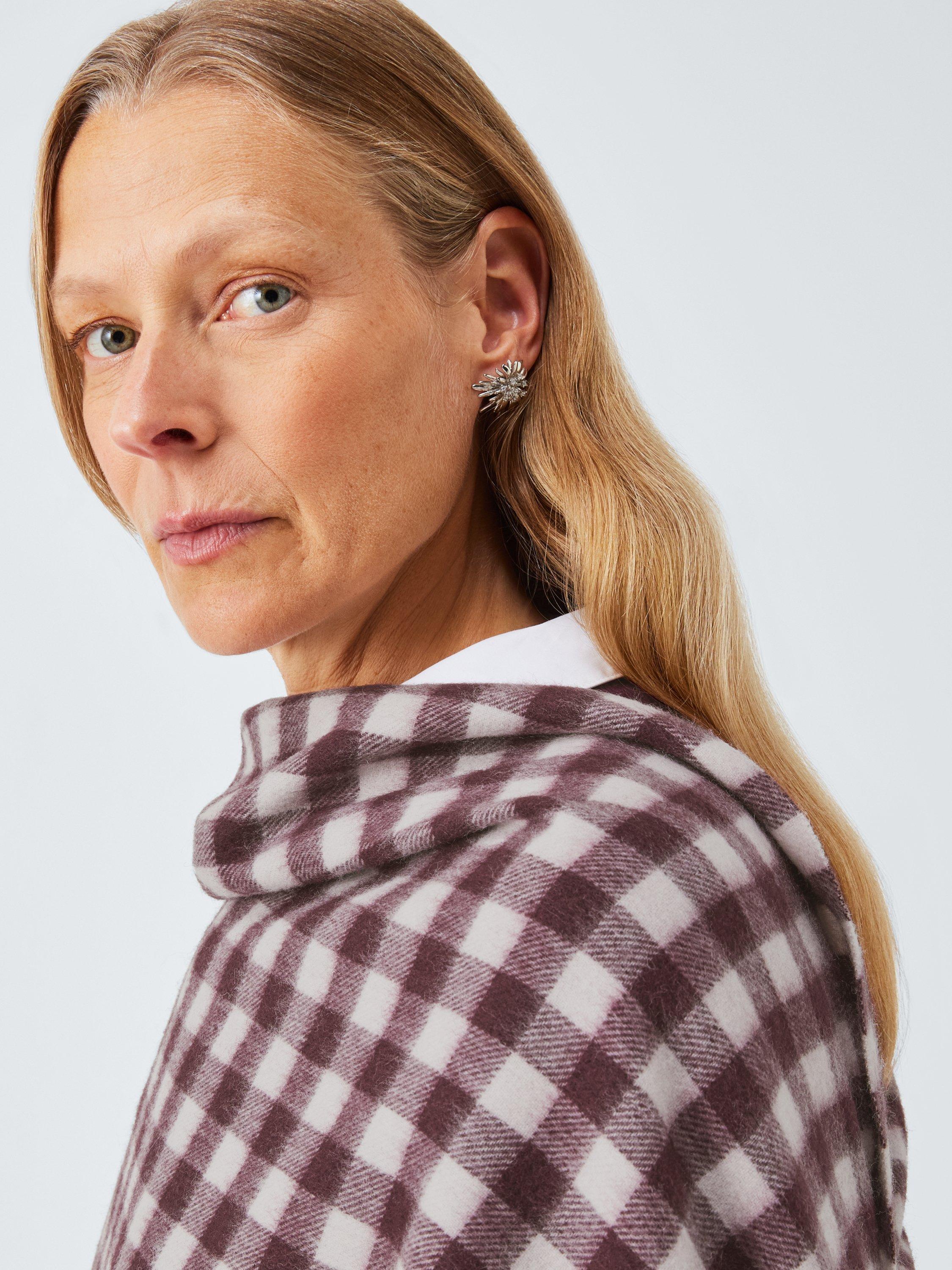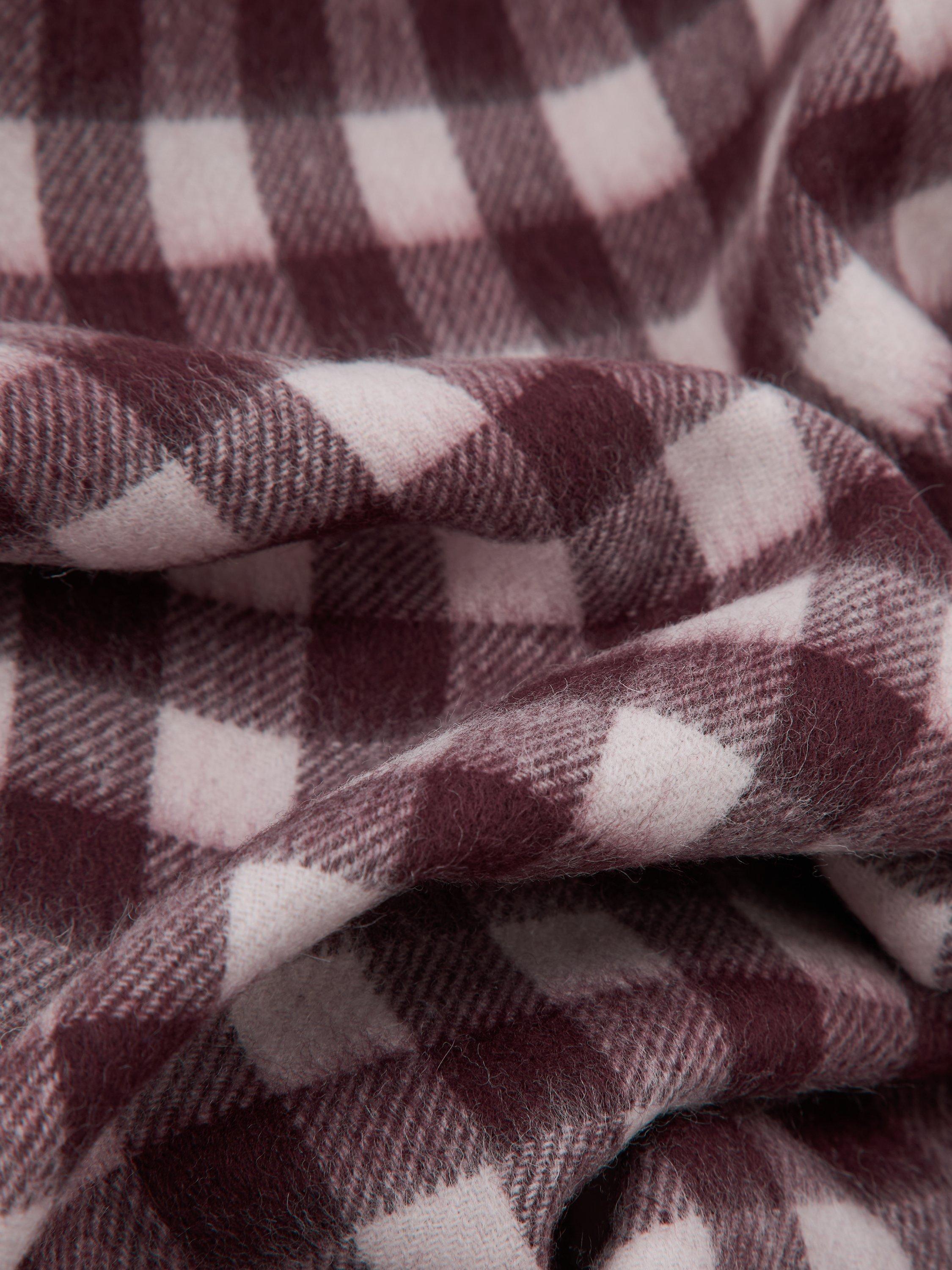 A fringed blanket scarf, made from 100% wool and with a gingham check pattern.
