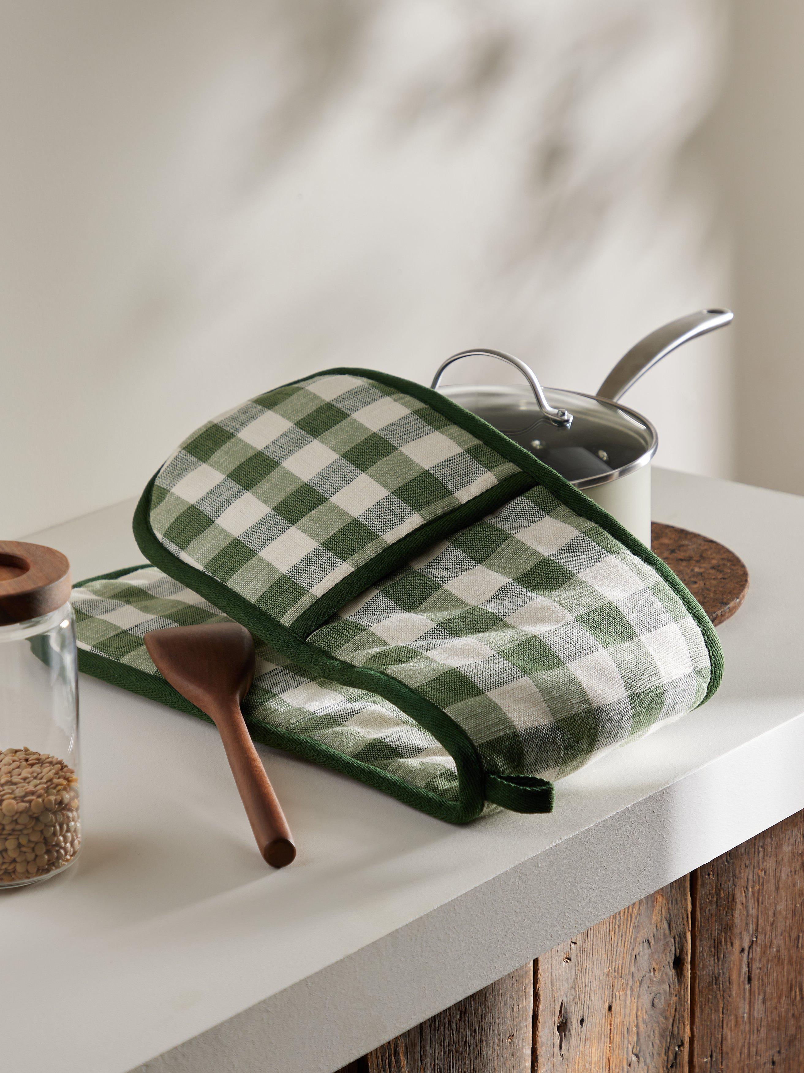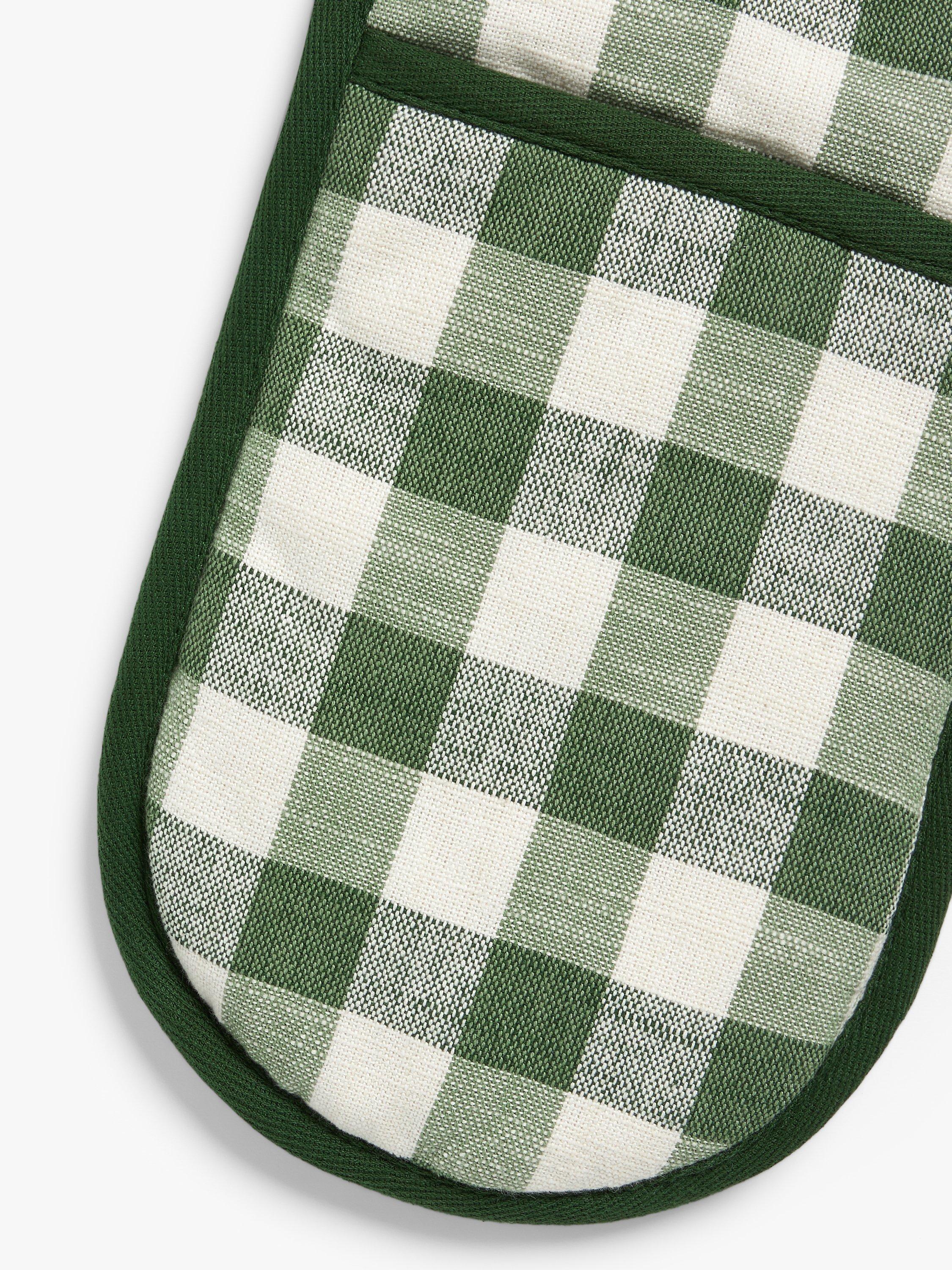 Classic gingham pattern double oven gloves, made from pure cotton with an insulating polyester filling. Durable, comfortable and machine washable, they coordinate with the matching set of tea towels and kitchen apron in our Gingham pattern.