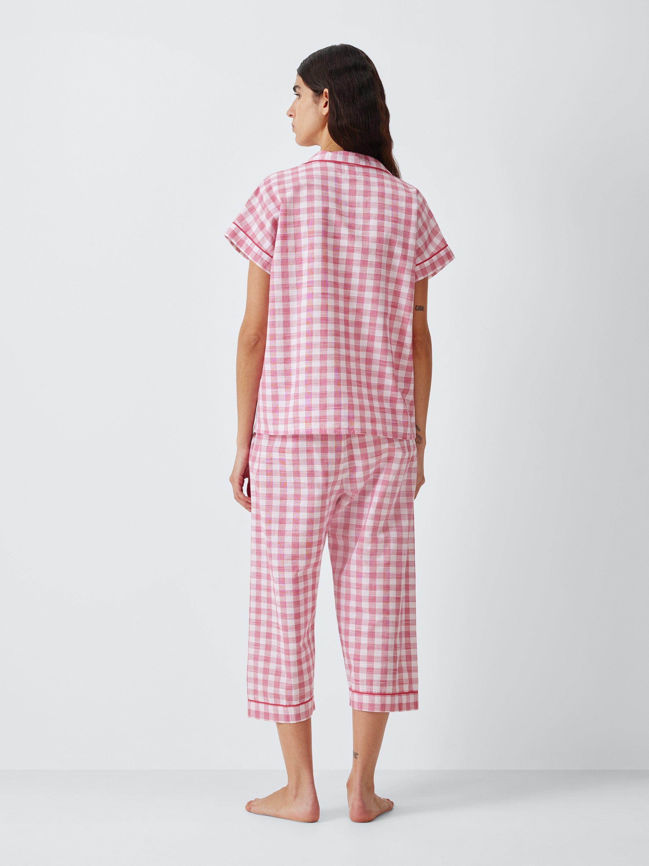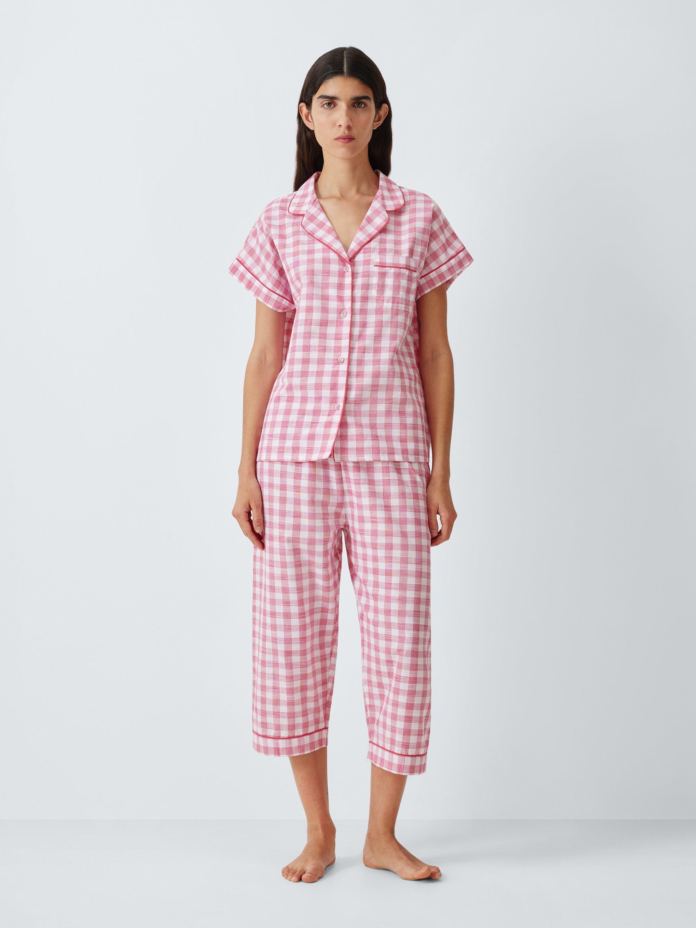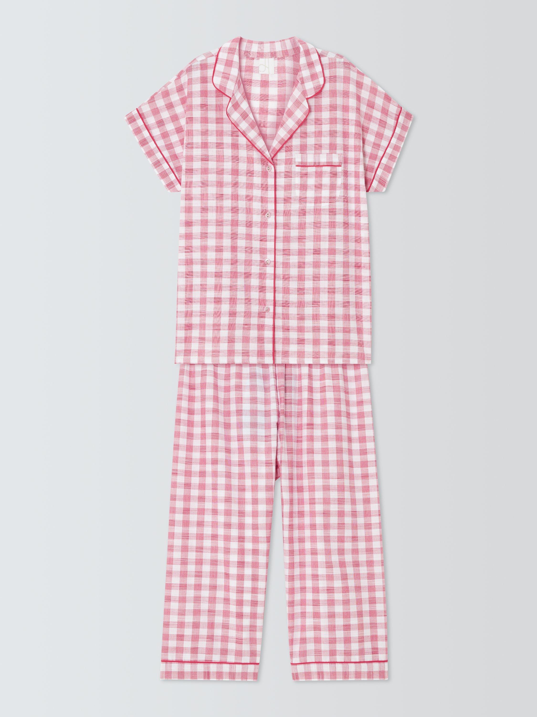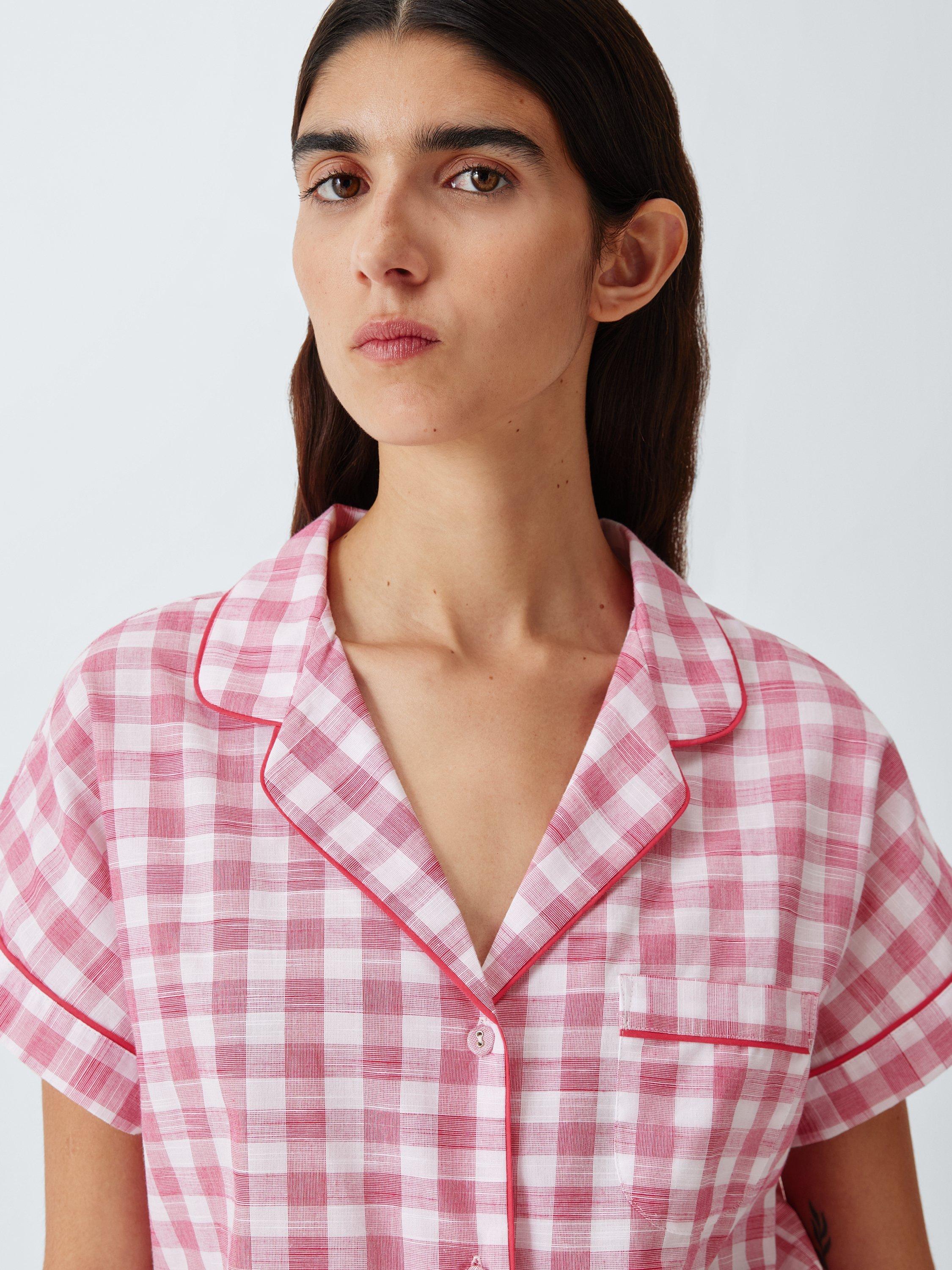 A traditional, pure cotton pyjama set with all-over gingham print. The shirt has a relaxed, revere collar, grown on sleeves, and a chest pocket. The bottoms benefit from a fully elasticated waistband. Contrast piping throughout adds to the smart feel.