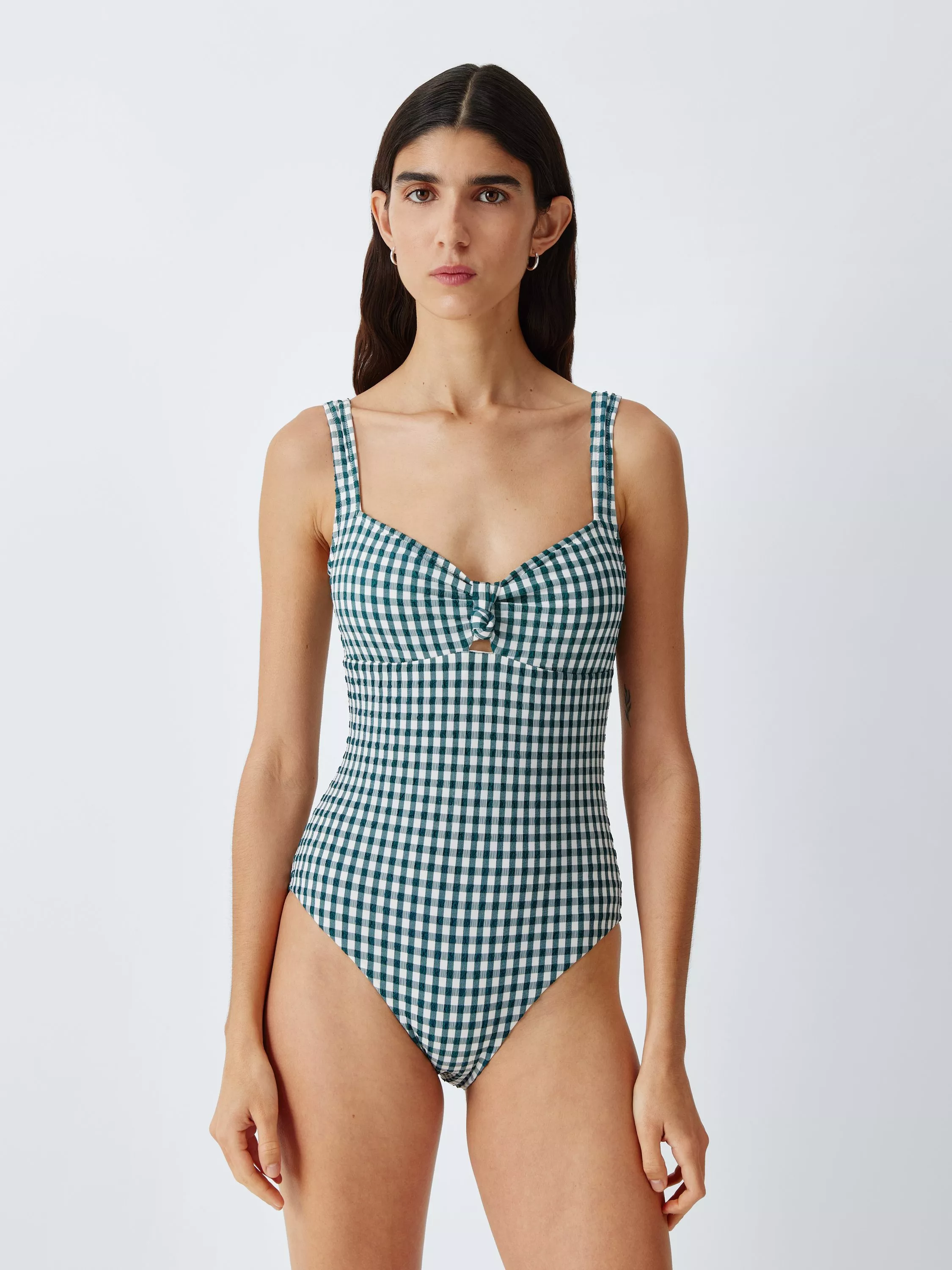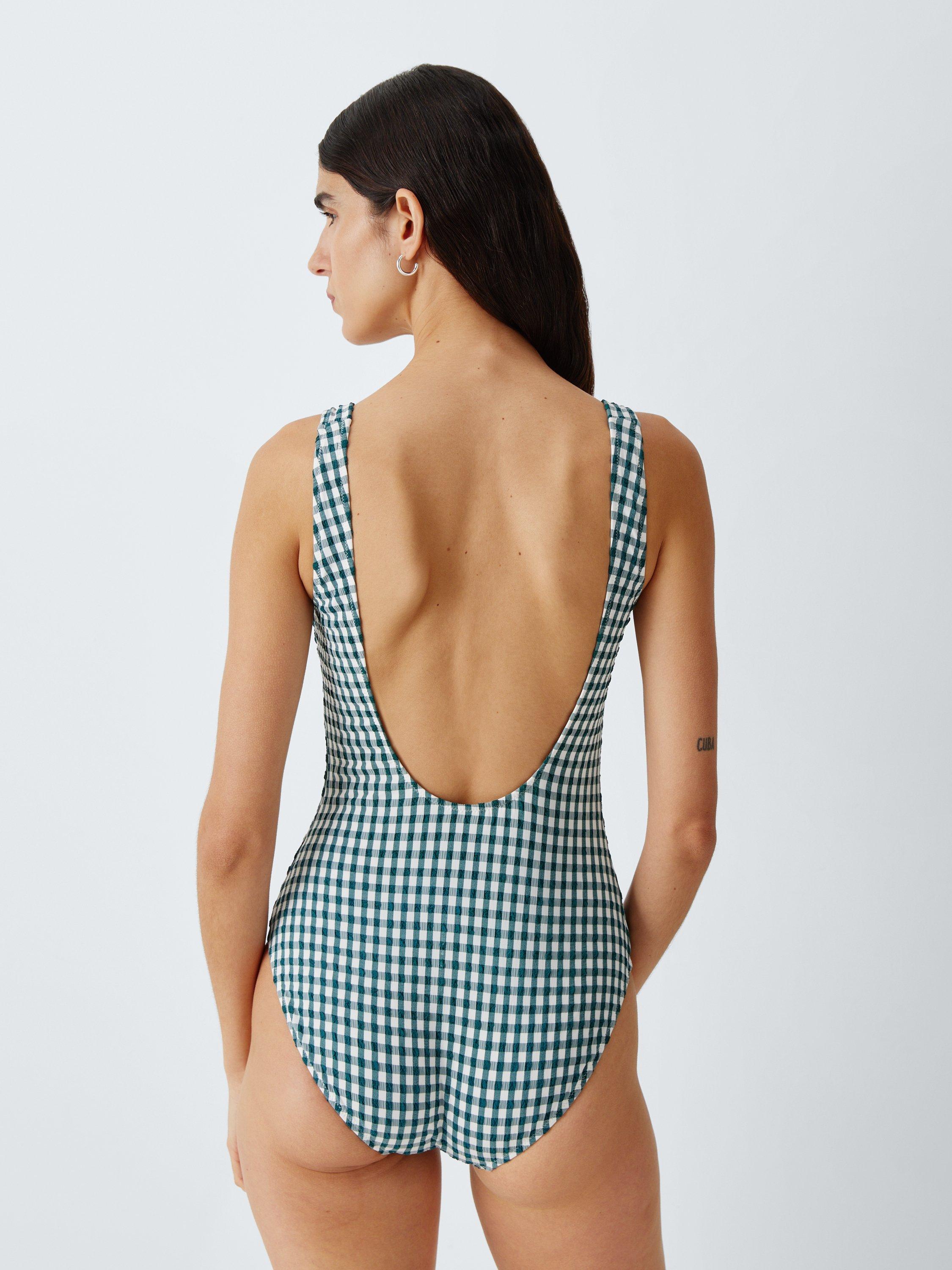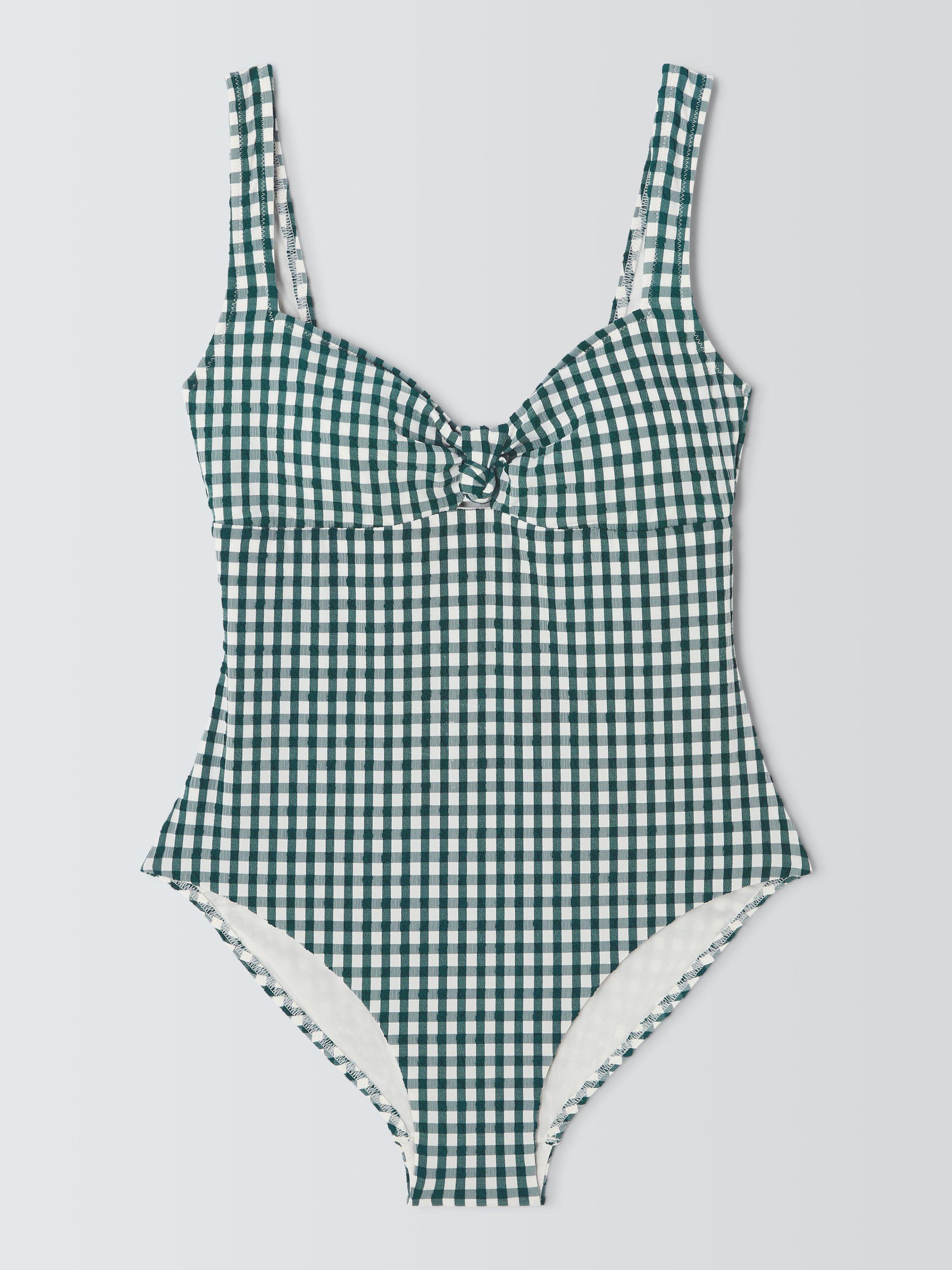 In a timeless gingham, this fully lined swimsuit has a knotted bust detail and subtle cutout that bring playful touches to an otherwise classic look.