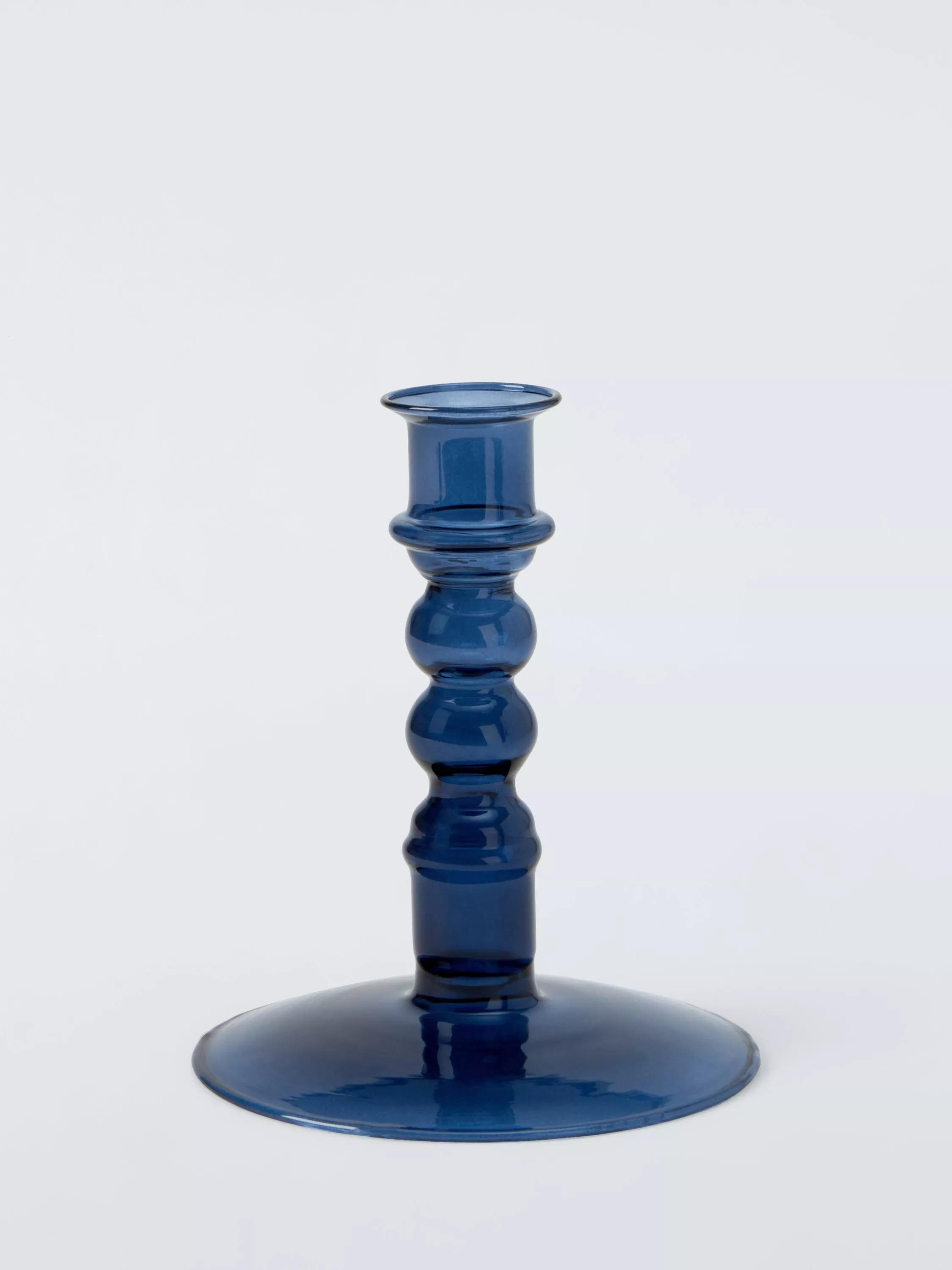 A candlestick holder in a charming glass, bobbin design.
