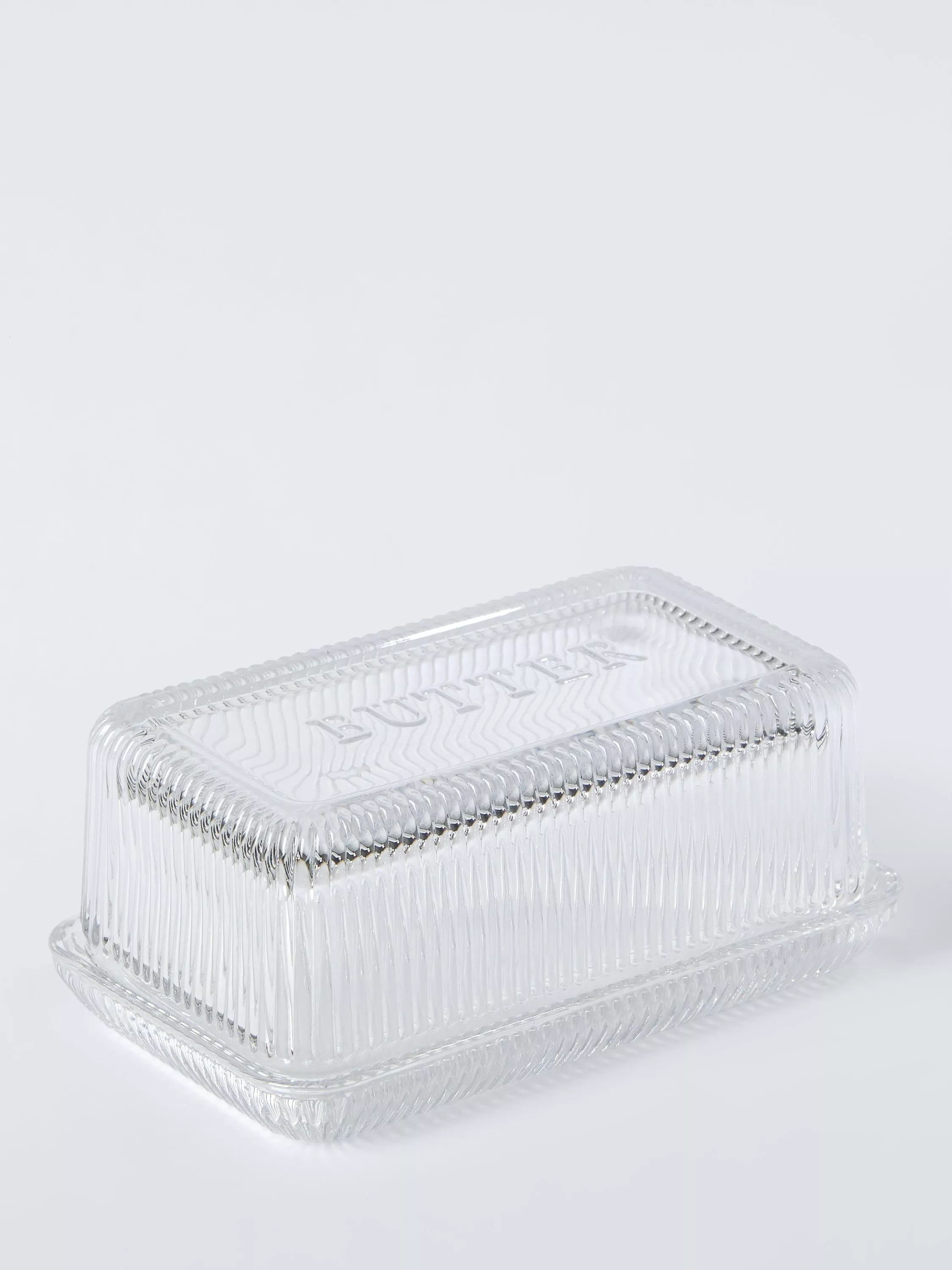 Butter dish with the matching lid and stand made of vintage-inspired ribbed glass. Dishwasher-safe for easy cleaning.
