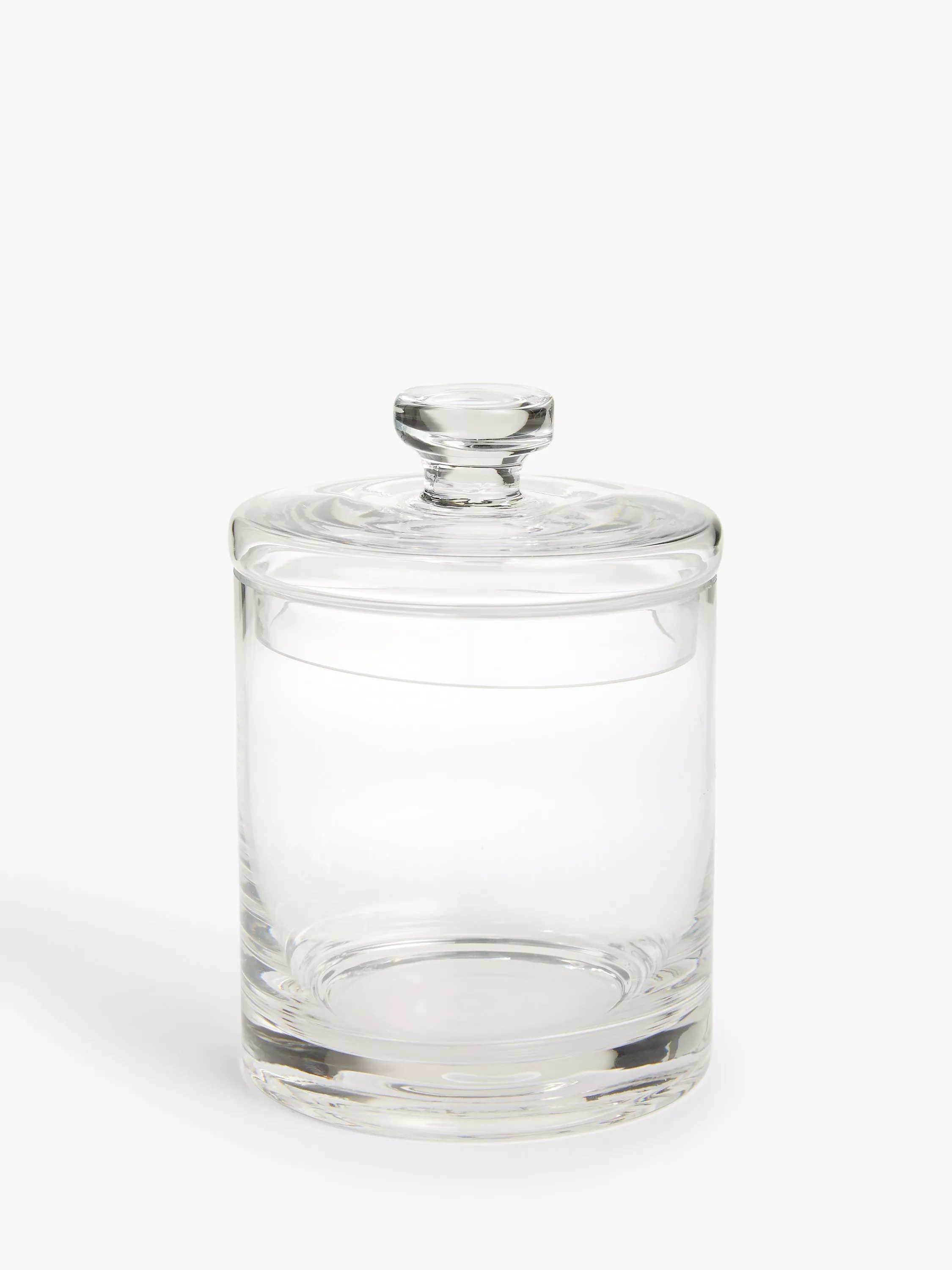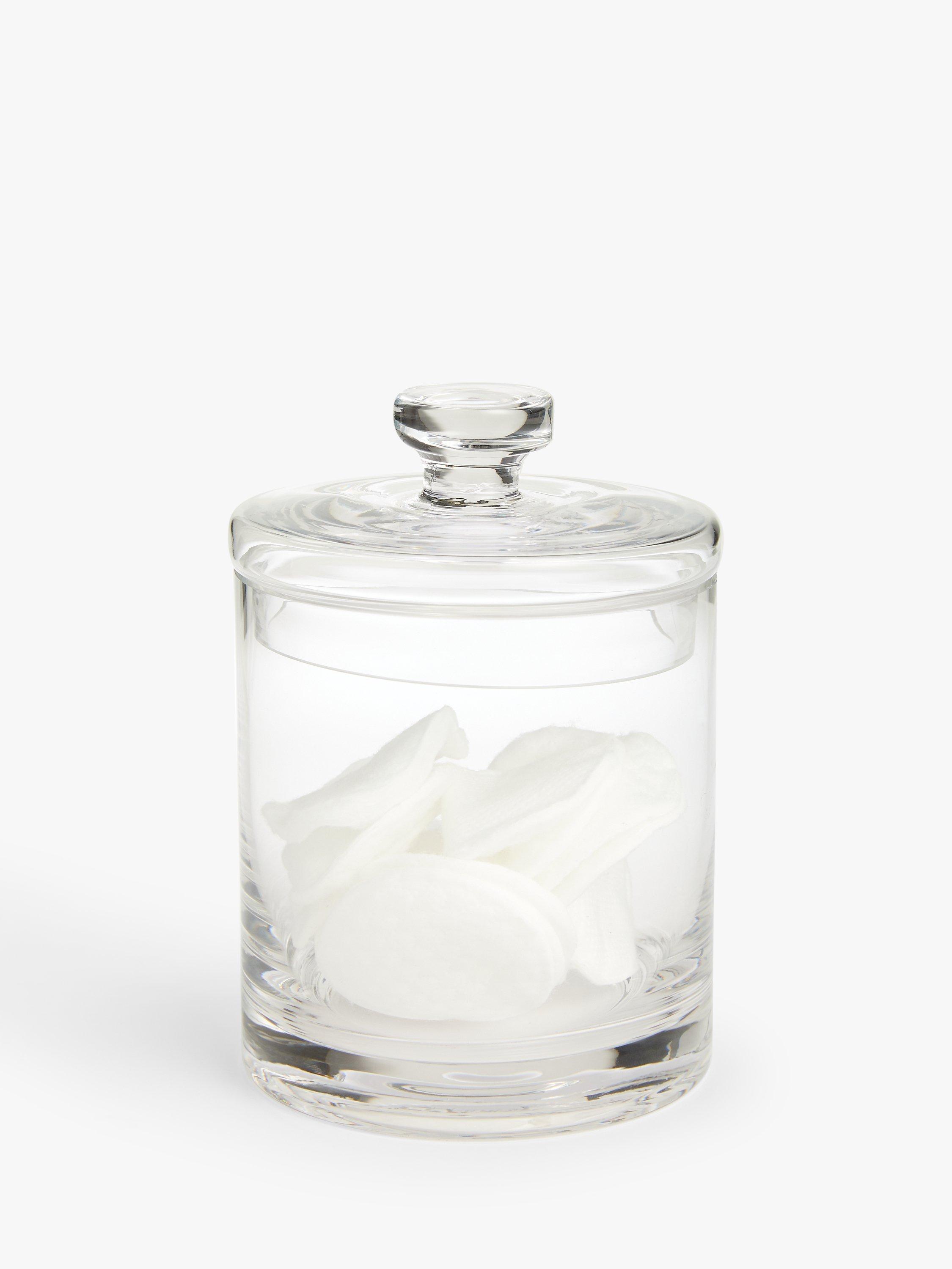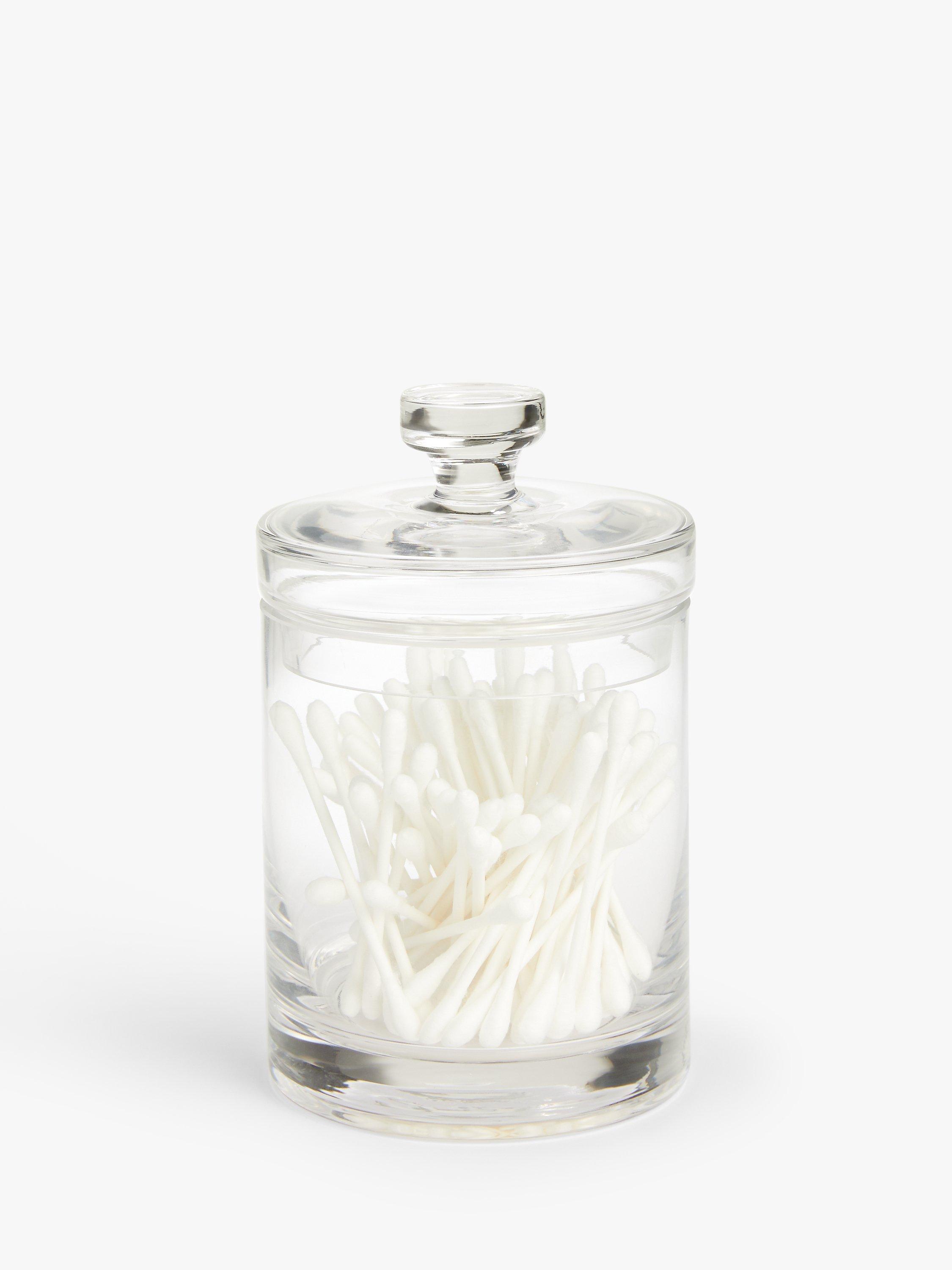 A simple glass jar, ideal for cotton buds, cotton pads, hair ties and other small items that might otherwise clutter your bathroom or dressing table.
