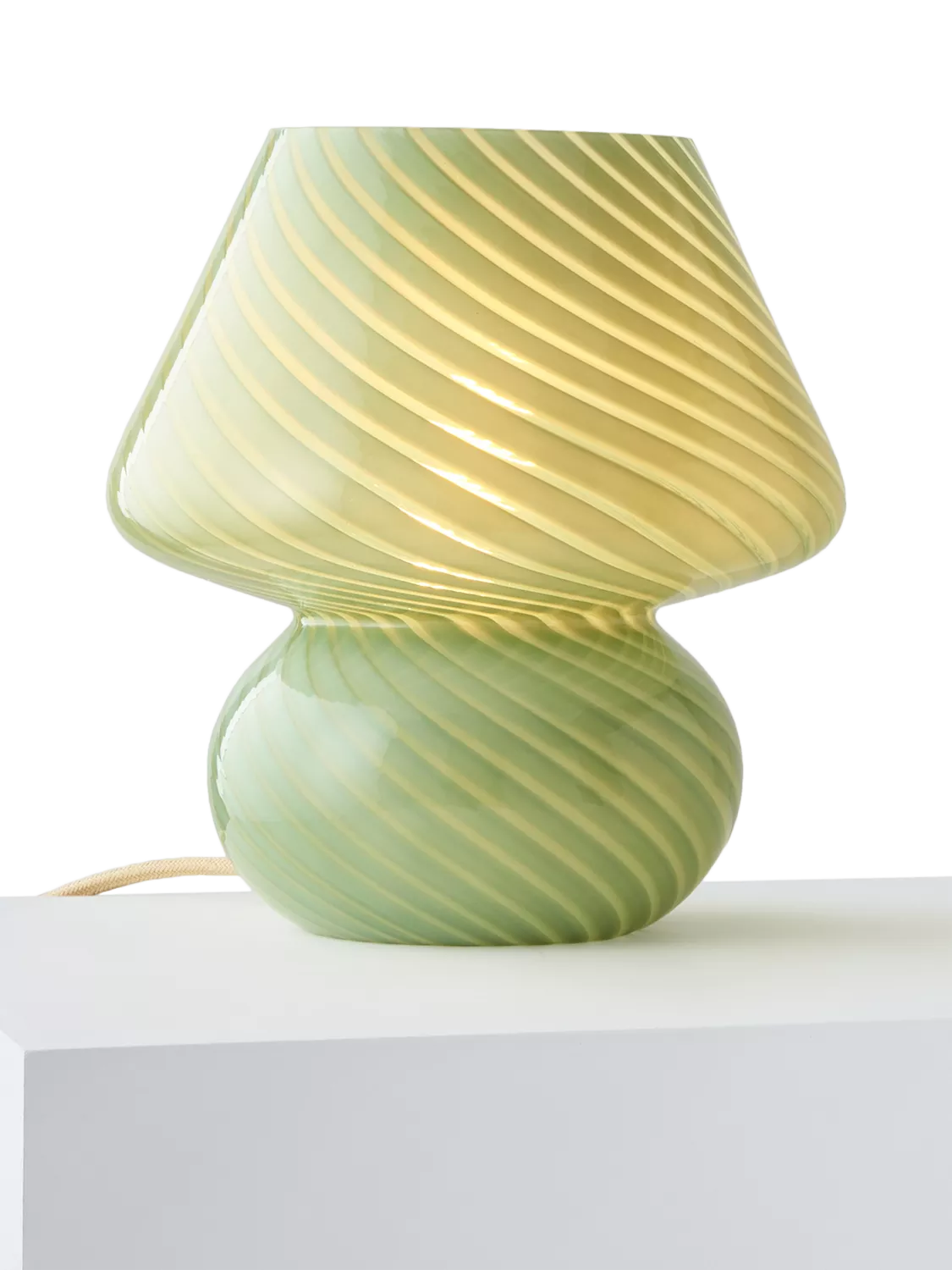 Embrace the retro trend with our classic Glass Mushroom Table Lamp. Great for illuminating your living space and available in a range of fresh colours. Its distinctive mushroom shape, adorned with swirl detailing on the glass shade and base, serves as a stylish focal point for any room.