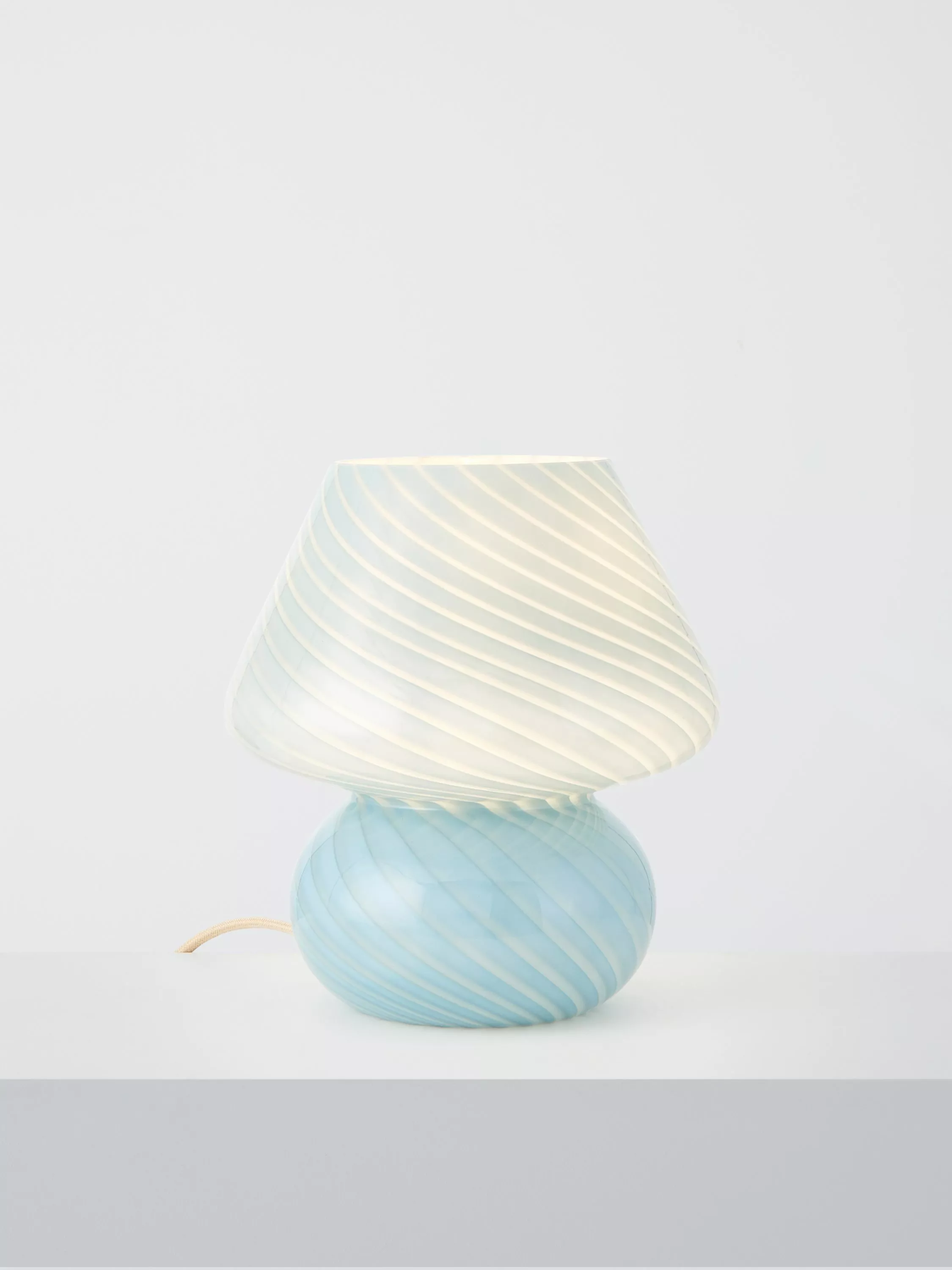 Embrace the retro trend with our classic Glass Mushroom Table Lamp. Great for illuminating your living space and available in a range of fresh colours. Its distinctive mushroom shape, adorned with swirl detailing on the glass shade and base, serves as a stylish focal point for any room.