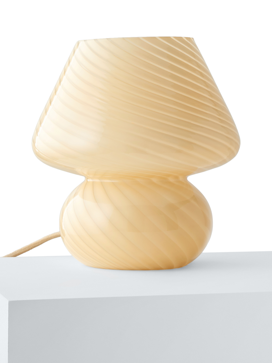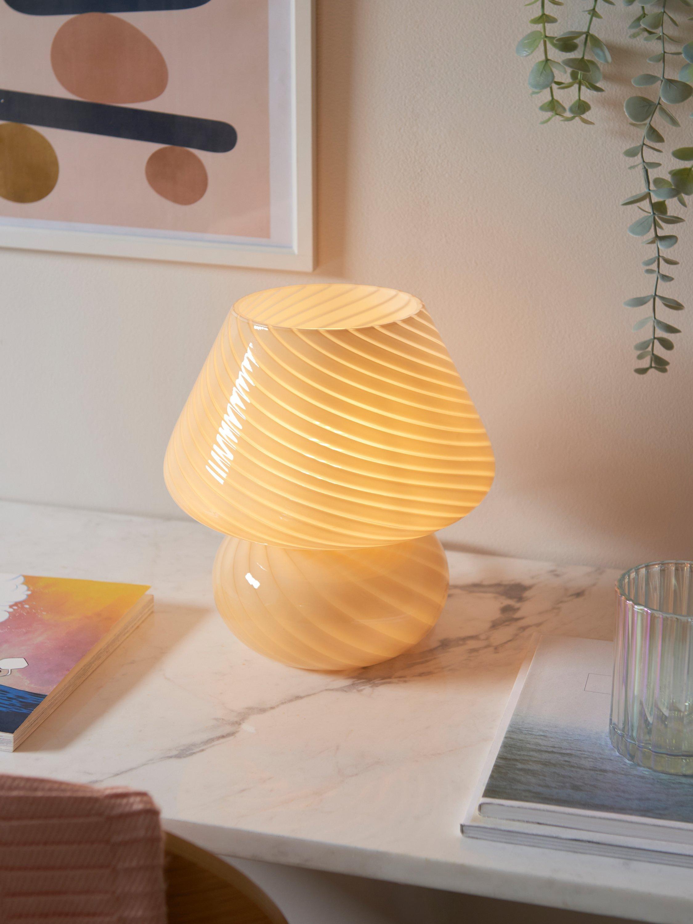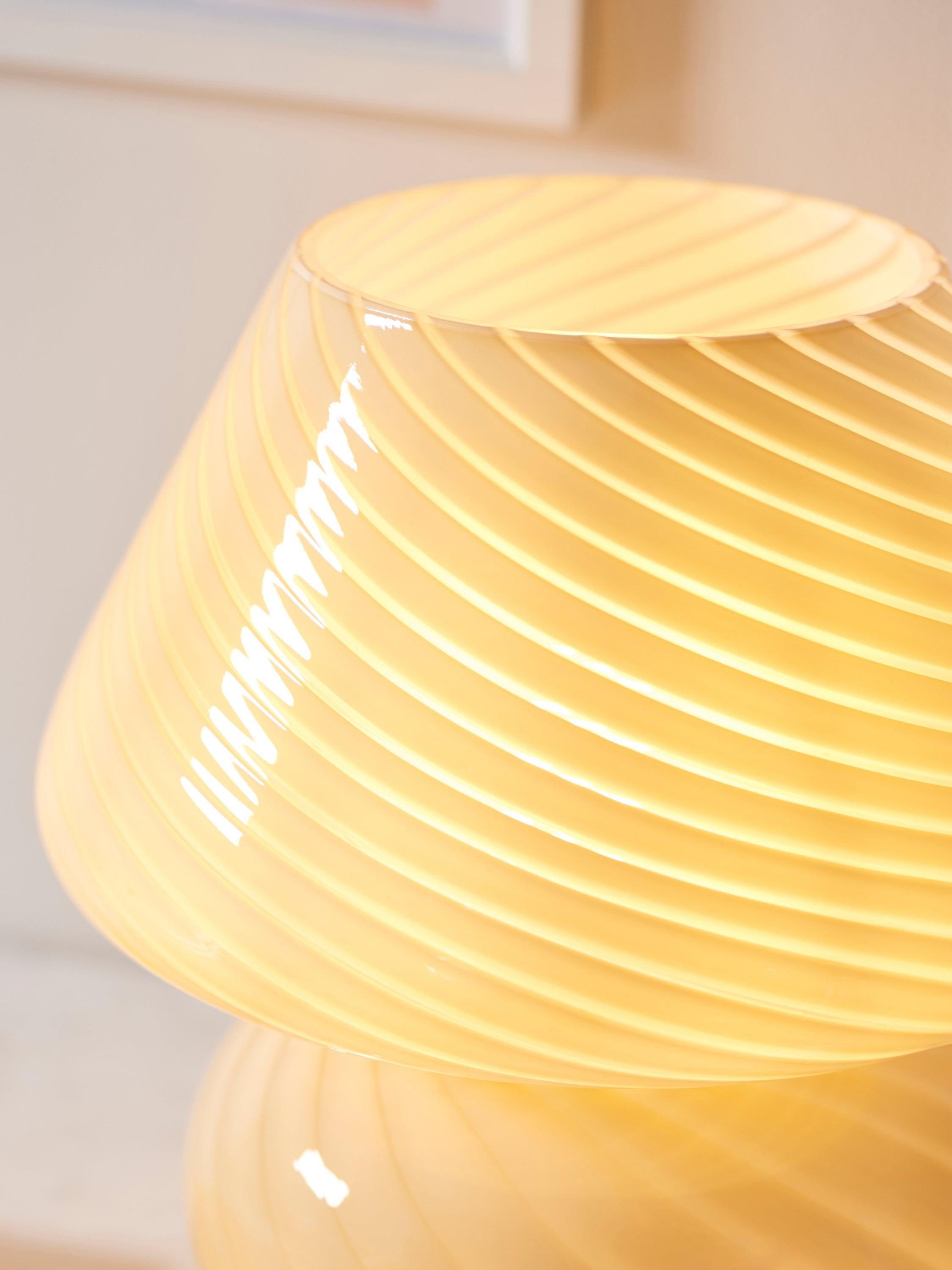 Embrace the retro trend with our classic Glass Mushroom Table Lamp. Great for illuminating your living space and available in a range of fresh colours. Its distinctive mushroom shape, adorned with swirl detailing on the glass shade and base, serves as a stylish focal point for any room.