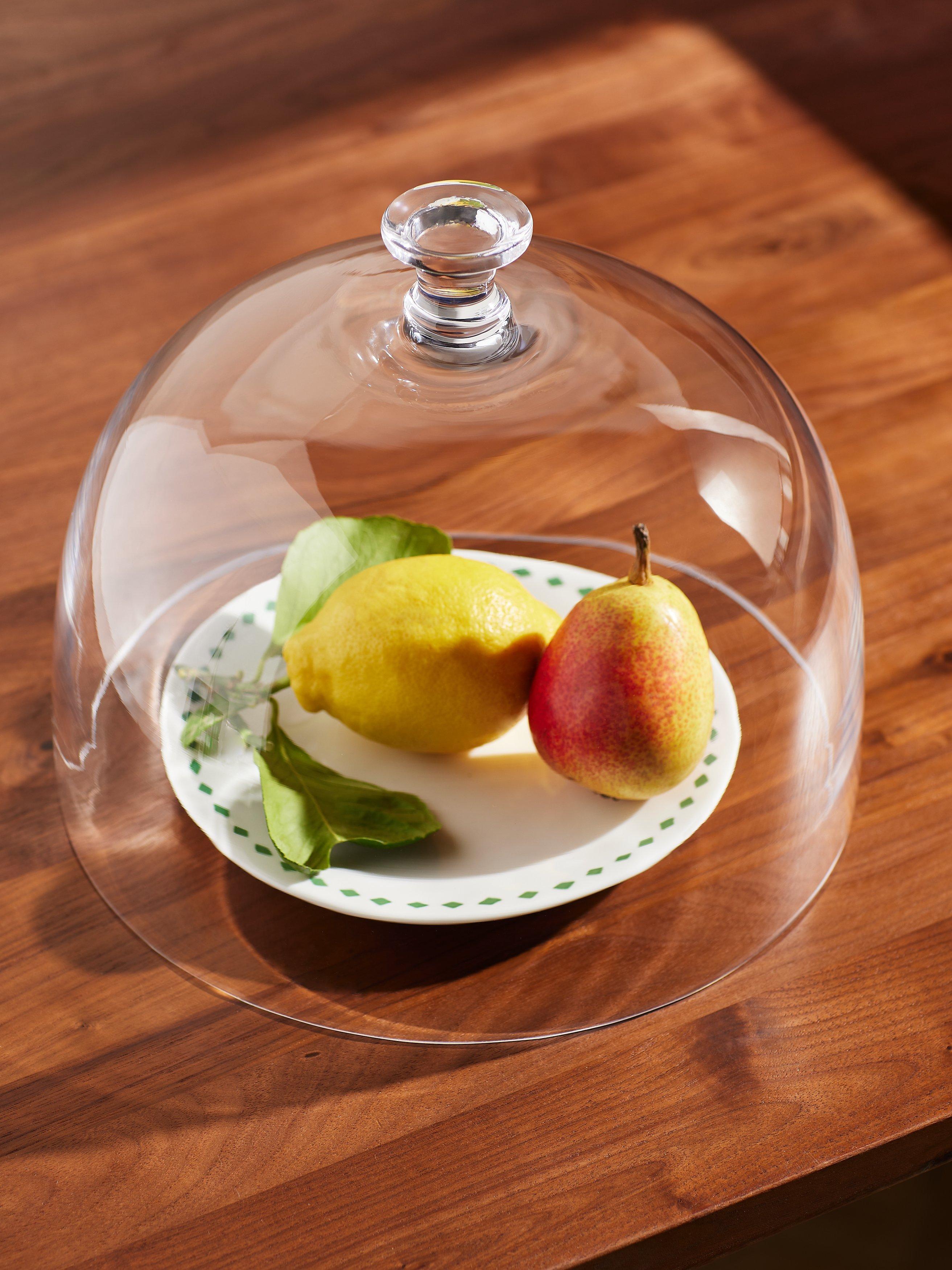 Protect and serve. Place this glass dome over a round cheeseboard or cake stand to keep your food at its best when serving at the table. Dishwasher-safe for easy cleaning.