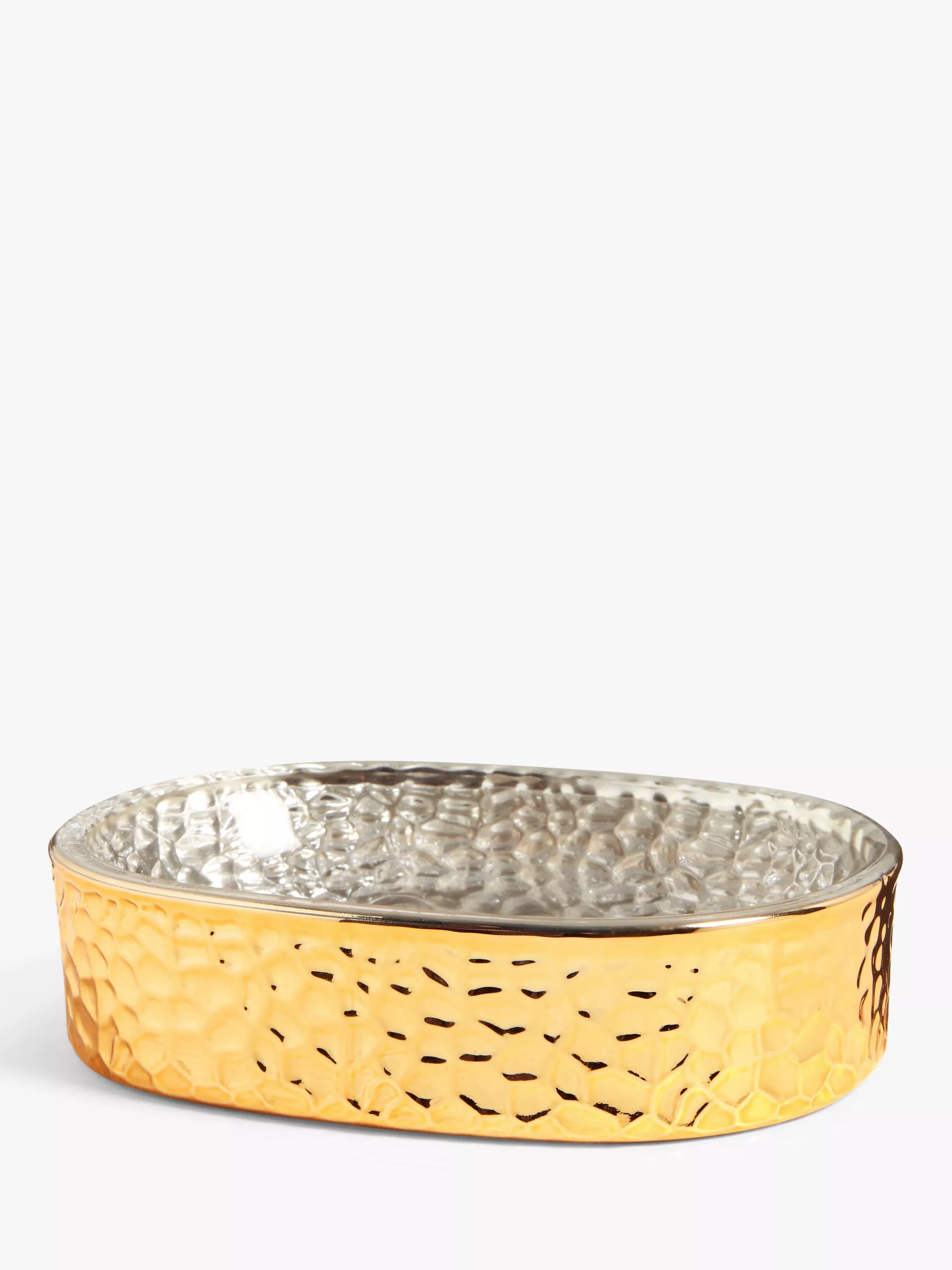 Made from textured glass but with a metallic brass colour there's something special about this soap dish.