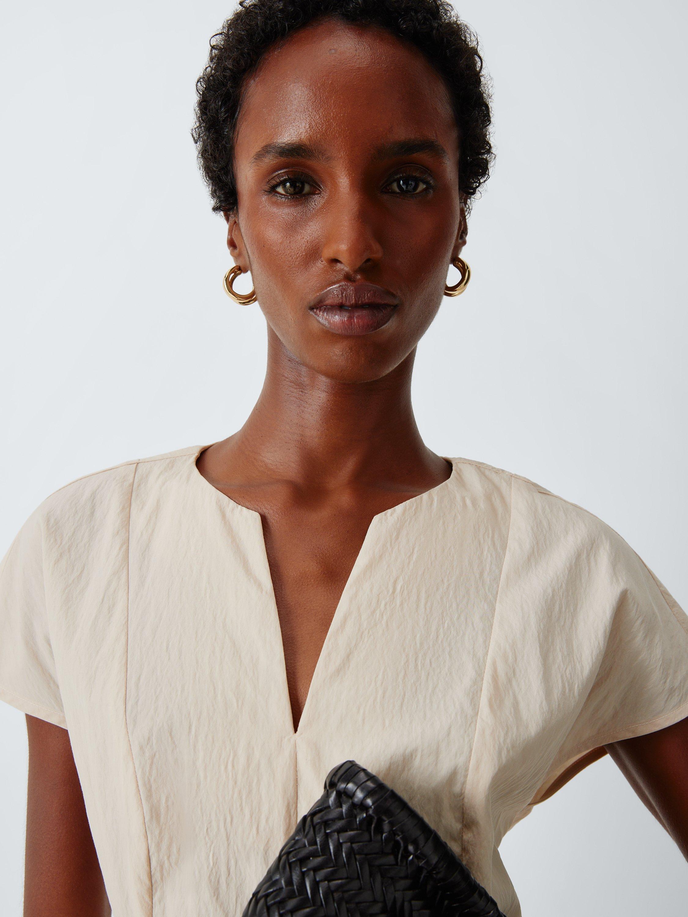The fabric blend provides a luxurious, silky hand-feel that feels as elevated as it looks. Defined by a modern V-neckline and clean cap sleeves, this lightweight piece serves as a versatile anchor for tailored trousers or a slim-fit skirt.