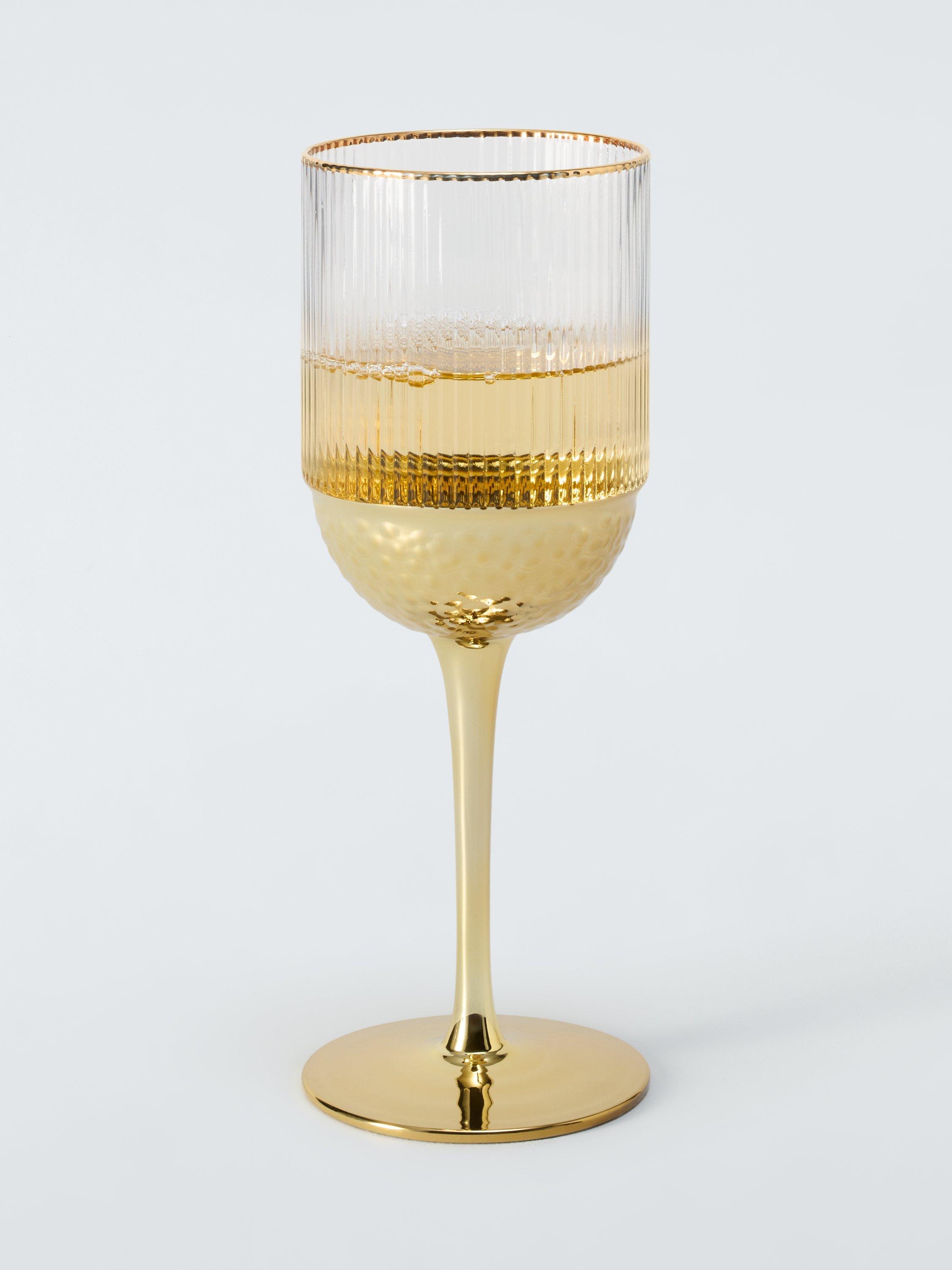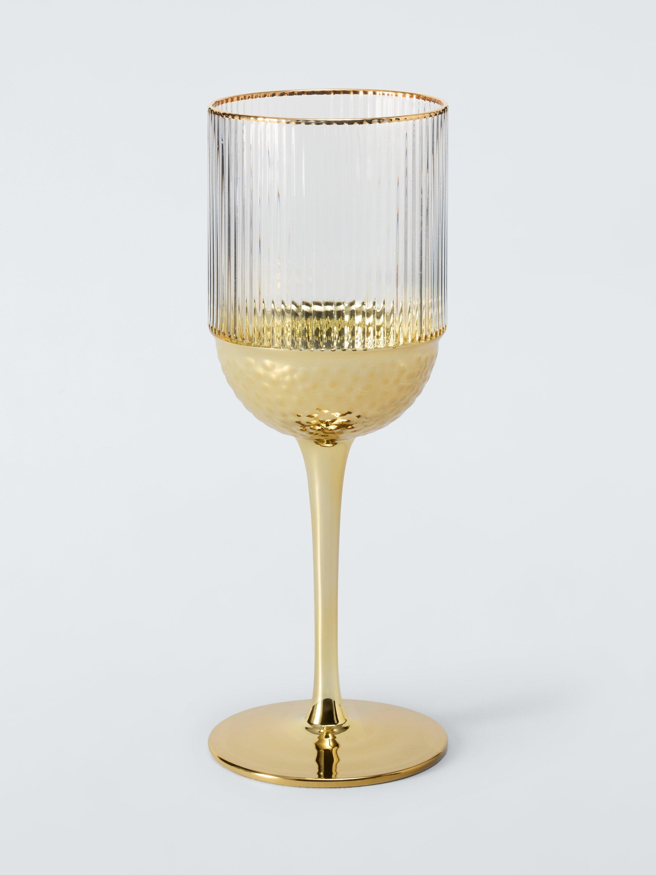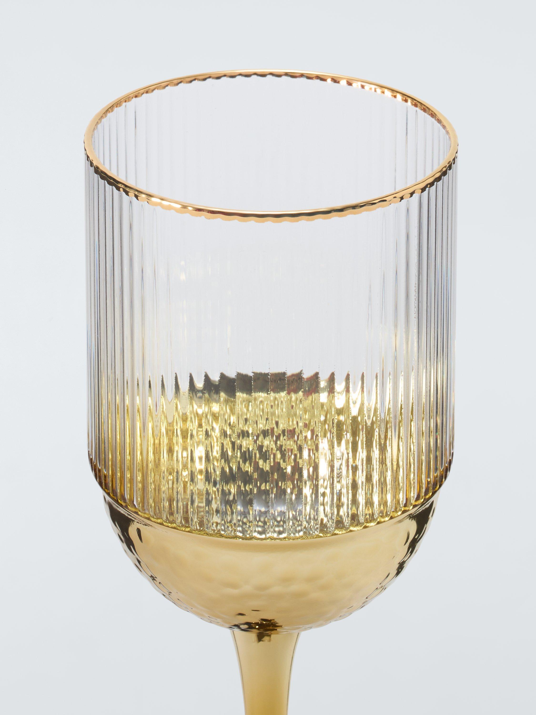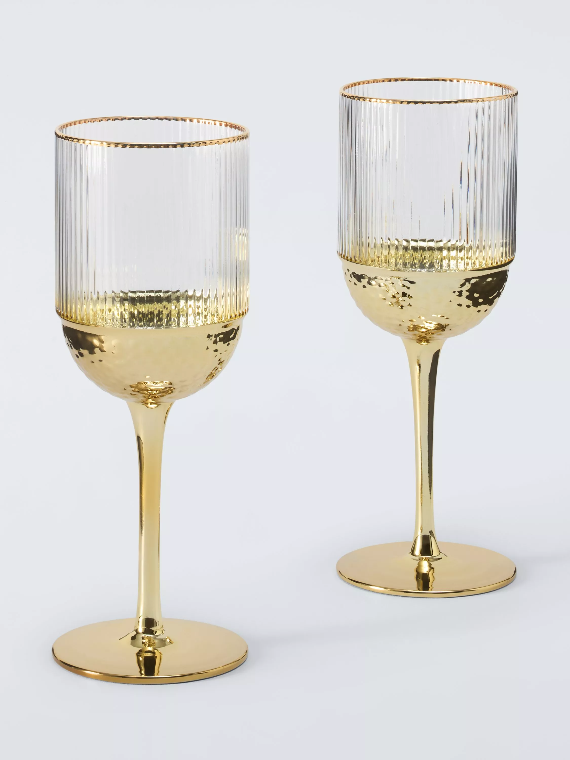 Pair of ribbed wine glasses with elegant stems and glinting gold-toned rims and bases.