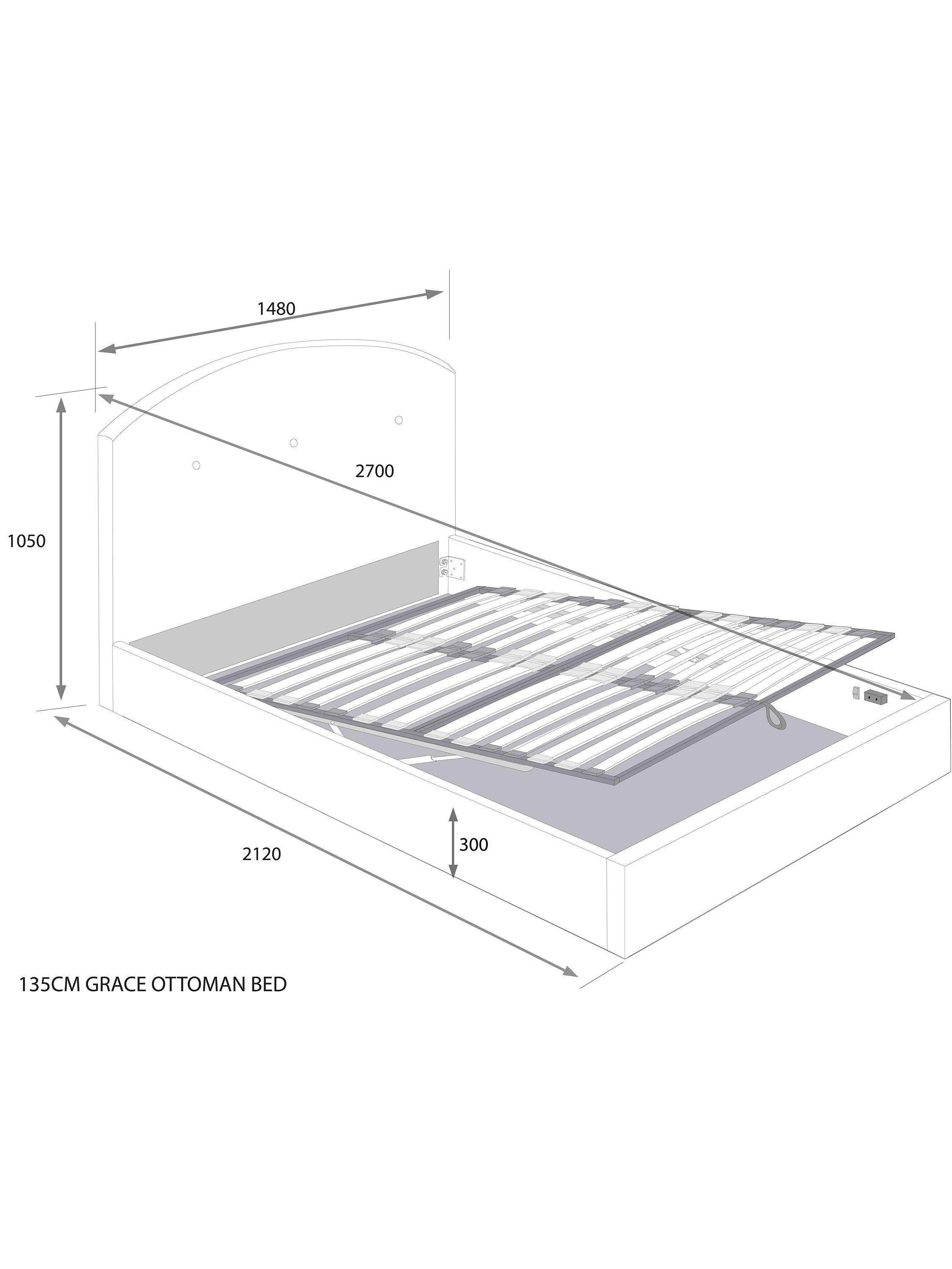 The Grace ottoman storage bed frame has a sophisticated design, thanks to button detailing on its carefully curved headboard. Its handle and hydraulic arms facilitate an easy manual lift-up, and reveals a functional and spacious storage space for linens. Sprung slats provide additional support for you and your mattress.