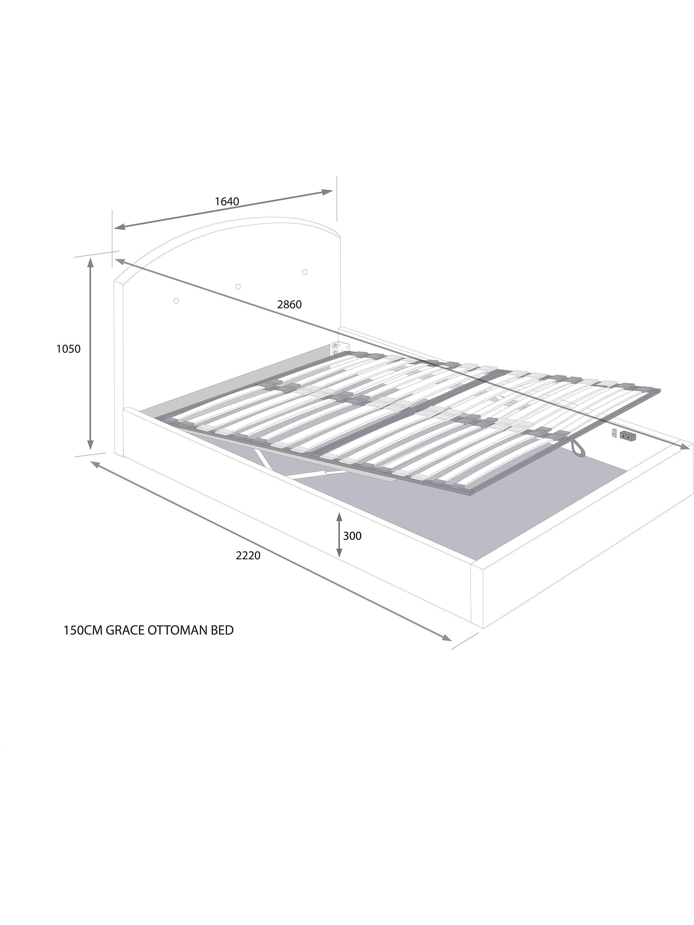 The Grace ottoman storage bed frame has a sophisticated design, thanks to button detailing on its carefully curved headboard. Its handle and hydraulic arms facilitate an easy manual lift-up, and reveals a functional and spacious storage space for linens. Sprung slats provide additional support for you and your mattress.