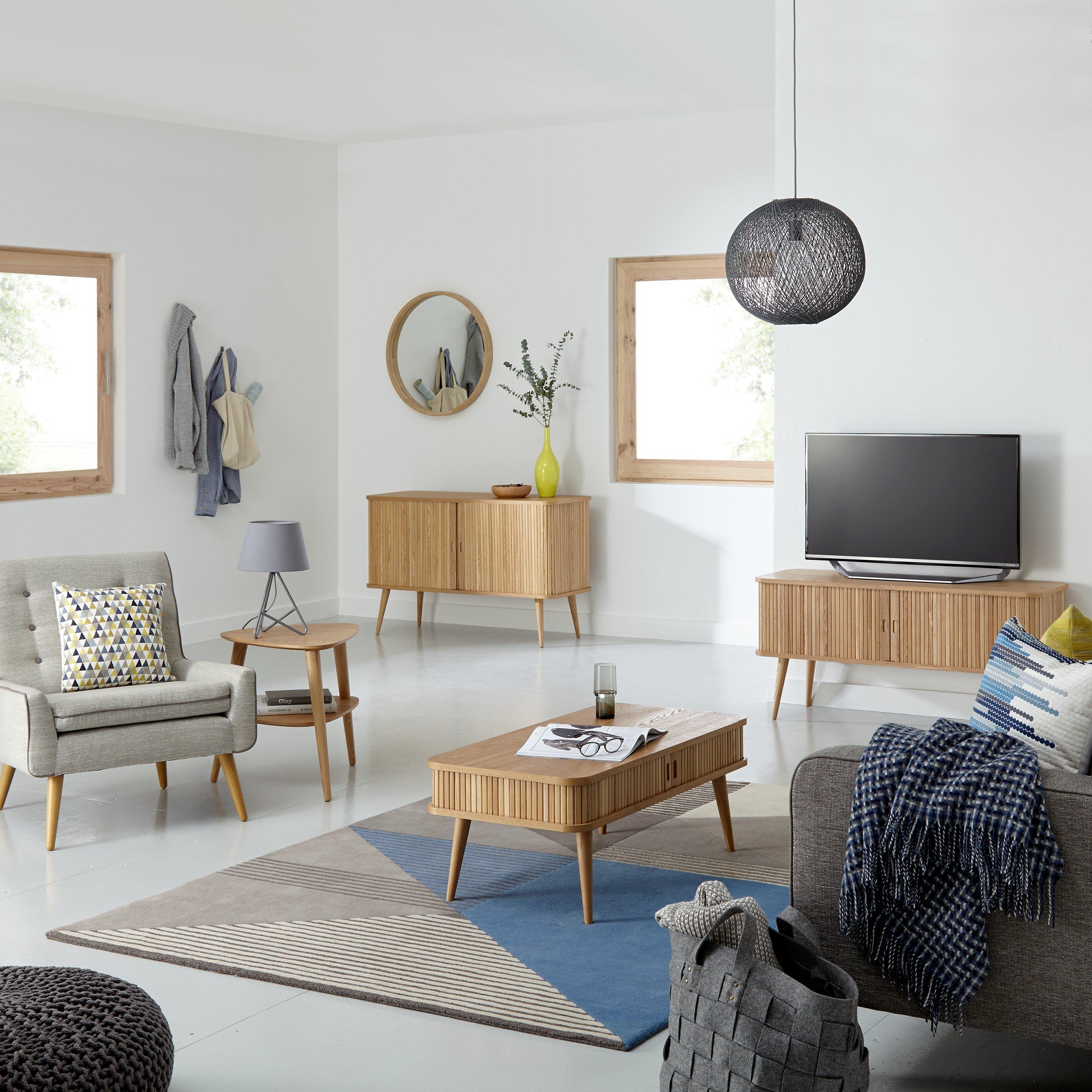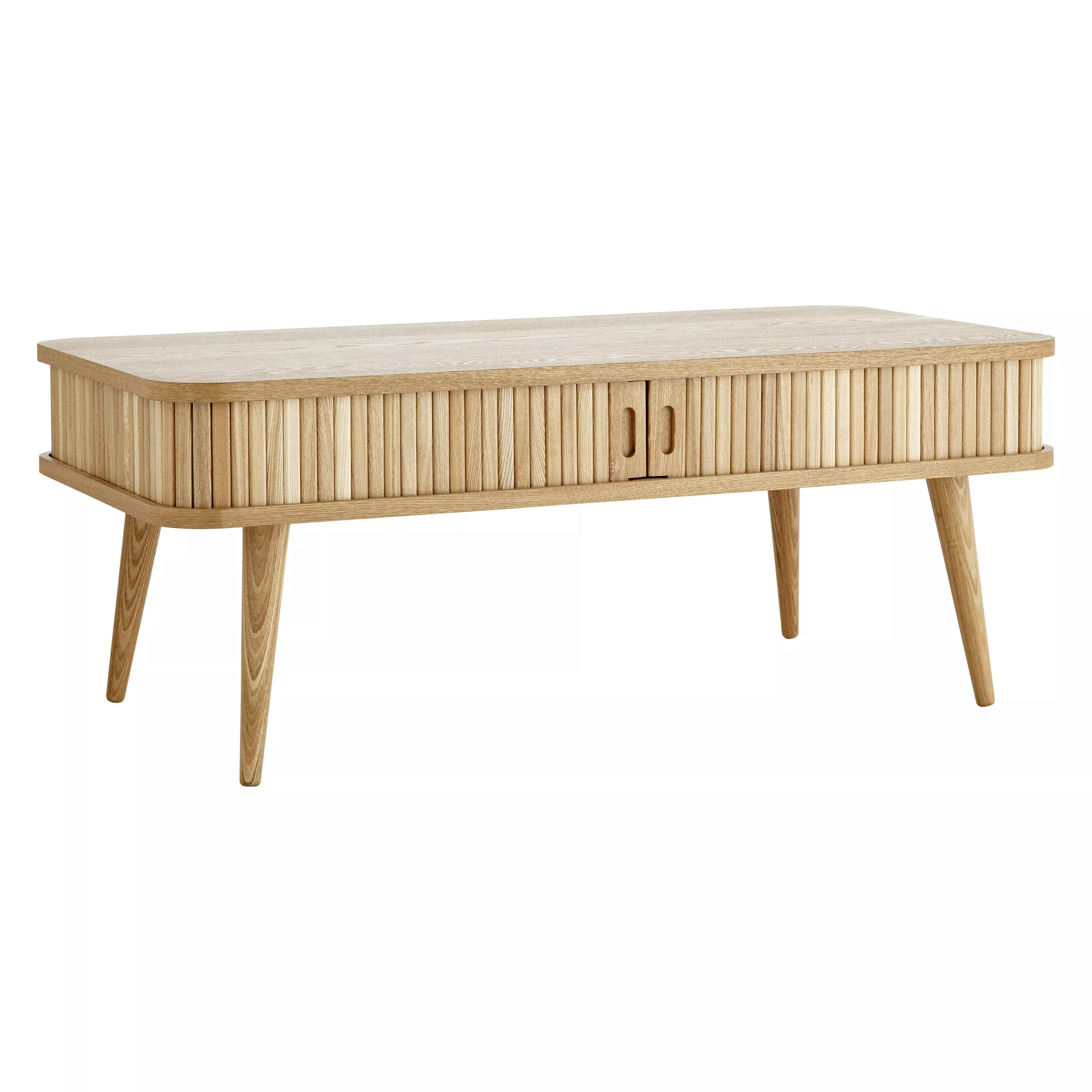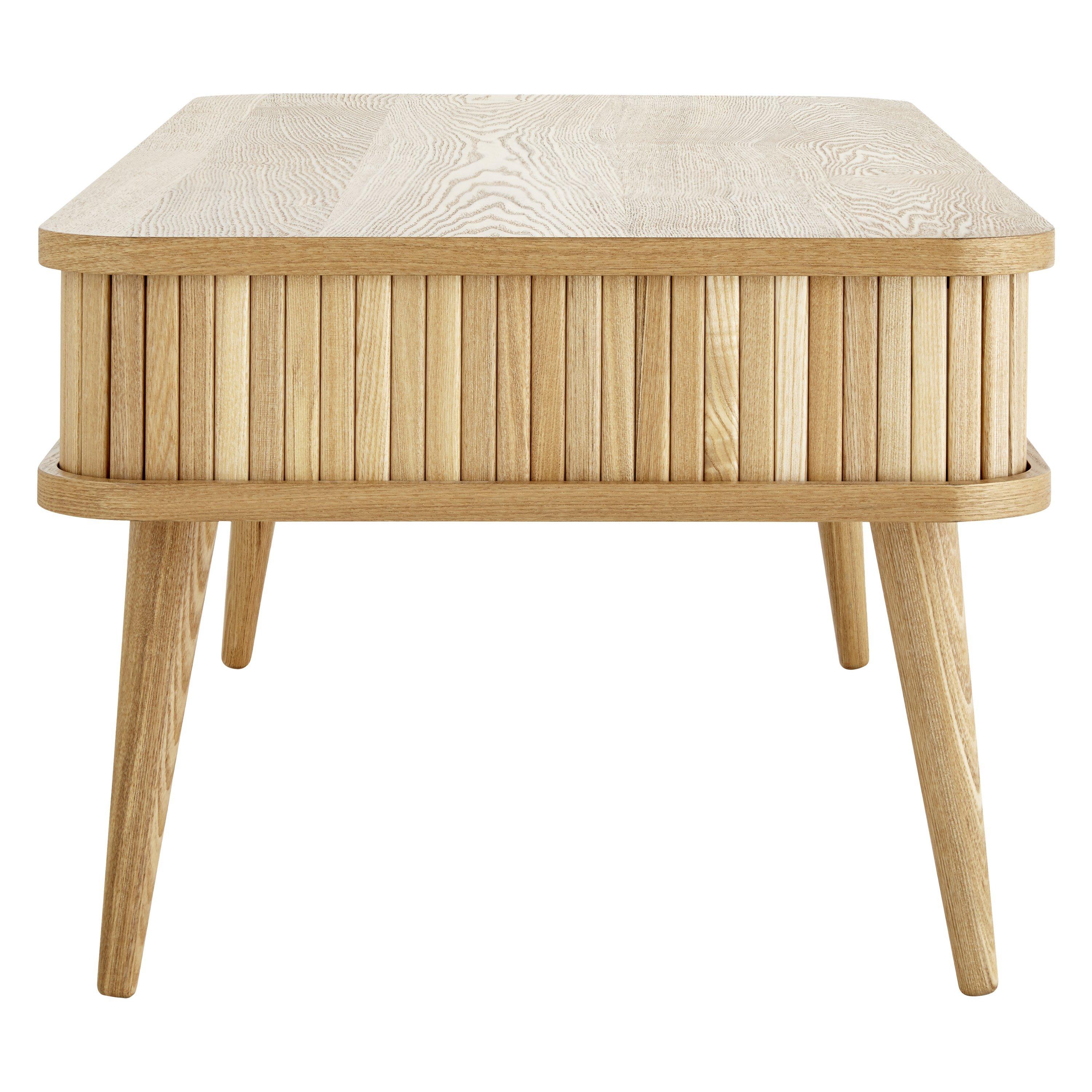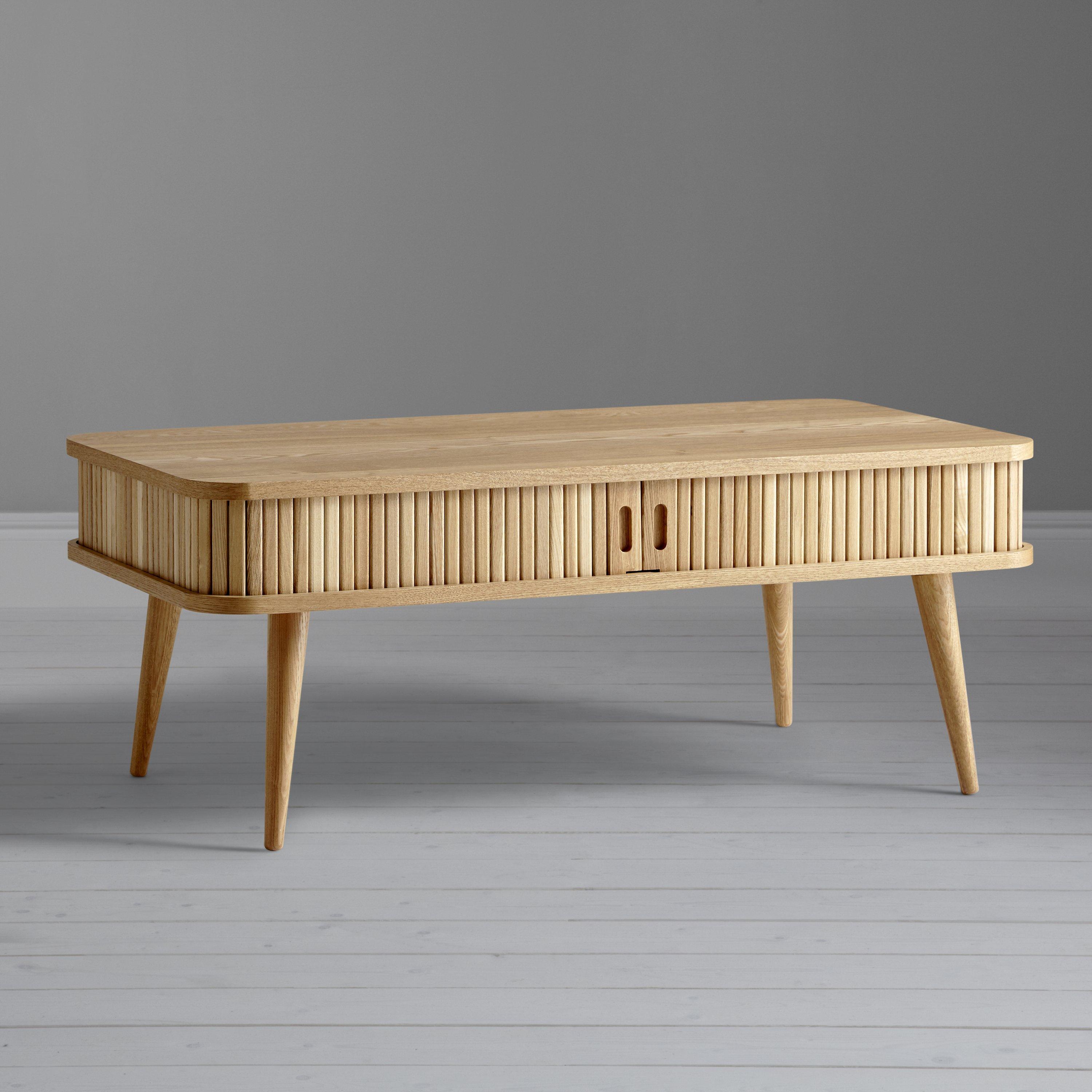 Make a statement in your living room with the Grayson coffee table. Sliding solid ash tambour doors and splayed solid wood turned legs give the table a uniquely stylish edge, with a hint of mid-century detailing.