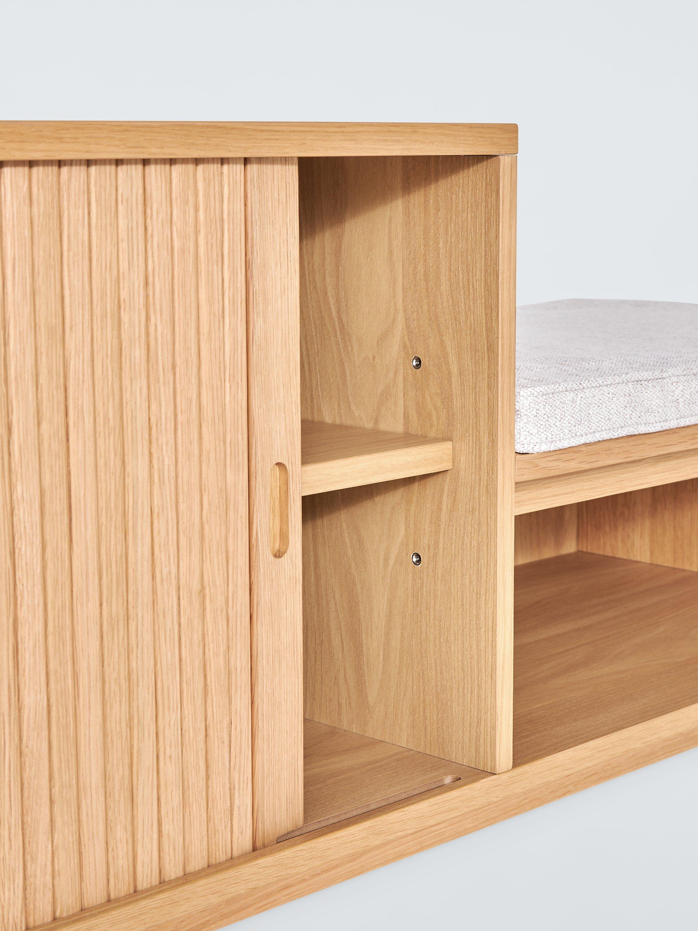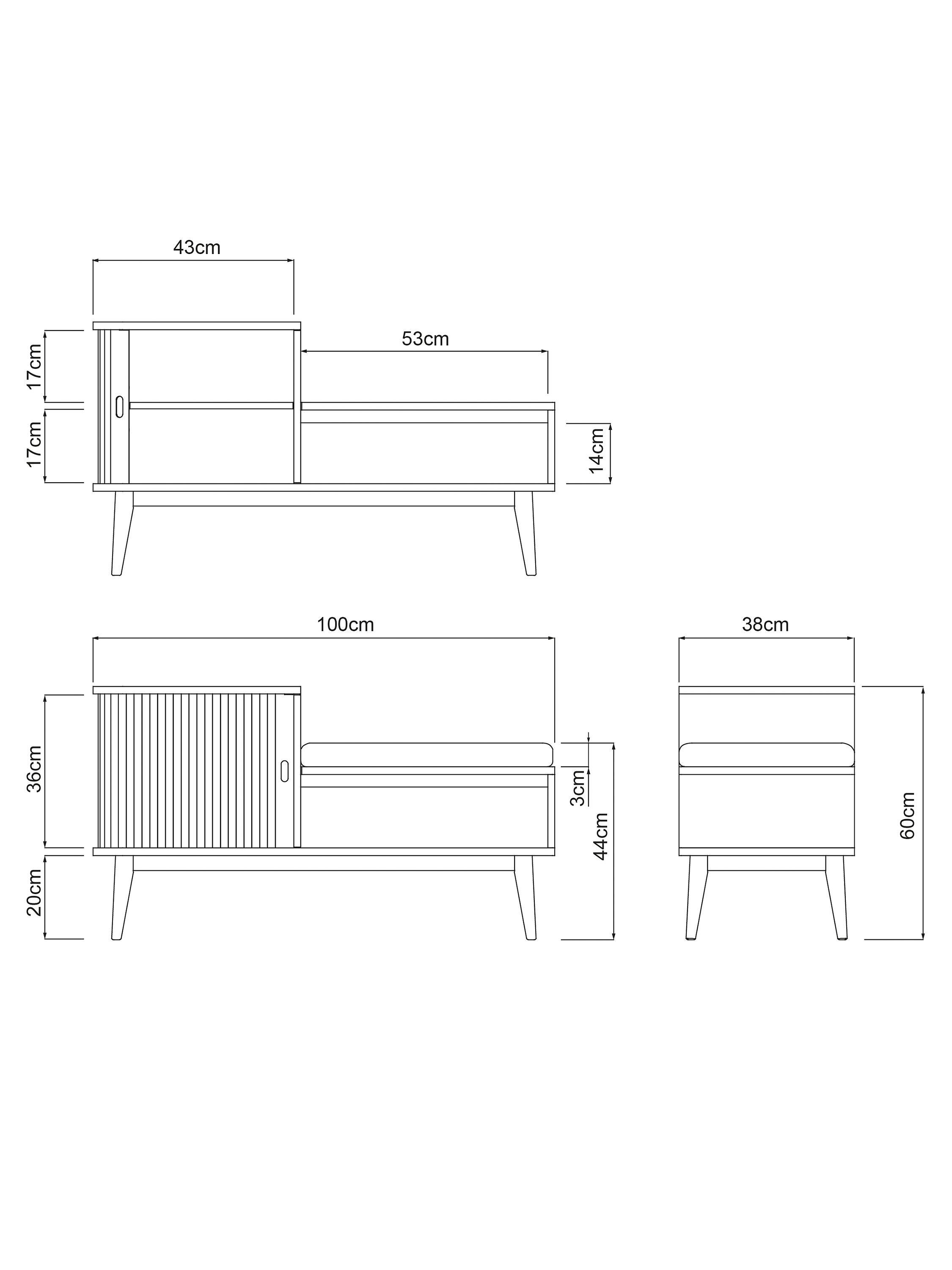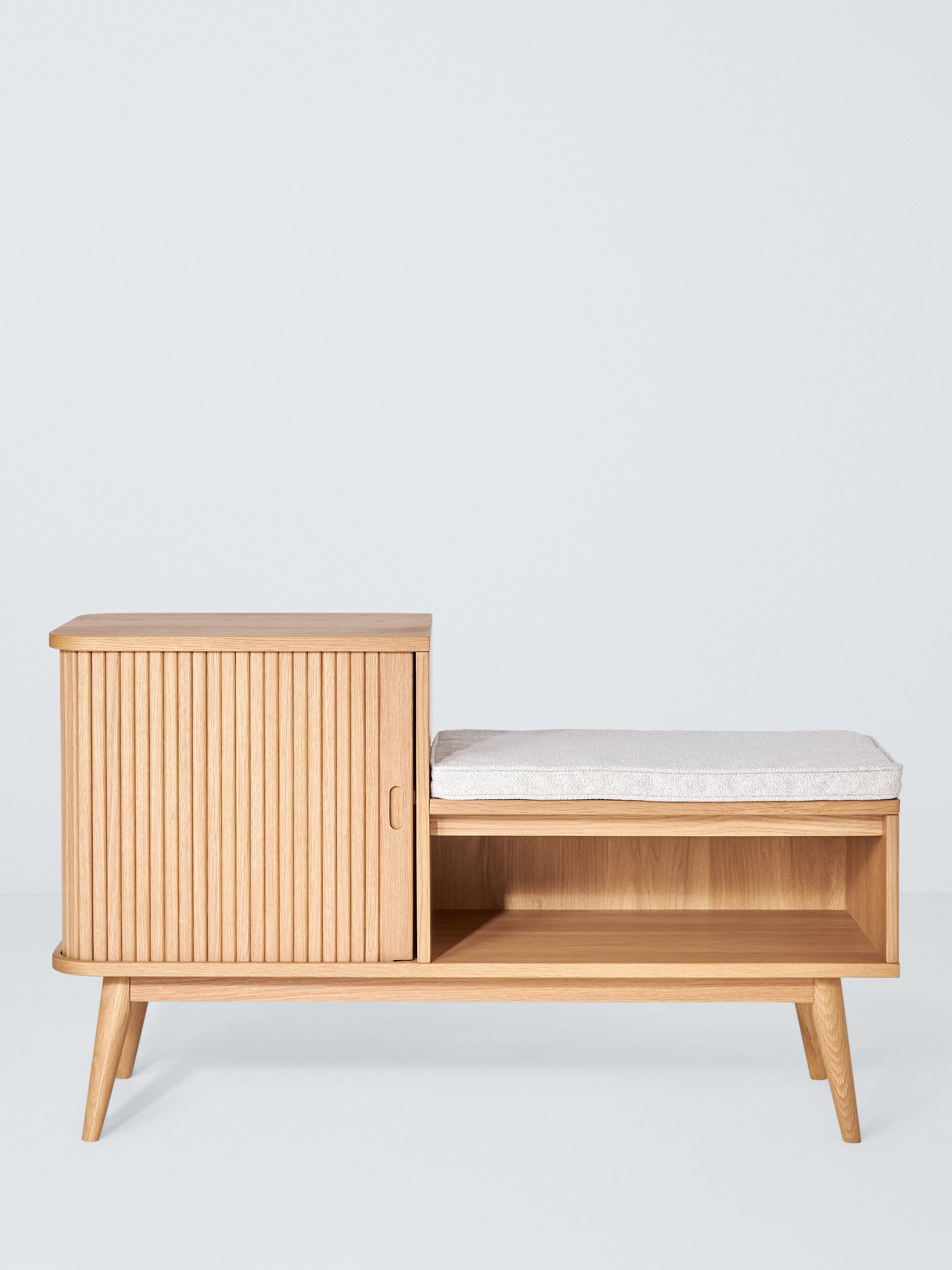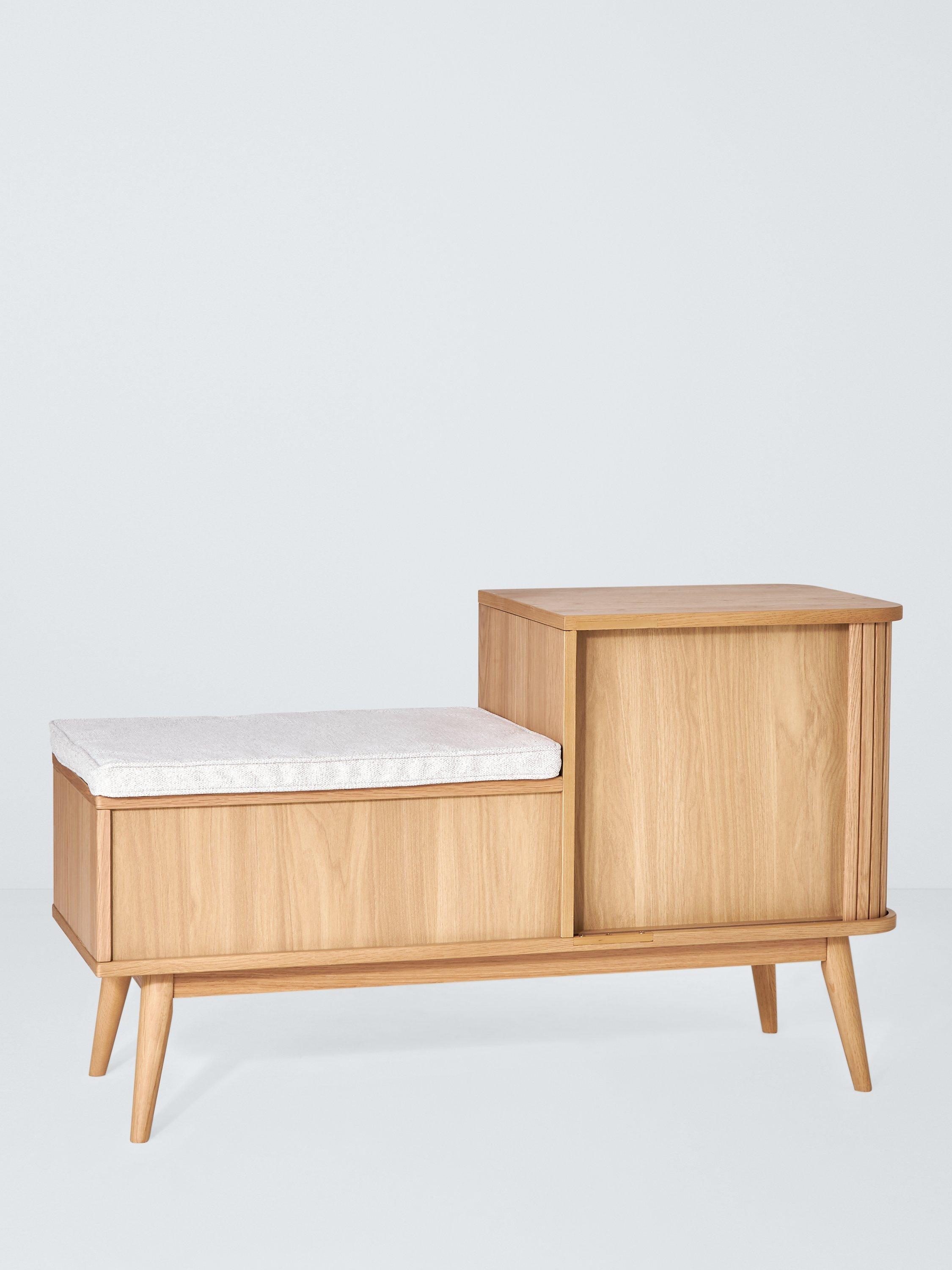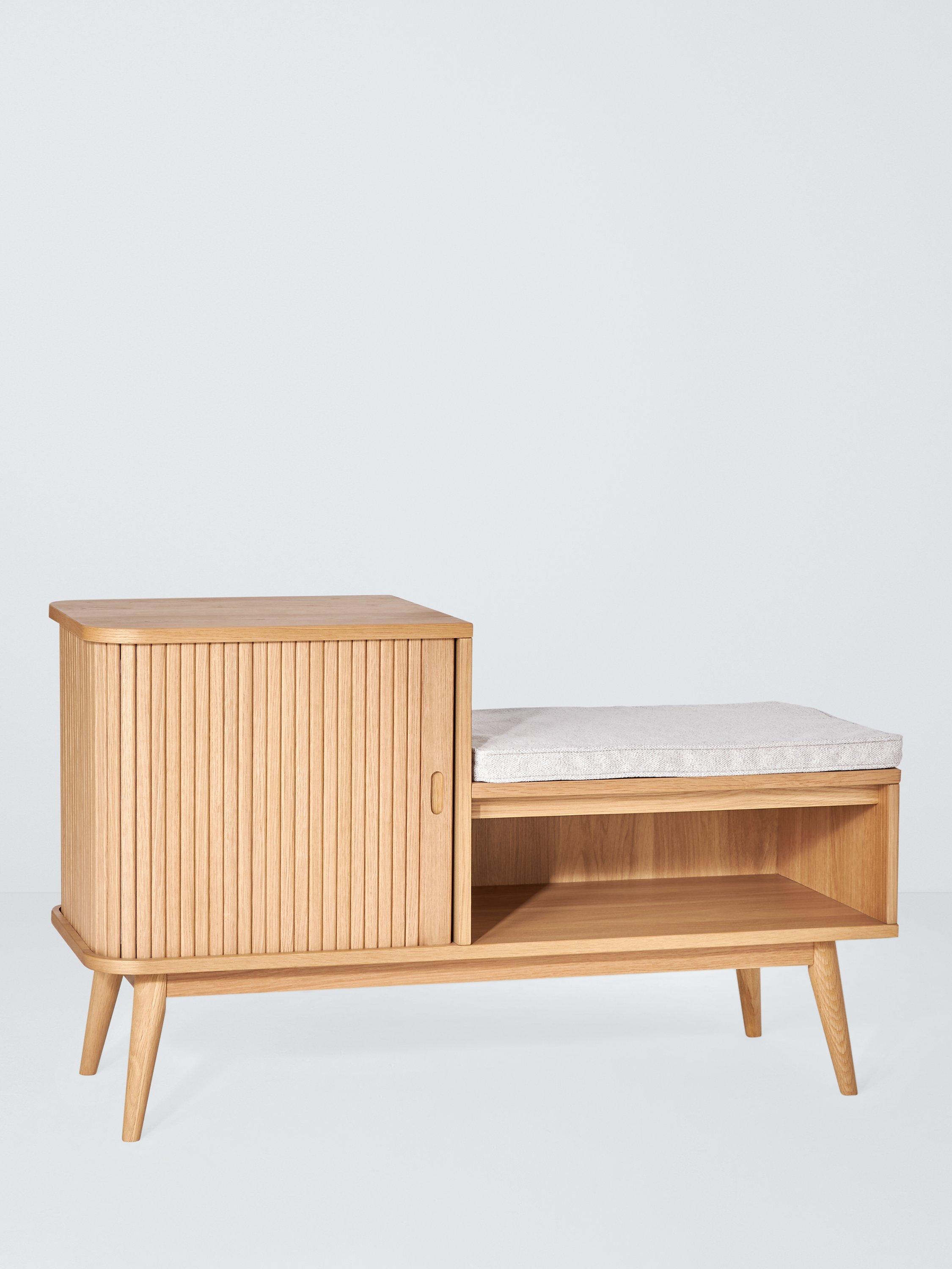 Built from high-quality wood in a veneered finish, this is a useful and practical addition to your hallway. The cabinet section is designed with a slatted door that glides open for easy access and there's a shelf inside. The bench section is also open-fronted for additional storage. We like the spindle-shaped, tapered legs that celebrate sleek, Scandi-inspired design.