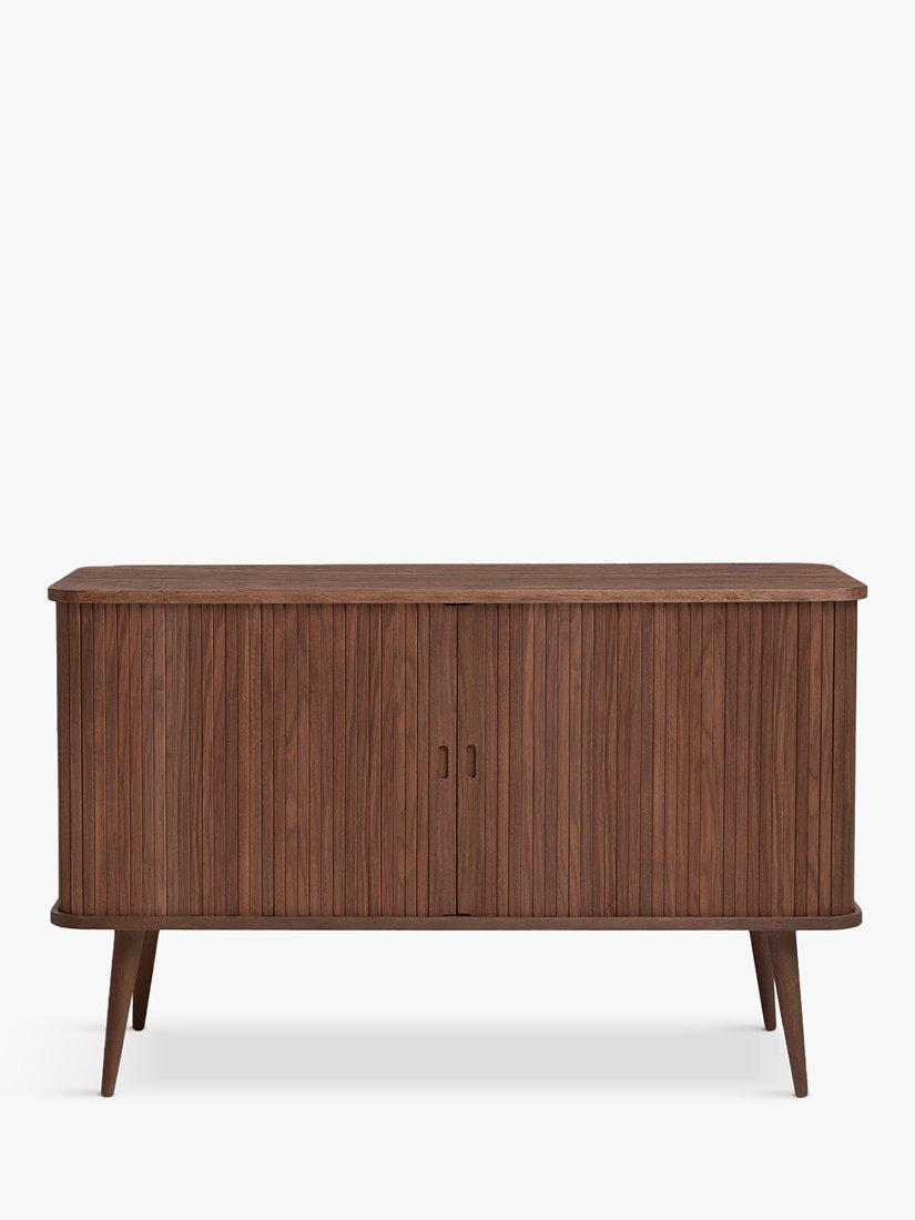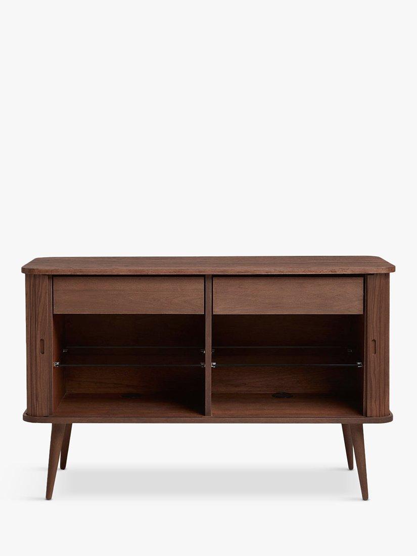 A clever storage option for your modern home. Part of our Grayson range, this spacious sideboard is made from a combination of high-quality woods, which we've coated in a veneer for durability. A slatted siding door opens to reveal two storage compartments, each designed with a drawer and adjustable glass shelf. The design has a Scandinavian focus, but turned legs give it a cool, retro edge. The top panel can support a maximum load of 30kg and the internal shelves and drawers can support a maximum load of 10kg each.