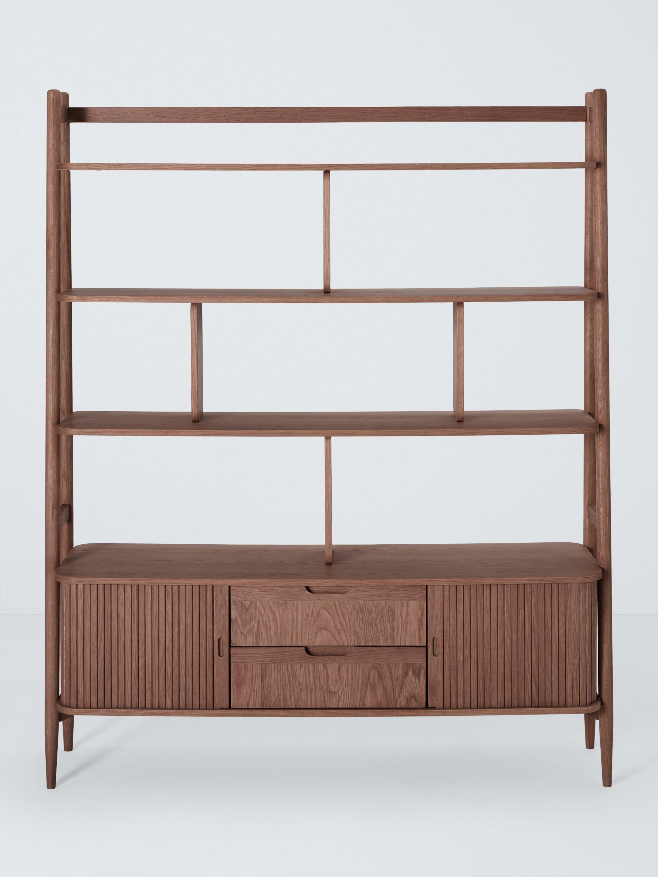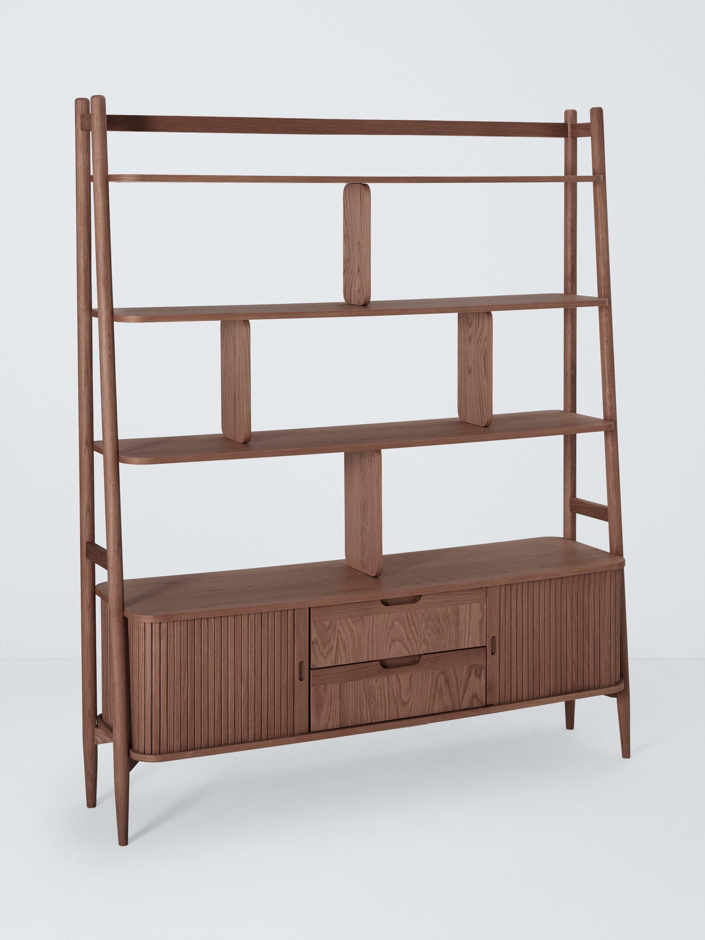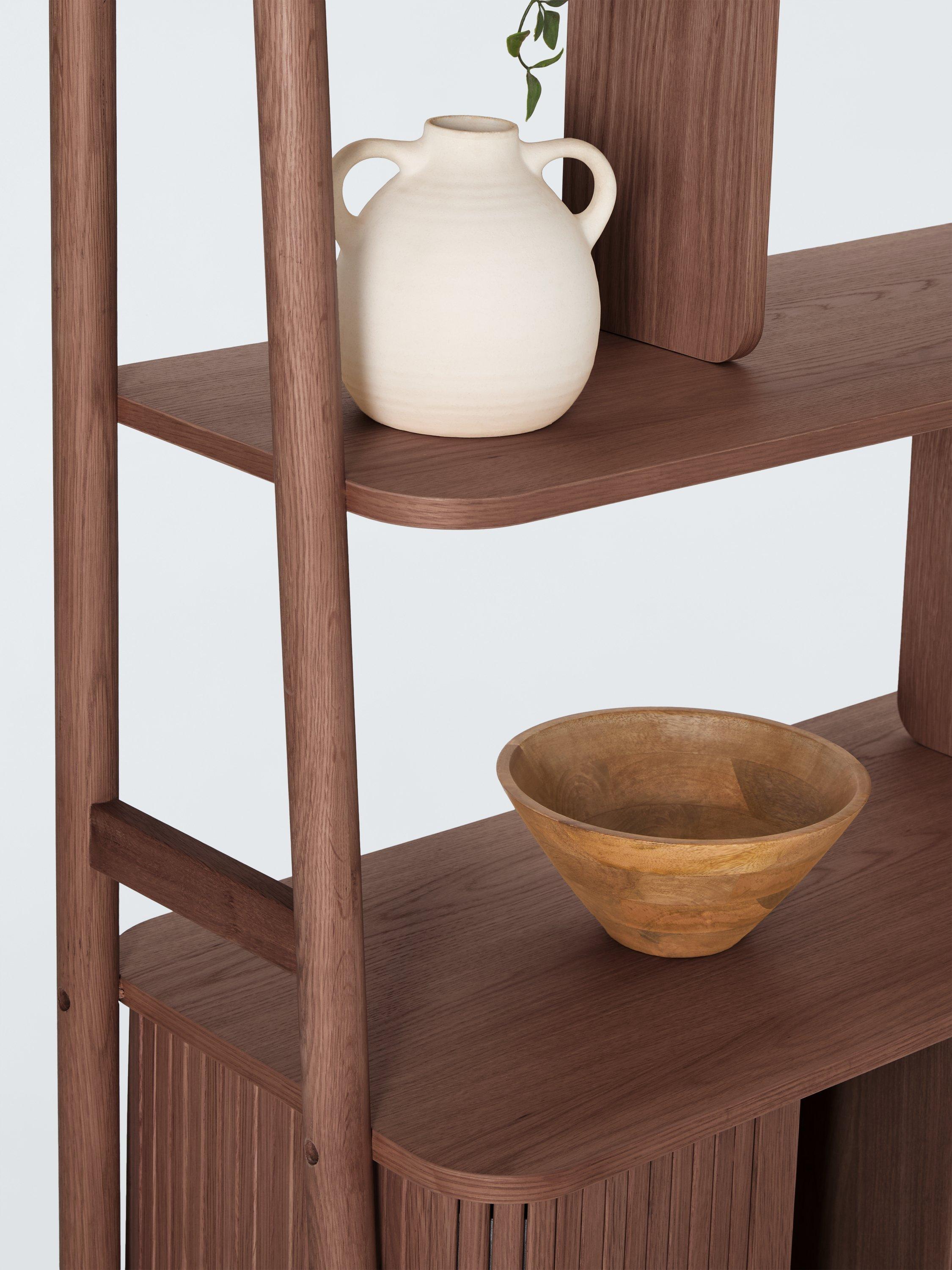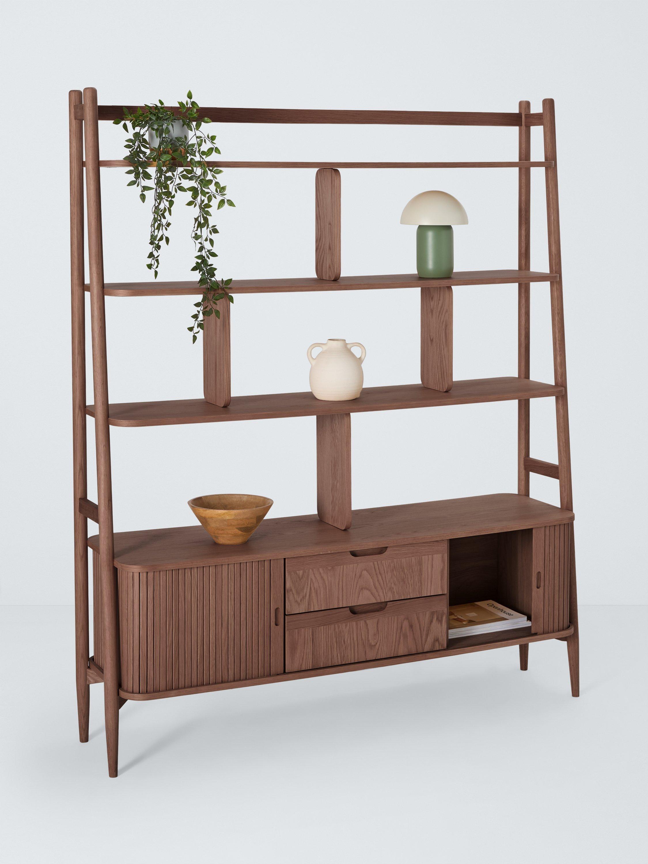 Built from high-quality wood in a veneered finish, this shelving unit features a storage cabinet section as well as three shelves. The cabinet is designed with slatted doors that glide open for easy access and the spindle-shaped, tapered legs celebrate sleek, Scandi-inspired design.