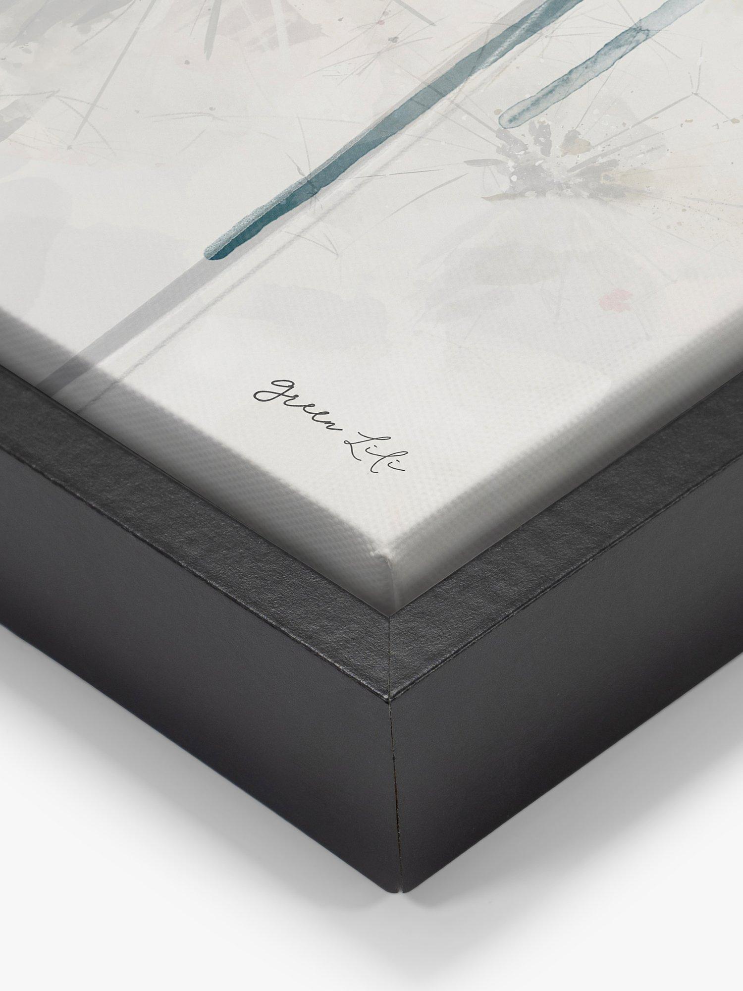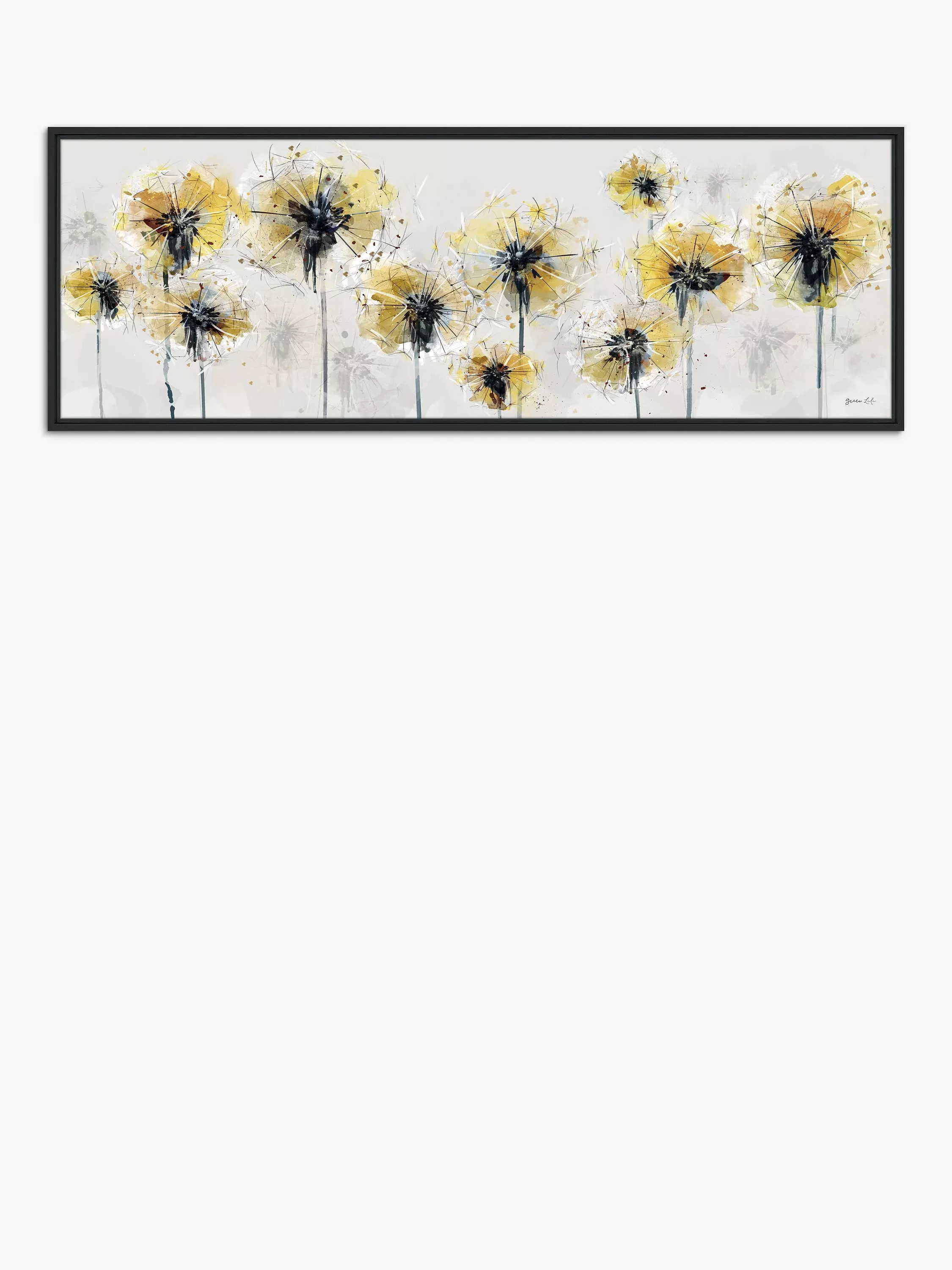 Golden flowers fill the frame in this work by artist Green Lili. Made in the UK, this canvas wrap print is mounted in a black frame, a deep frame that creates an elegant shadow gap around the picture. Arrives ready to hang on your wall.