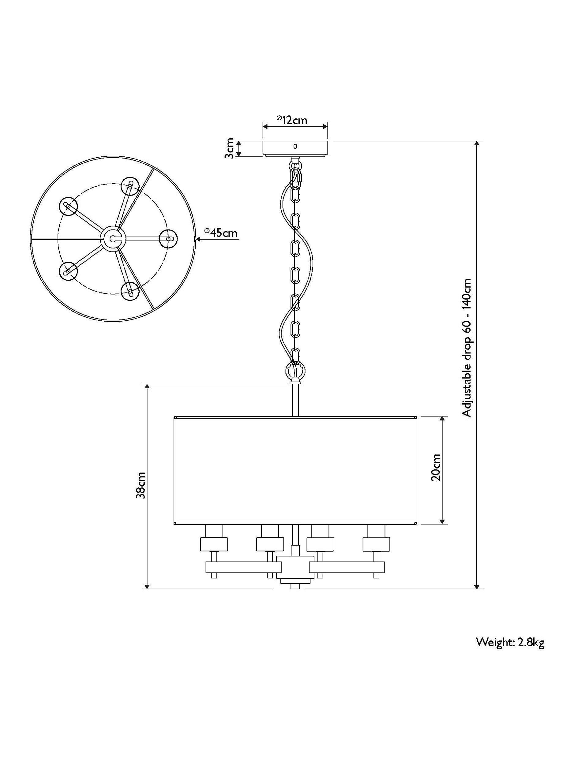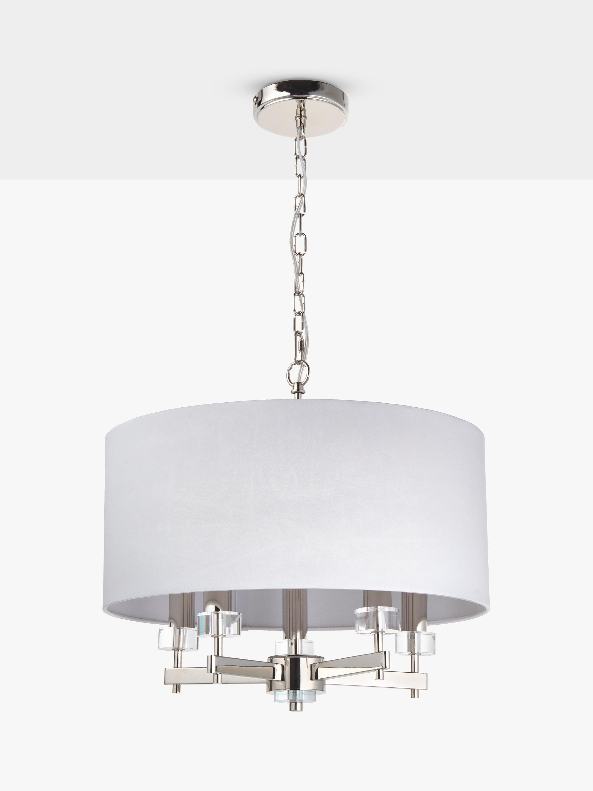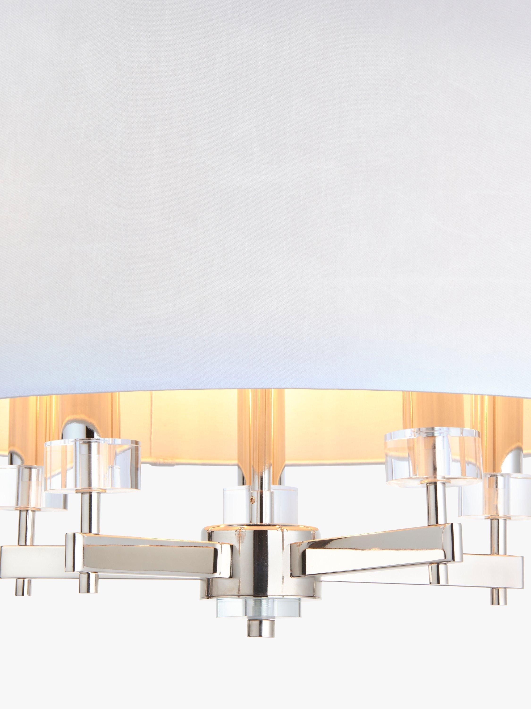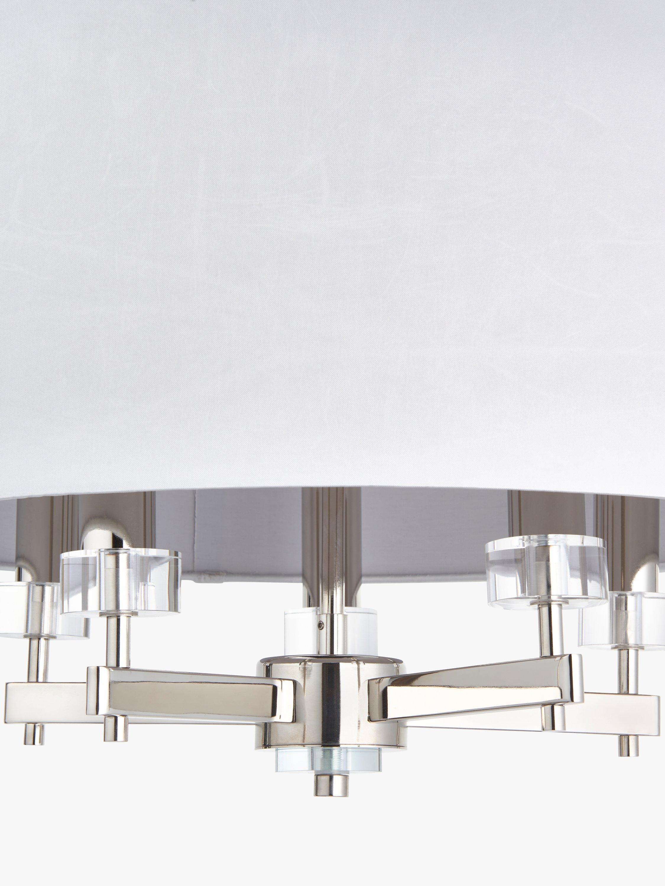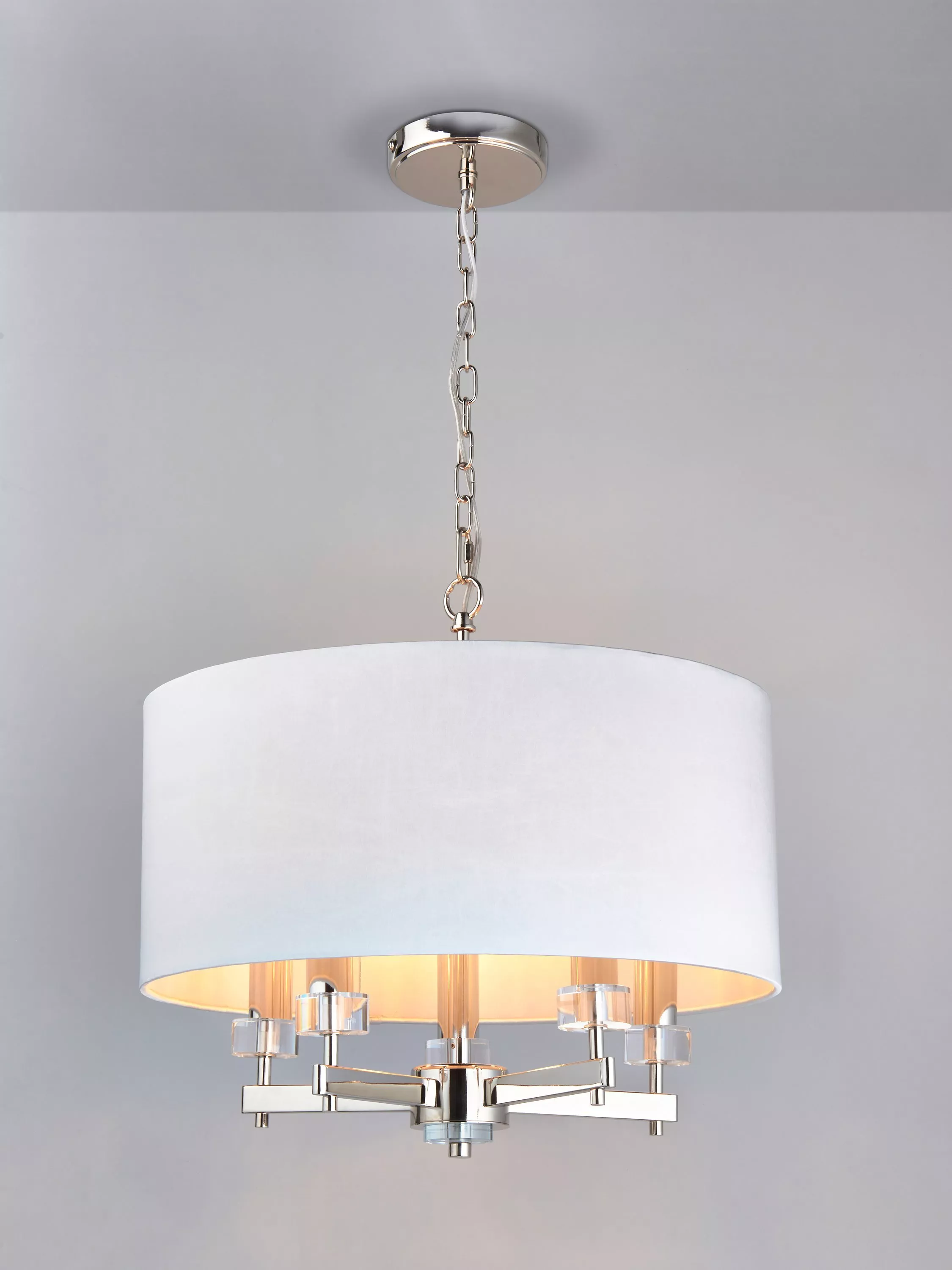Bespoke rectangular arm details with polished nickel surface finishing completes the overall look and feel. This five lamp statement pendant is on a height adjustable chain.