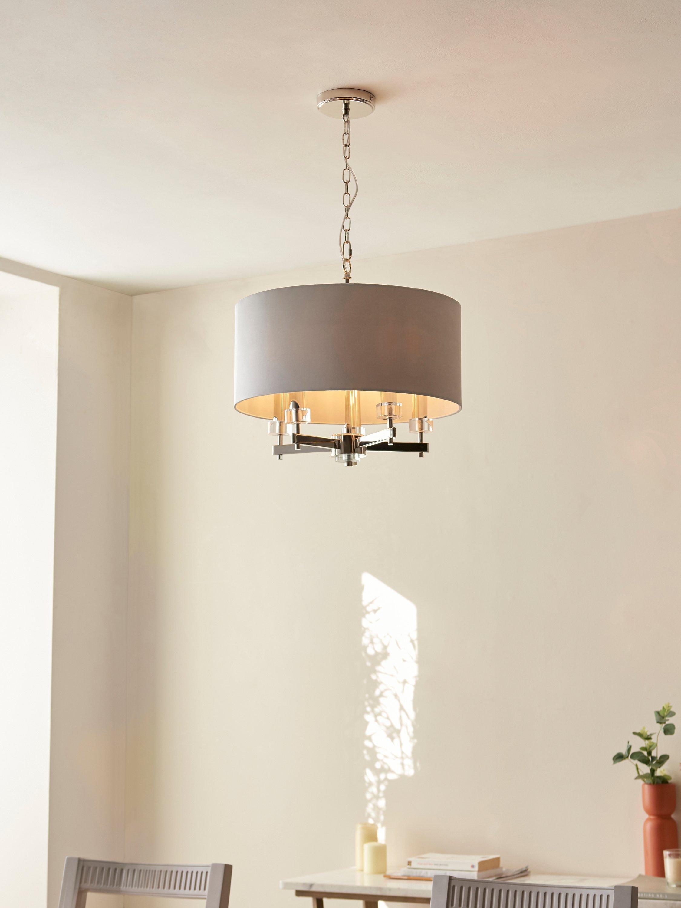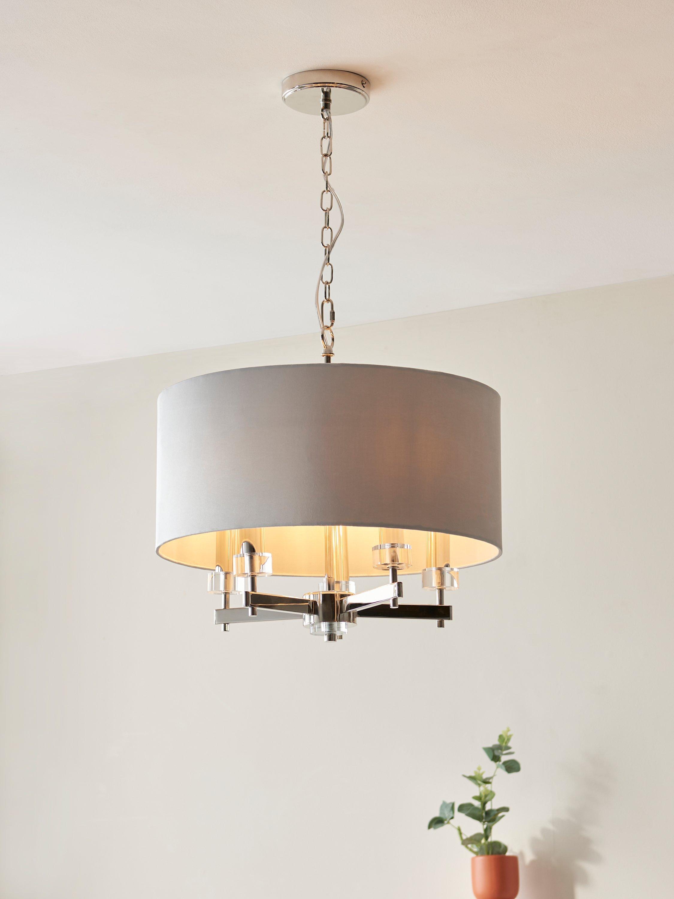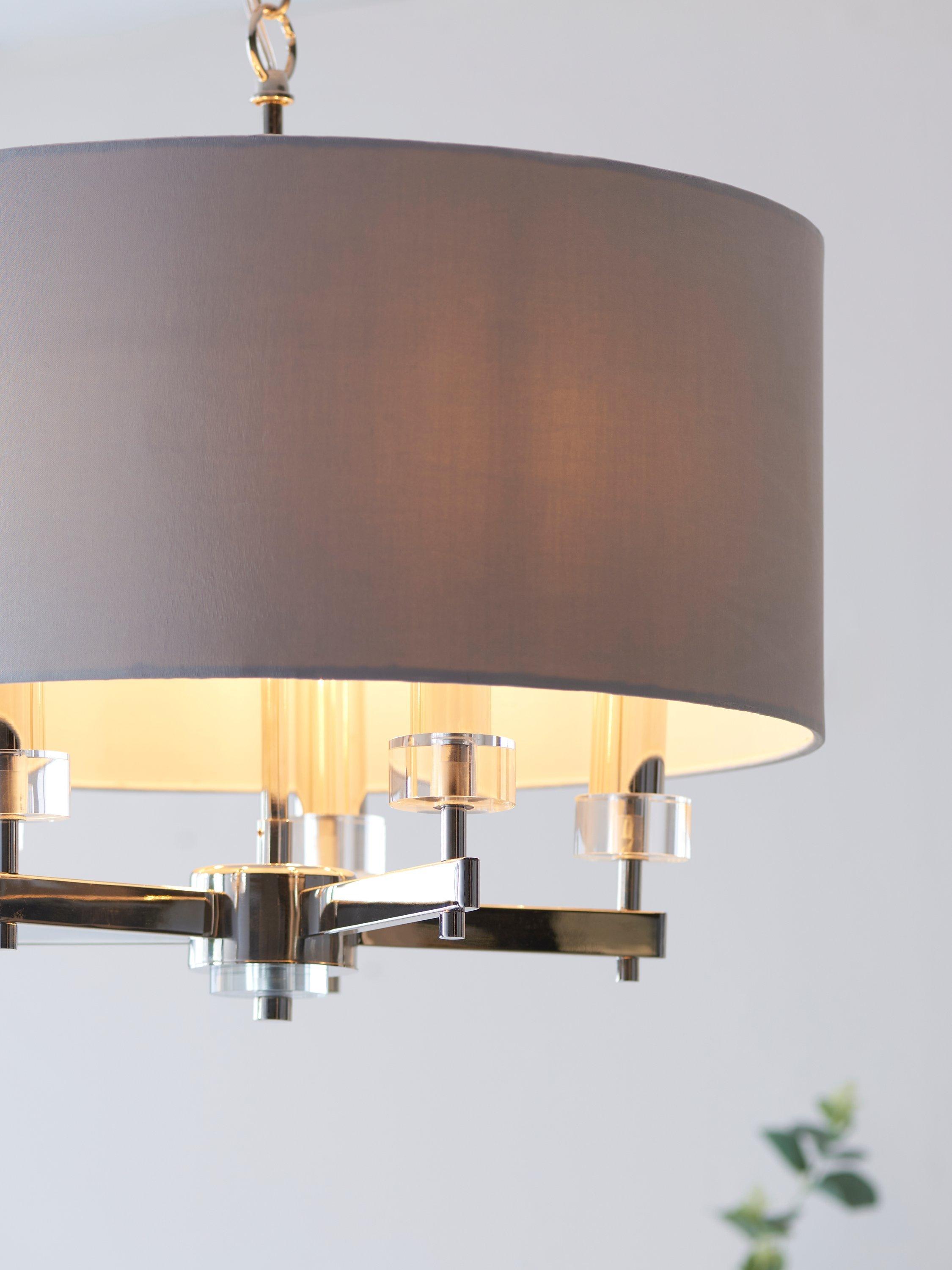 Crisp modern luxury. Cut glass cylinders with polished surfaces and a single drum shade is finished in a cool grey faux silk with a soft sheen (outside and lined).