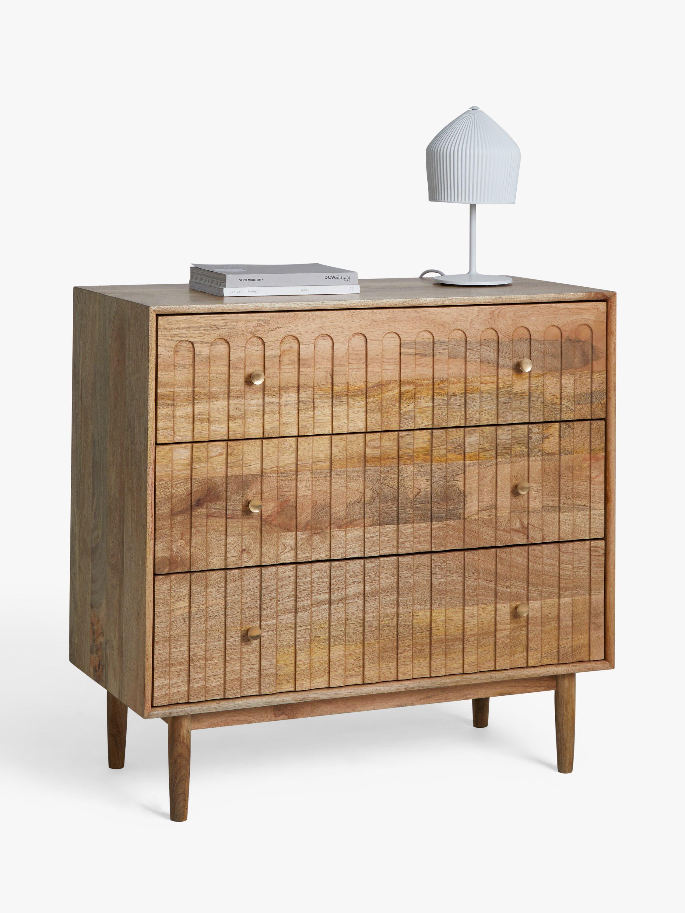 Our designers understood the assignment. Rustic, beautiful furniture, made from high-quality mango wood and MDF and coated in a lacquer so it's built to last. The drawers are inset with a tactile, grooved pattern and are finished with subtle handles to keep the design warm and natural. Spindle-shaped legs offer a design contrast and three drawers provide plenty of storage space. We know, it's one you'll stop to admire every time you see it.