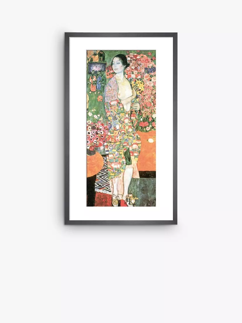 A reproduction print of the 'The Dancer', originally produced by Austrian artist Gustav Klimt between 1917-1918. It features a woman wearing a floral dress depicted against an embellished background that imitates Japanese woodblock printing. Although Klimt has included highly ornate motifs, he has also depicted the bare torso of the woman, grounding the painting in the fine art tradition of the female form.