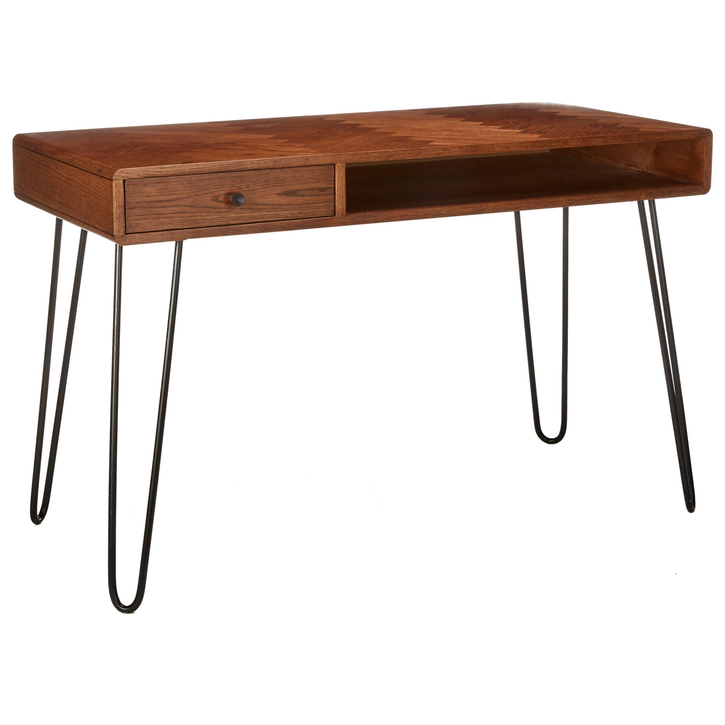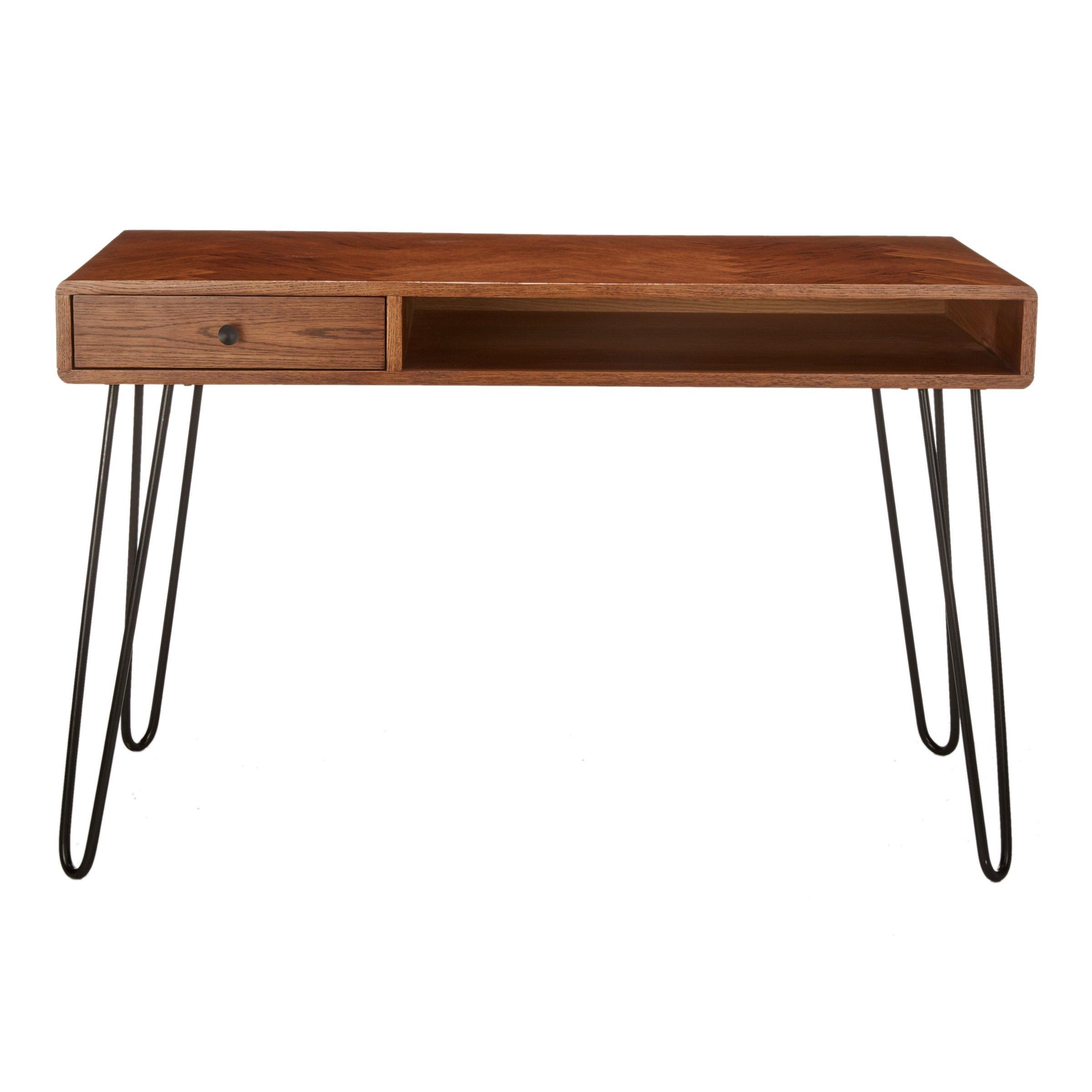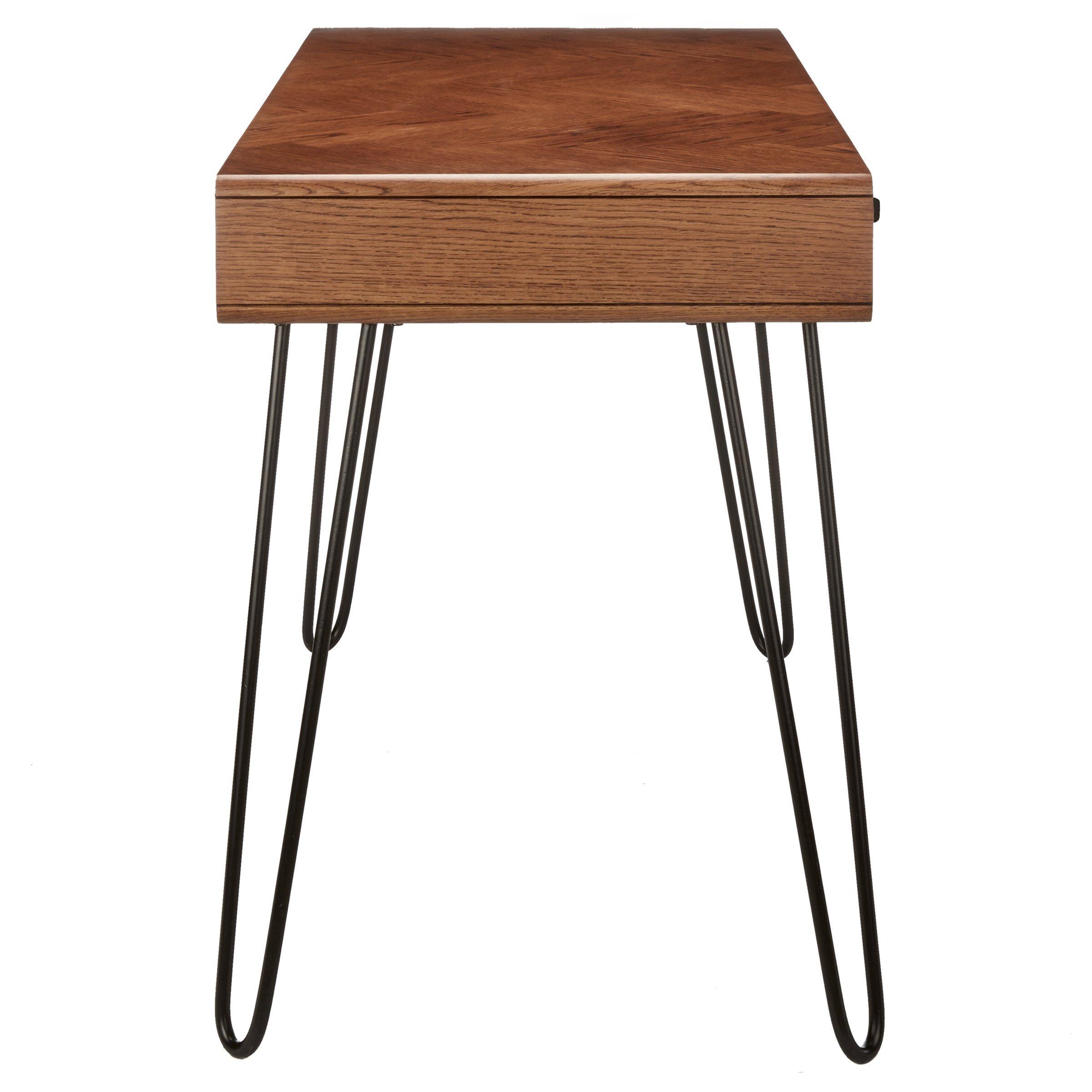 Featuring a useful drawer (H9 x W76 x D54cm) that sits next to a hollow compartment, it's perfect for keeping your home office essentials neatly organised and tidy. Contrasting its classic top texture, it sits on four rounded, splayed metal legs in a hairpin shape, lending a nod to contemporary craftmanship and design.