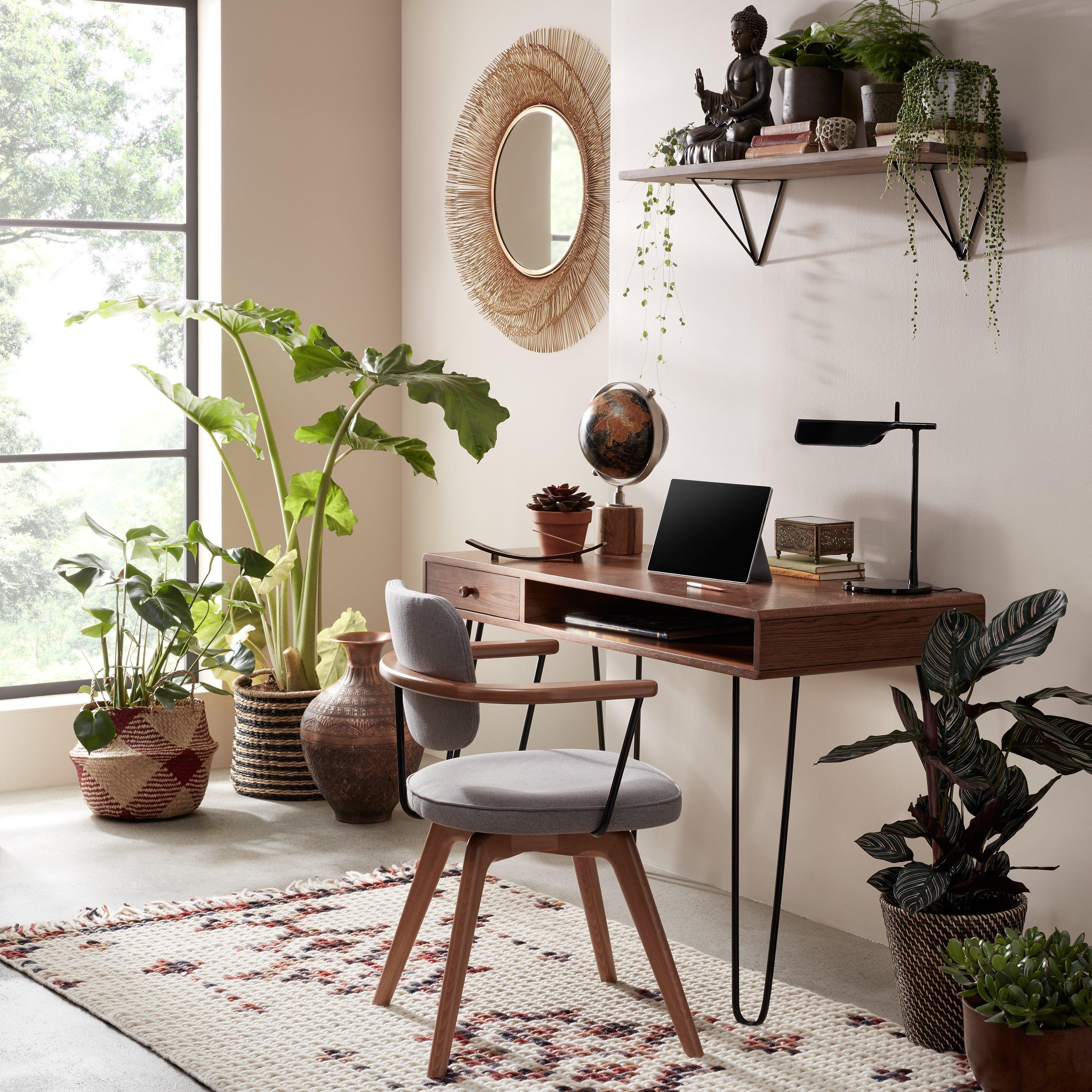 Our freestanding Hairpin Desk combines modern design with sleek functionality. Crafted from oak veneer, its appealingly natural look and feel is enhanced by its parquet finish, which lends a bespoke styling accent.