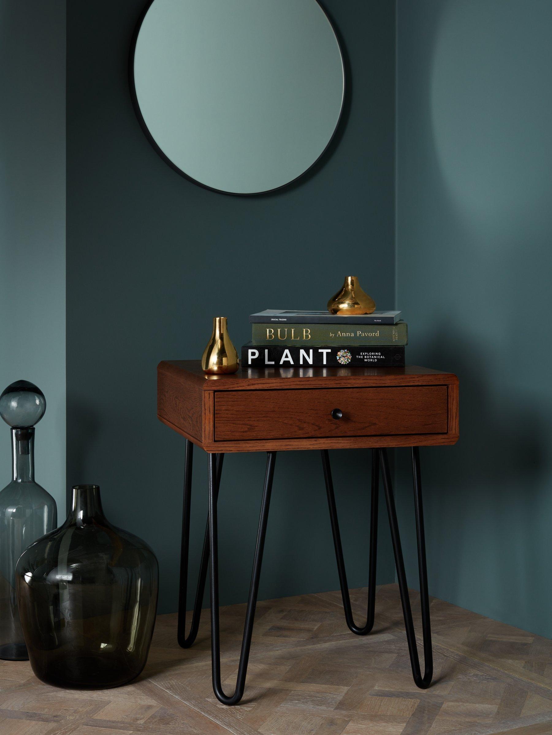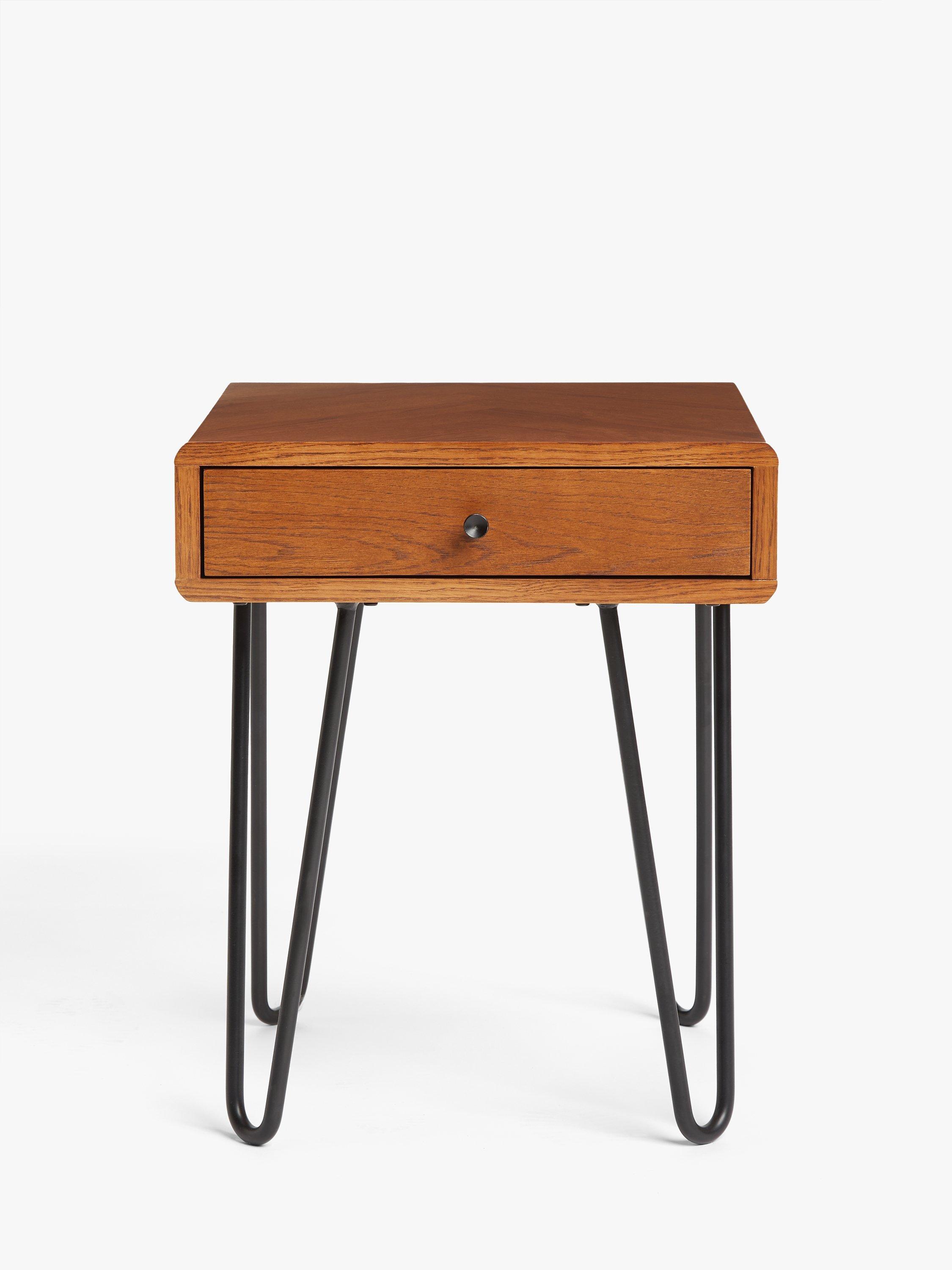 This petite side table offers is designed with a convenient drawer. Its sophisticated design highlights the rich, natural grain of the wood, against the black steel legs. Place it in both bedrooms and living spaces.
