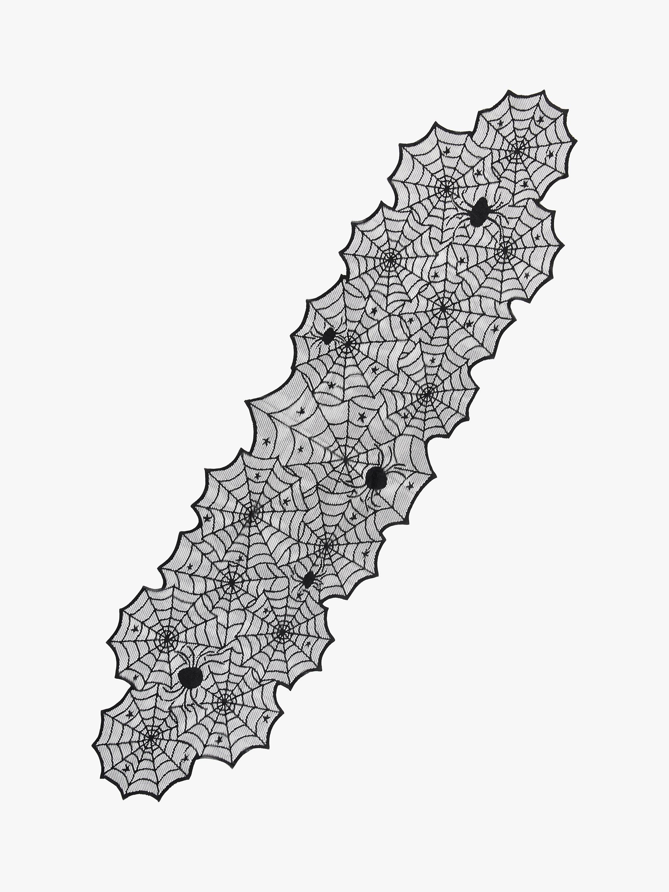 Set a spooky table with this black mesh runner. The shaped web design is dotted with stars and scary spiders.