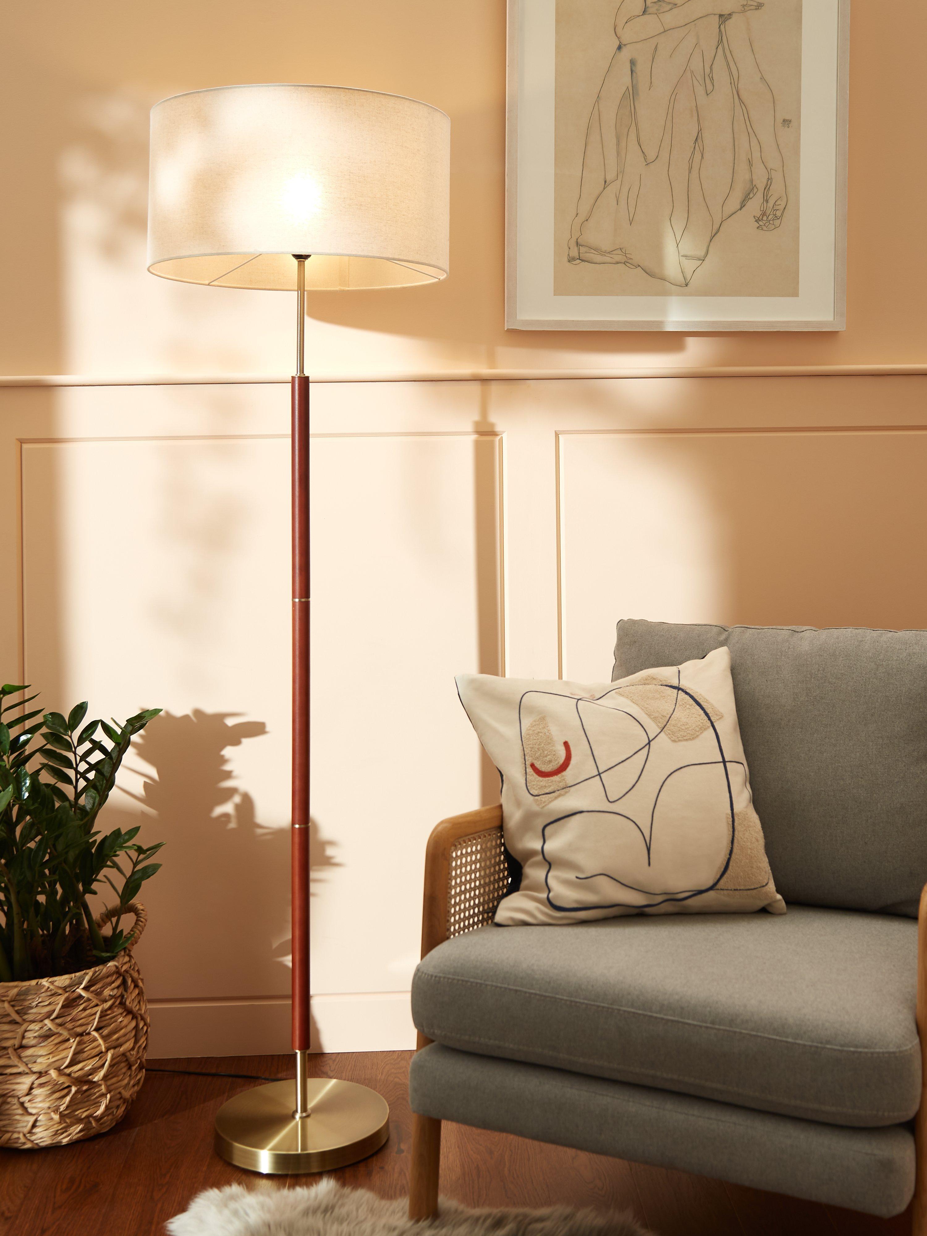 - Frame: Rubberwood in a walnut stain, metal. Lampshade: linen