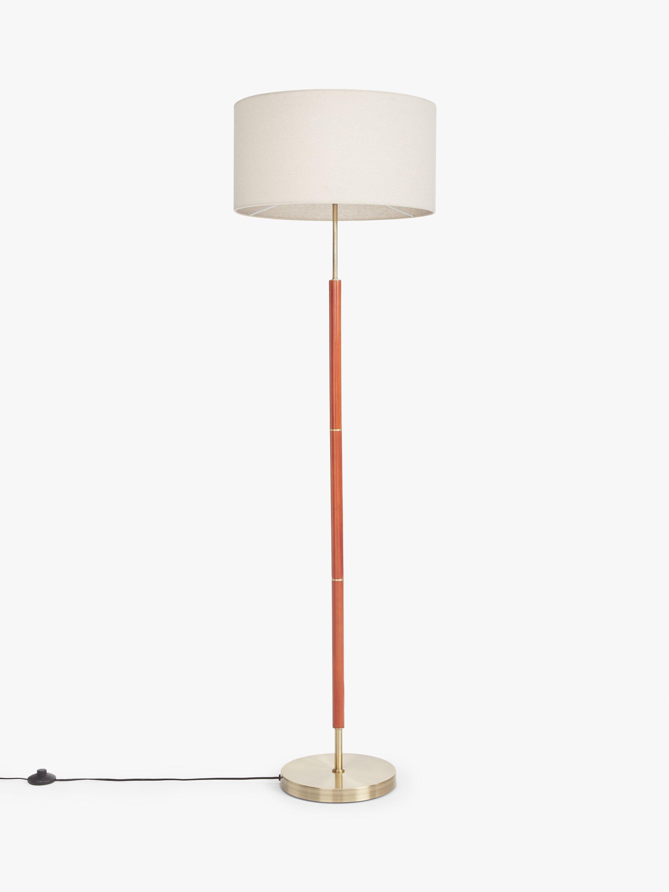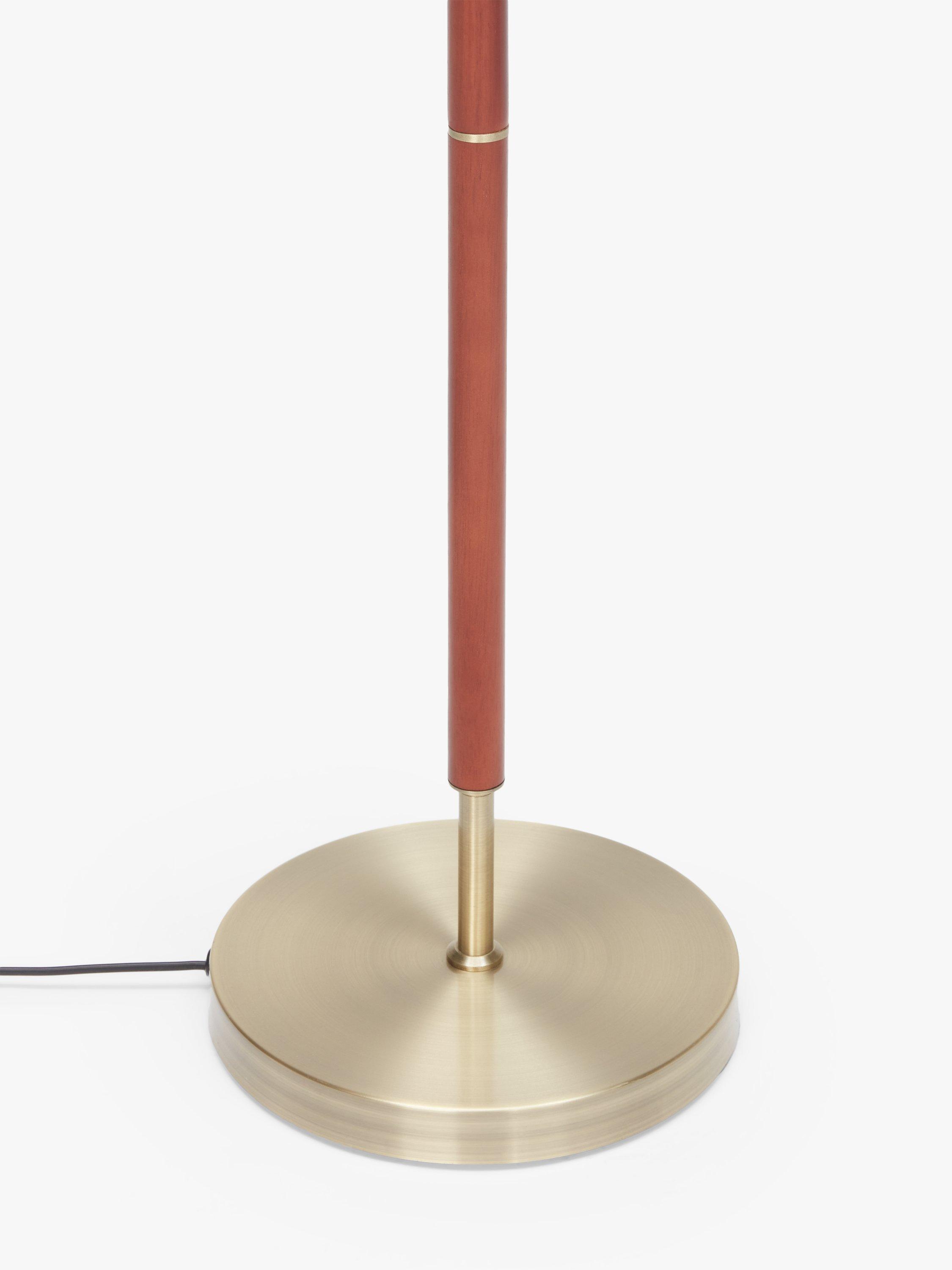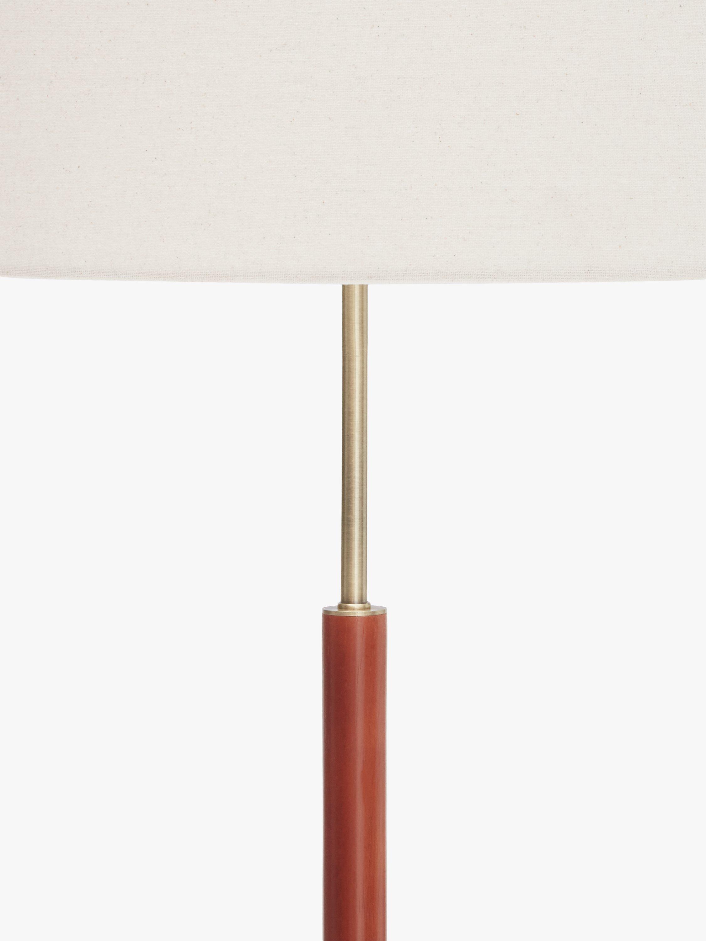 The stand is made from rubberwood, a durable hardwood belonging to the maple family. The base is antique brass, adding the perfect warm contrast to the rich, walnut-stained wood. Up top sits the natural linen shade, providing a distinctively soft quality to the light.