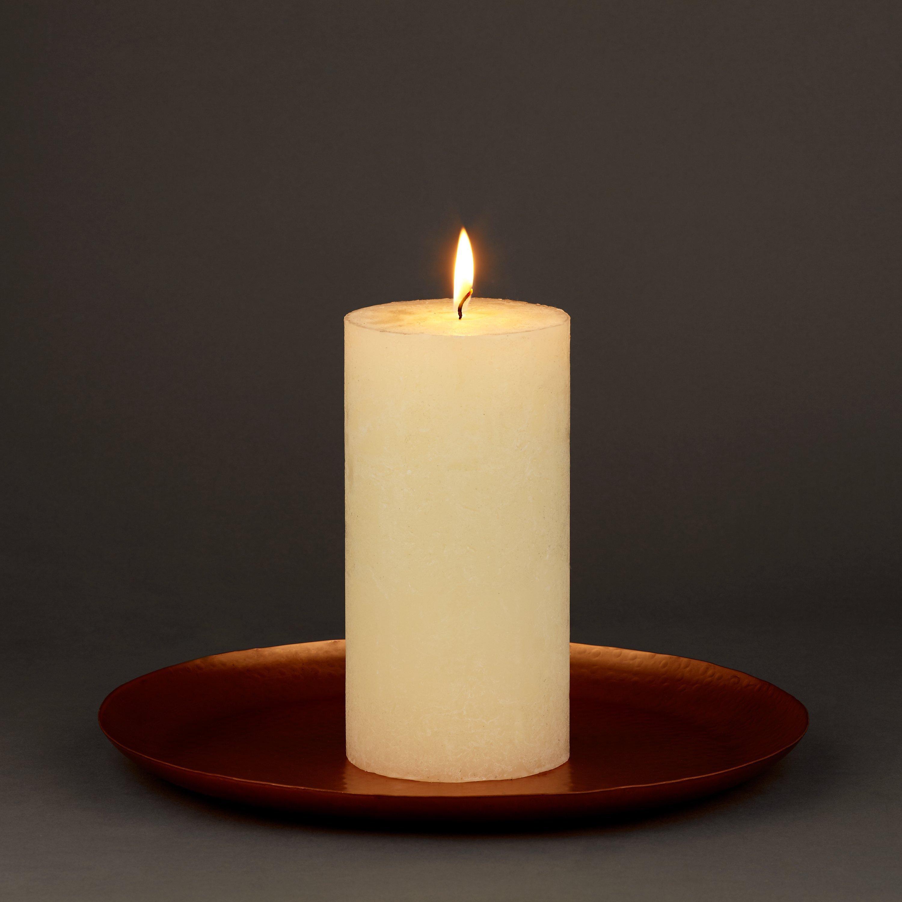 This delicately hammered copper candle plate will add a stylish touch to your candles. It is large enough to fit three pillar candles.