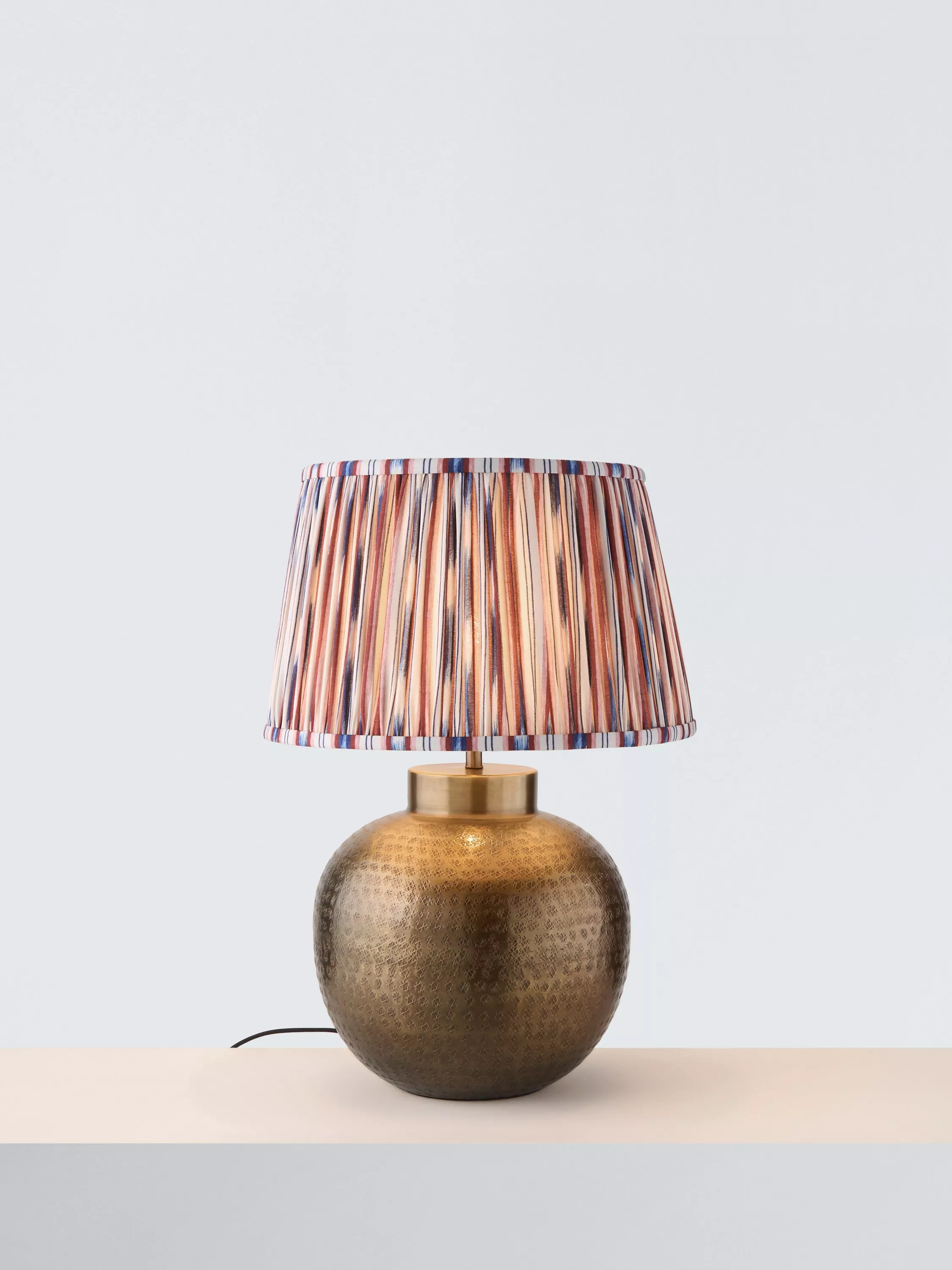 The Hammered Metal Table lamp makes a bold statement in any room. The hammered metal base in a brass finish features rich texture and depth, complemented by a patterned pleated lampshade that softens the light. This lamp celebrates craftsmanship, natural materials and globally inspired design.