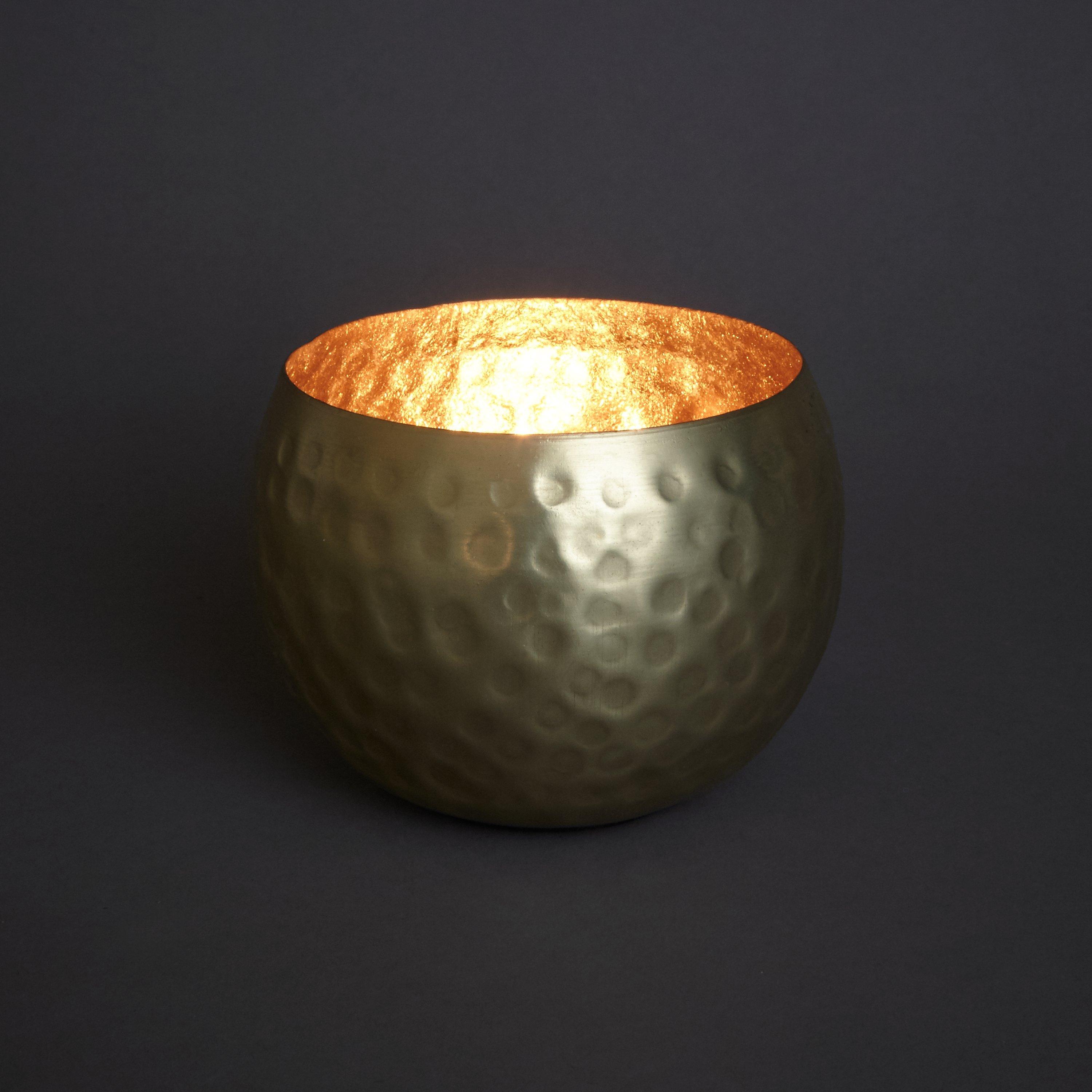 This metal tealight holder has been crafted from a hammered iron sheet, accented with a shimmer of metallic effect inside that reflects light beautifully in any setting. Ideal for creating a warm glow, simply place on your mantelpiece or dining table alike.