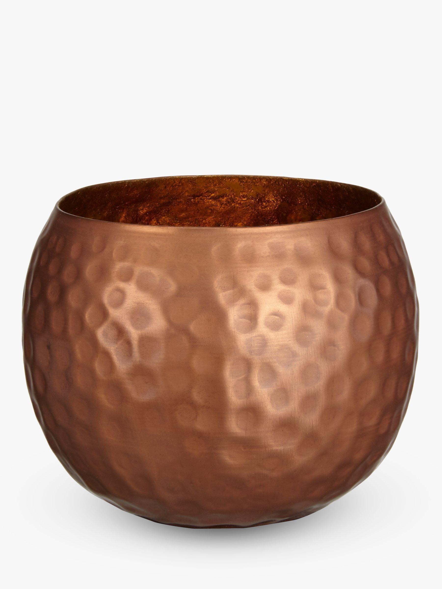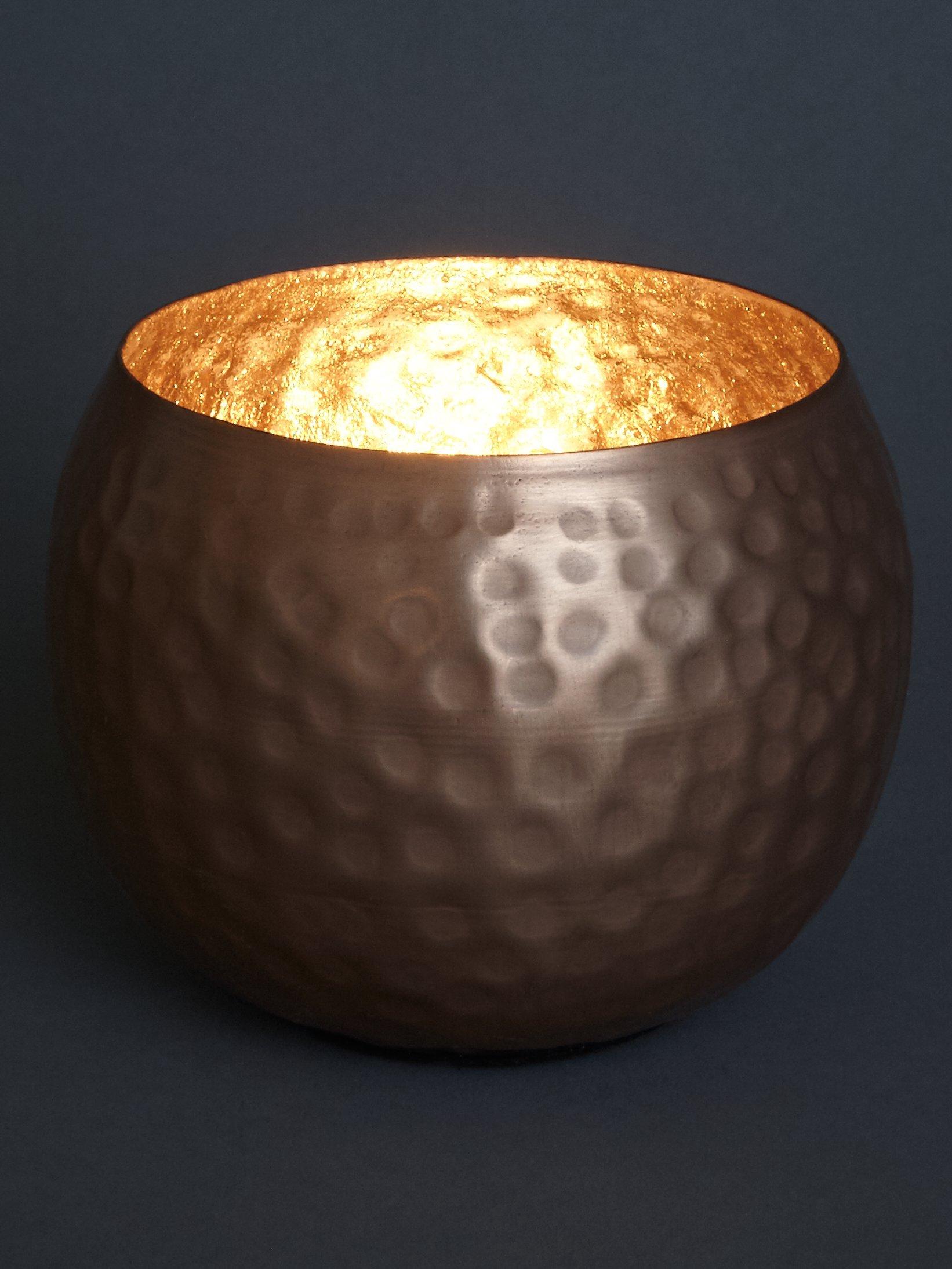 This metal tealight holder has been crafted from a hammered iron sheet, accented with a shimmer of metallic effect inside that reflects light beautifully in any setting. Ideal for creating a warm glow, simply place on your mantelpiece or dining table alike.