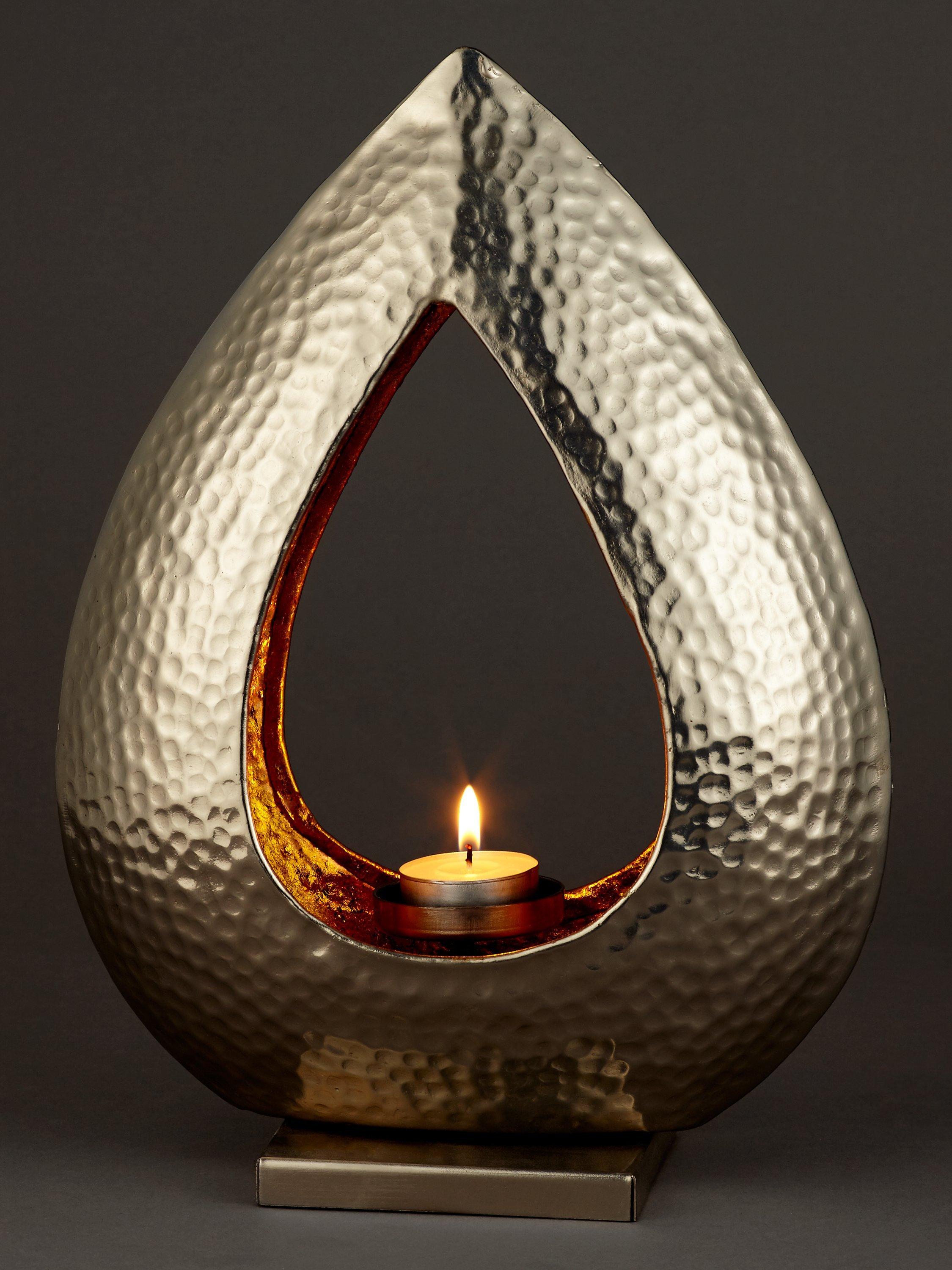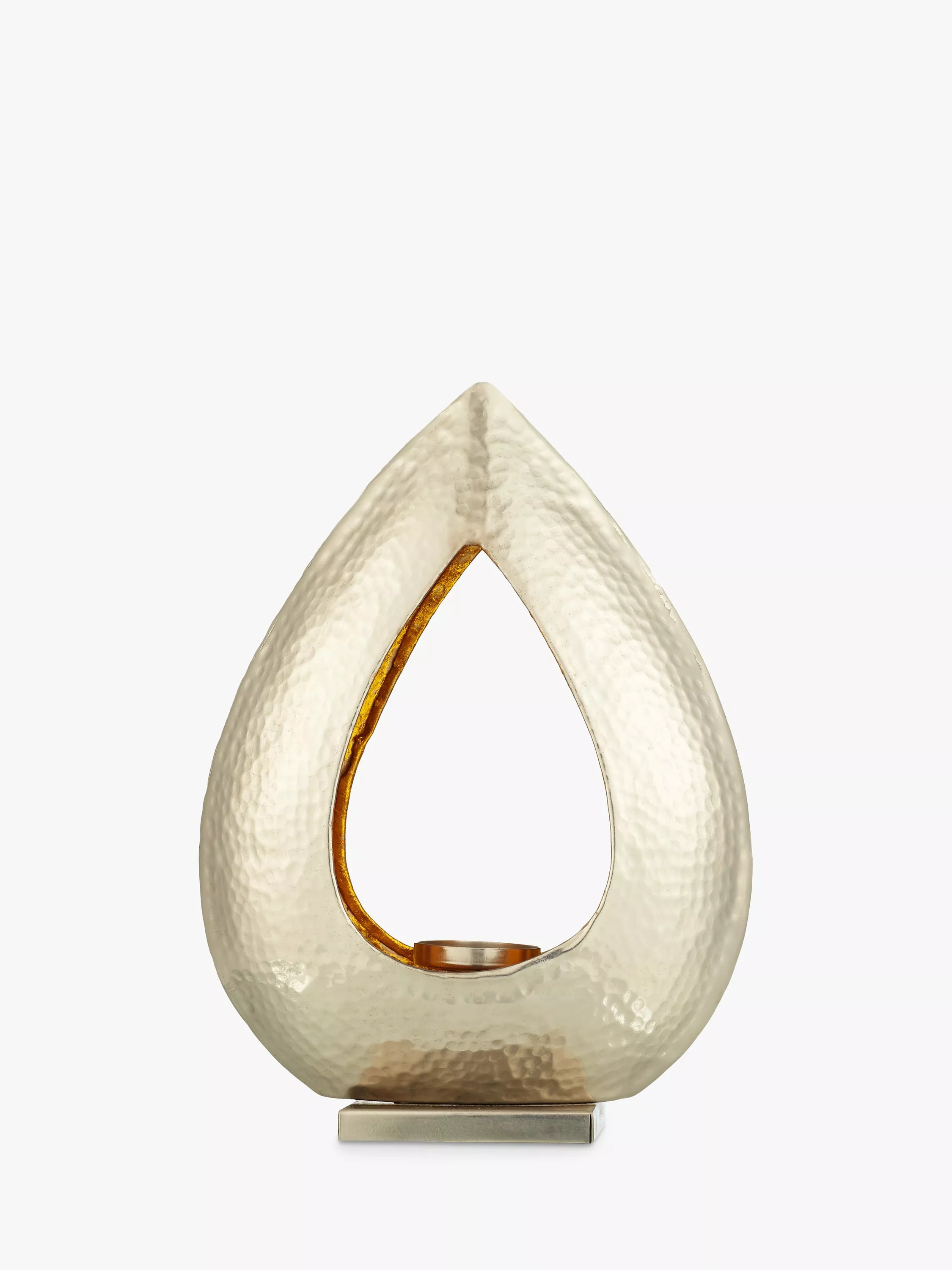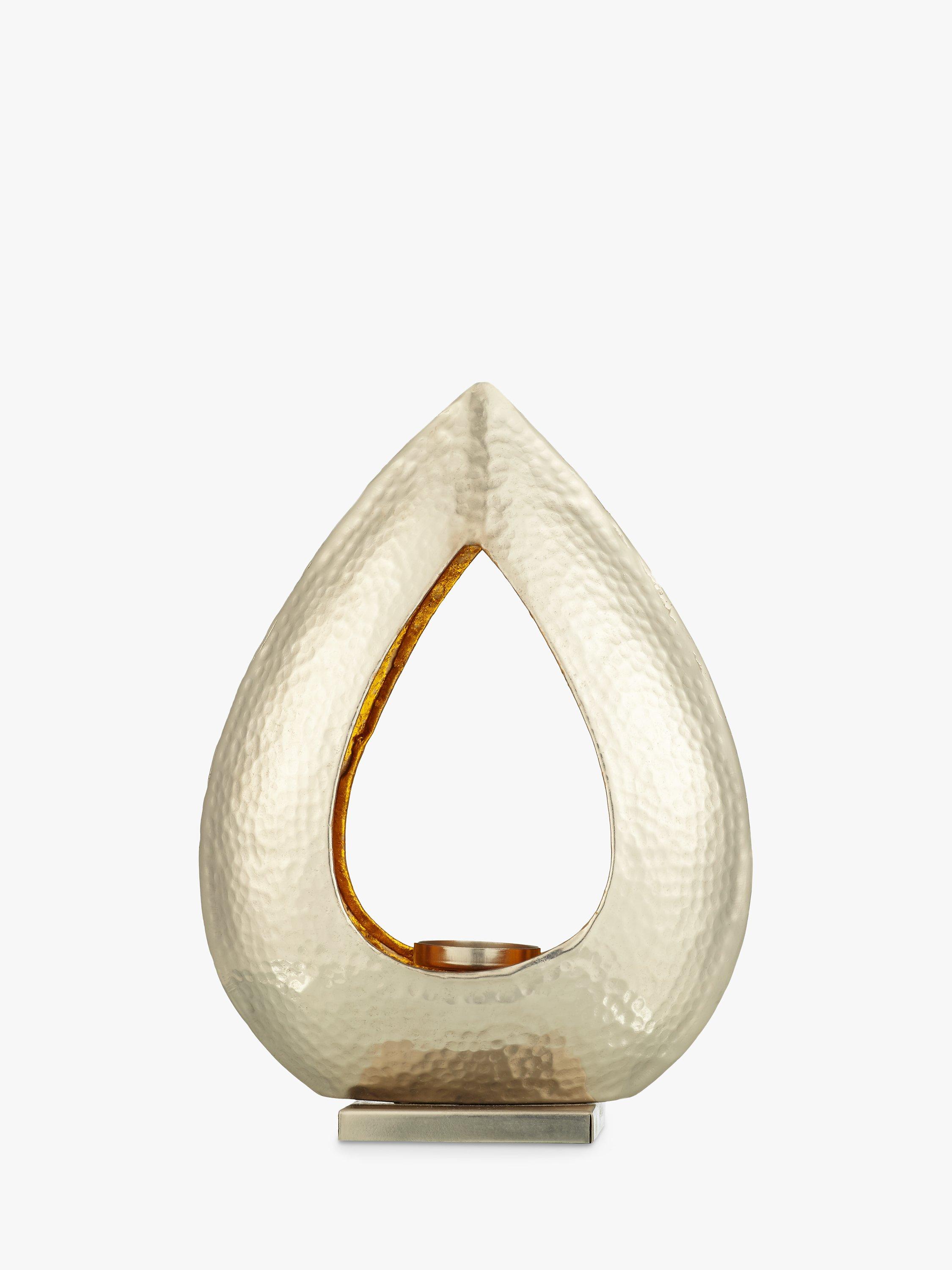 A beautiful statement piece for your home, this elegant holder encloses the tealight in a teardrop-shaped, hammered surround with a gleaming finish - nickel on the outside and gold on the inside.