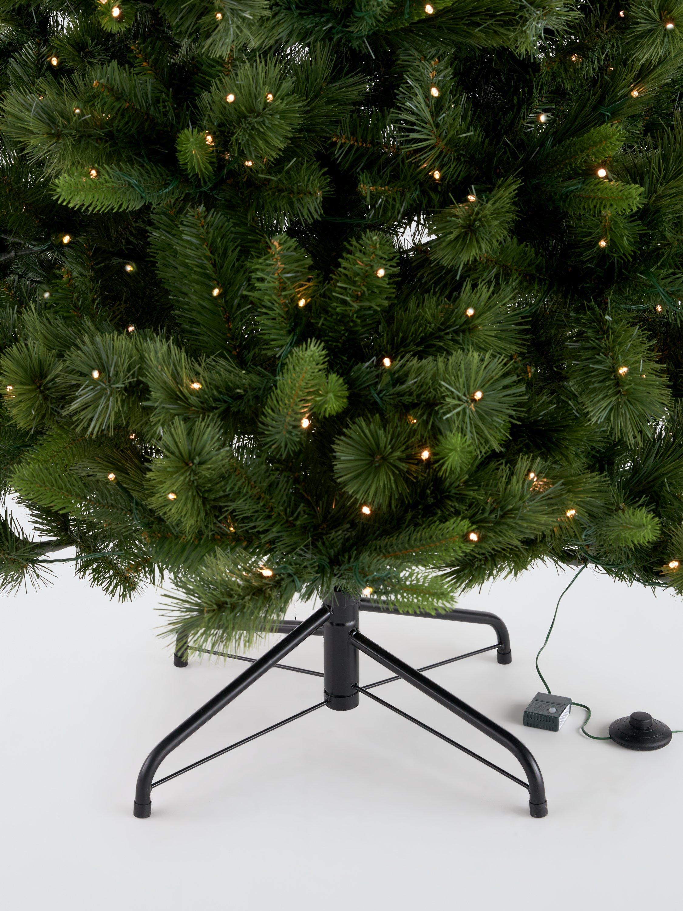 A full, classically conical artificial Christmas tree with a mix of hard and soft needles to give a realistic look and pre-lit with 350 warm white LEDs with 8 different functions. A timer automatically switches the lights on at the same time each day and off after 8 hours and the broad base gives it dramatic impact when set up.