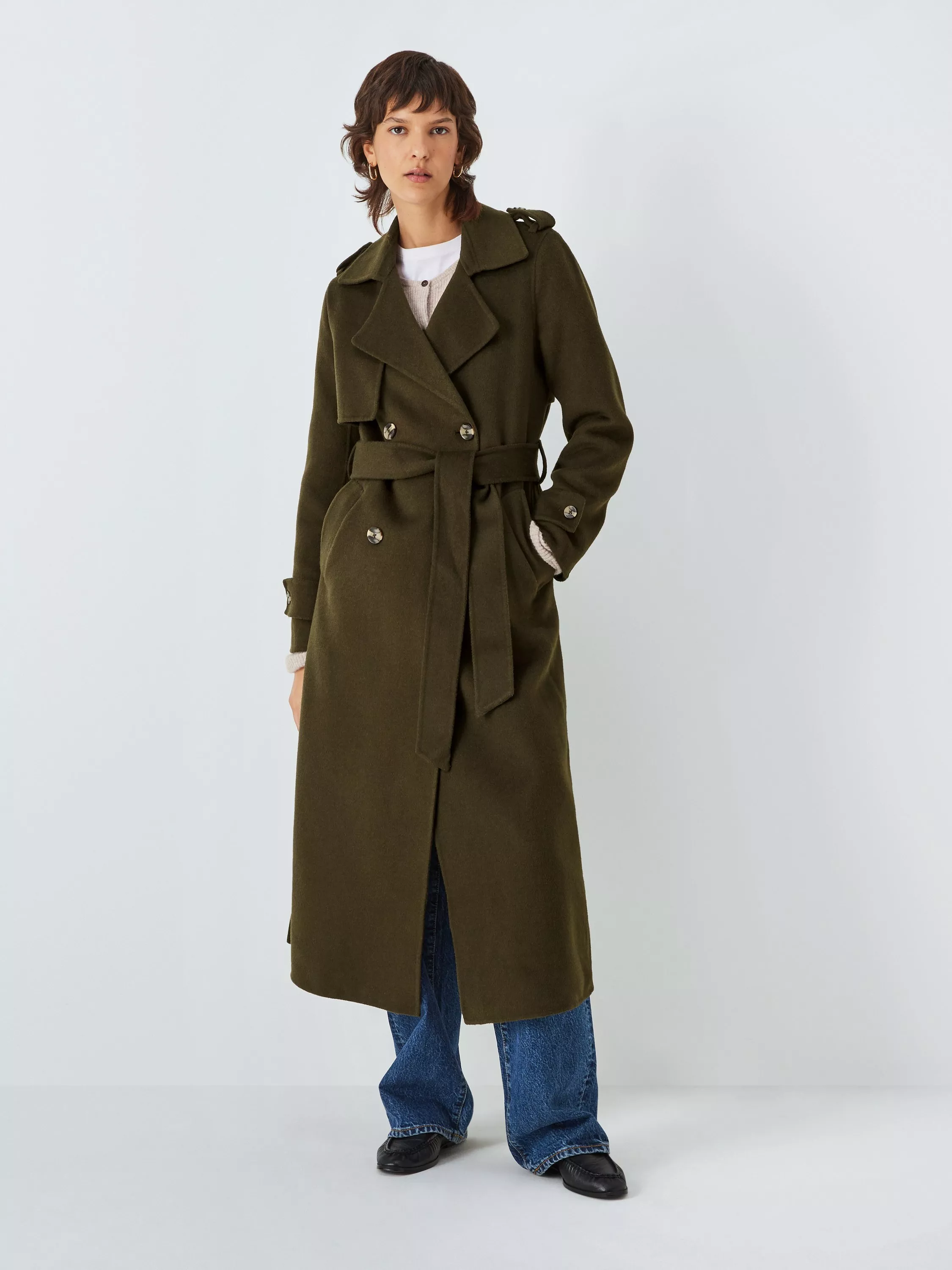 Checked wool trench coat, Double faced belted trench coat, belt fastening to cinch in waist, 30% Wool (wool blend), luxurious wool-blend fabric, will keep you warm in the winter, must have style for AW23, beautiful trend led khaki colourway, buttoned cuf tab sleeves, shoulder epaulettes,back yolk detail, 2 x external side seam/ welt pockets, longer length for added warmth, oversized lapels elegantly frame the face, slip it over your weekend outfits, leaving the belt undone when you want to showcase your lookProduct specification