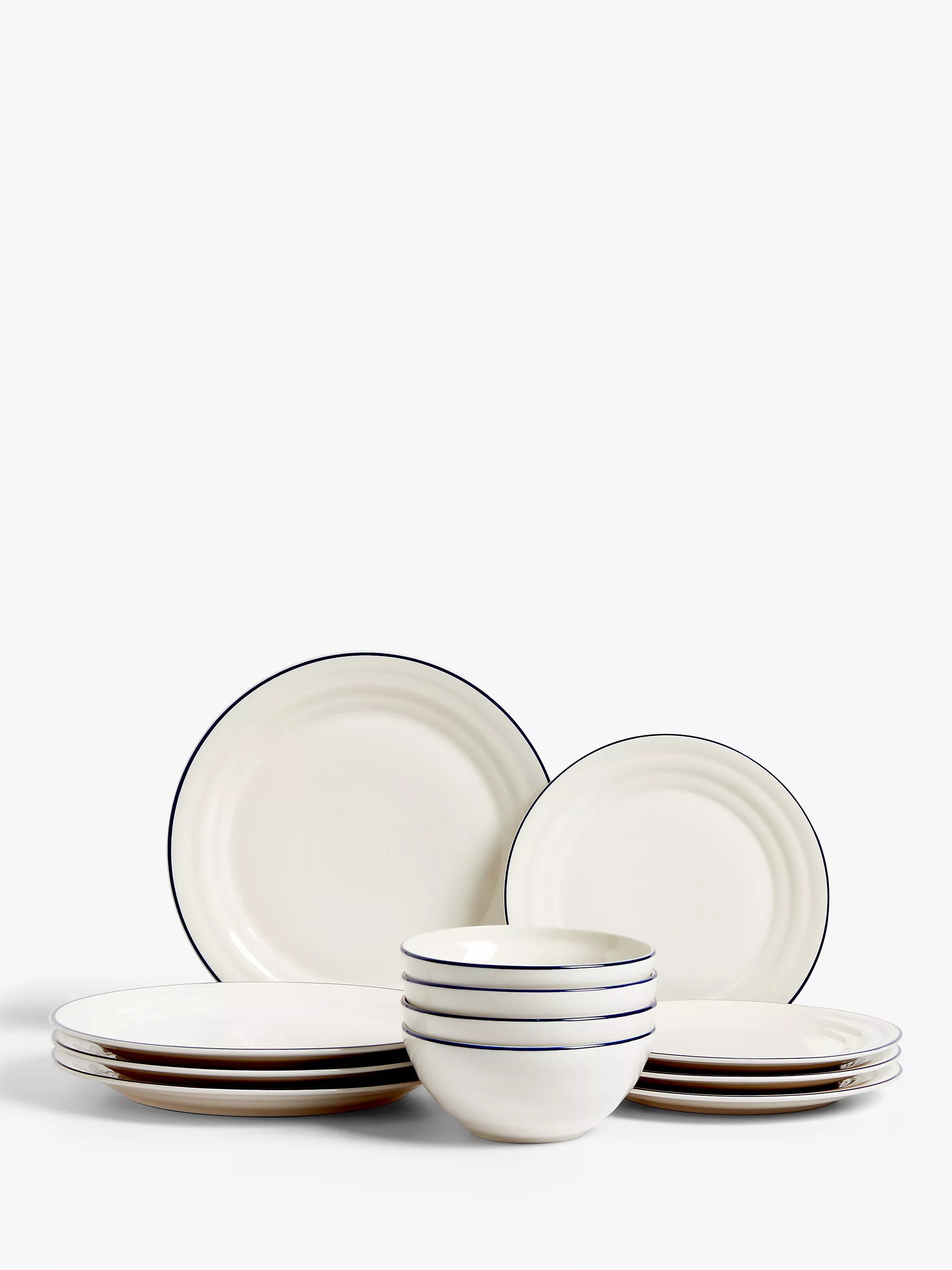 This boxed blue-rimmed set includes four place settings with a dinner plate, cereal bowl and dessert plate for four people. Made of stoneware, the set is both dishwasher and microwave safe.