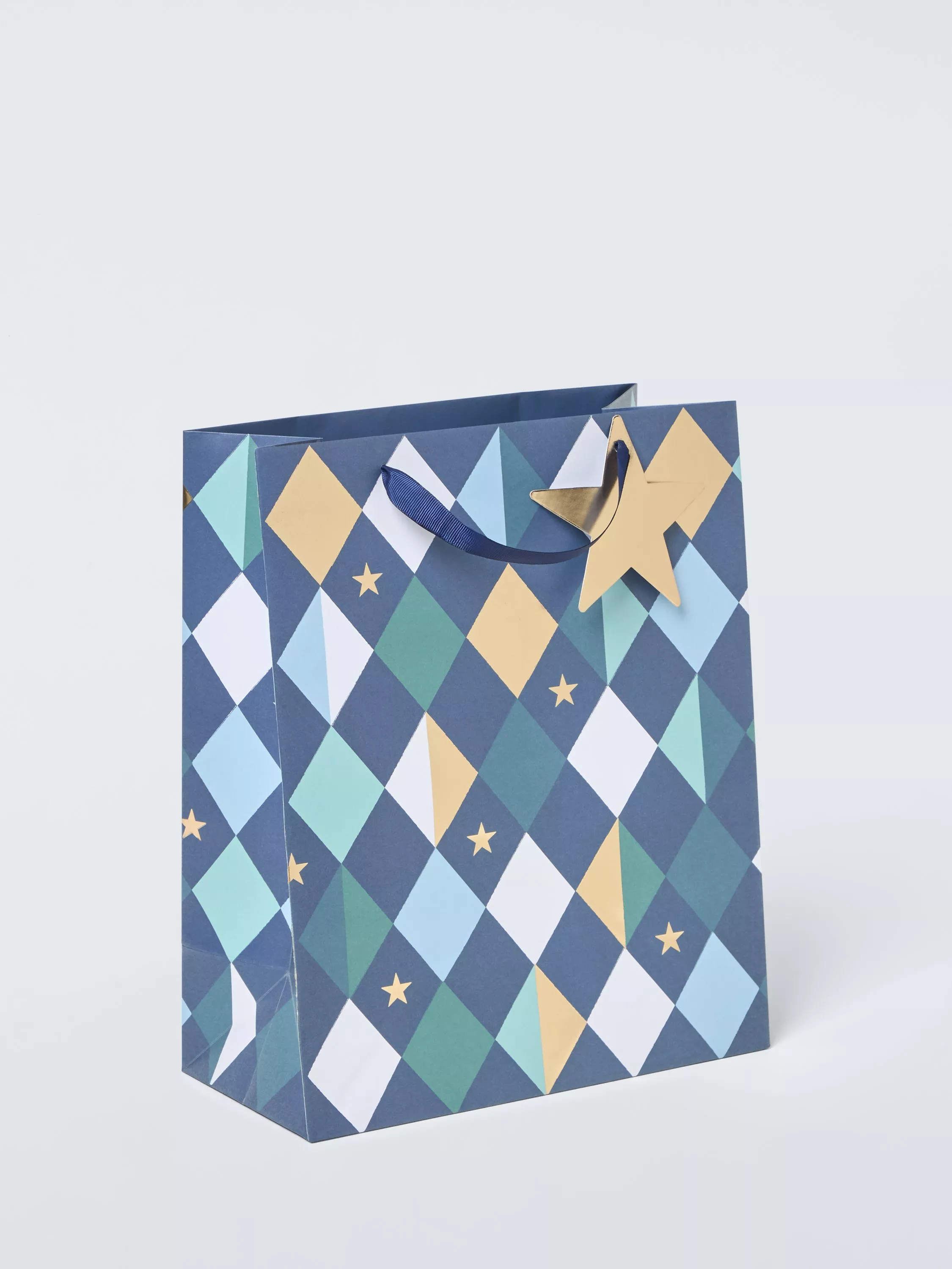 Diamond-patterned gift bag with gold foil accents, gold foil gift tag, and grosgrain ribbon handles.